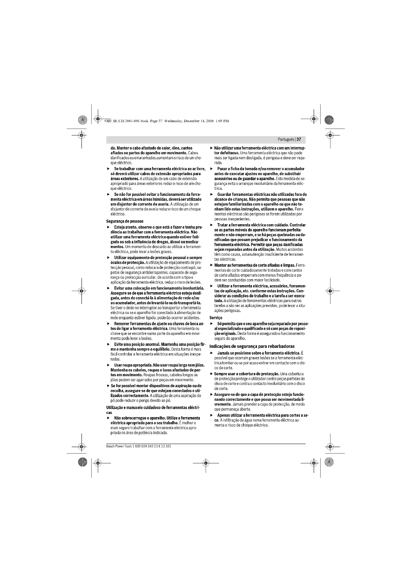 Manter as ferramentas de corte afiadas e limpas. Ferra- mentas de corte cuidadosamente tratadas e com cantos de corte afiados emperram com menos frequência e po- dem ser conduzidas com maior facilidade. Utilizar a ferramenta eléctrica, acessórios, ferramen- tas de aplicação, etc. conforme estas instruções. Con- siderar as condições de trabalho e a tarefa a ser execu- tada. A utilização de ferramentas eléctricas para outras tarefas a não ser as aplicações previstas, pode levar a situ- ações perigosas. Serviço Só permita que o seu aparelho seja reparado por pesso- al especializado e qualificado e só com peças de reposi- ção originais. Desta forma é assegurado o funcionamento seguro do aparelho. Indicações de segurança para rebarbadoras Jamais se posicione sobre a ferramenta eléctrica. É possível que ocorram graves lesões se a ferramenta eléc- trica tombar ou se por acaso entrar em contacto com o dis- co de corte. Sempre usar a cobertura de protecção. Uma cobertura de protecção protege o utilizador contra peças partidas do disco de corte e contra o contacto involuntário com o disco de corte. Assegure-se de que a capa de protecção esteja funcio- nando correctamente e que possa ser movimentada li- vremente. Jamais prender a capa de protecção, de modo que permaneça aberta. Apenas utilizar a ferramenta eléctrica para cortes a se- co. A infiltração de água numa ferramenta eléctrica au- menta o risco de choque eléctrico. OBJ_BUCH-3061-001.book Page 37 Wednesday, December 14, 2016 1:05 PM38 | Português 1 609 92A 342 | (14.12.16) Bosch Power Tools Manter o cabo de rede afastado de ferramentas de tra- balho em rotação. O cabo de rede pode ser cortado ou agarrado. Manter os punhos sempre secos, limpos e livres de óleo e gordura. Punhos gordurosos, são escorregadios e levam à perda de controlo. Jamais remover resíduos de corte, aparas de metal, ou objectos semelhantes, da área de corte, enquanto a ferramenta eléctrica estiver a funcionar. Sempre con- duzir primeiramente o braço da ferramenta para a posição de repouso e desligar a ferramenta. Só conduzir o disco de corte na direcção da peça a ser trabalhada quando a ferramenta estiver ligada. Caso contrário há risco de um contra-golpe, se o disco de corte se enganchar na peça a ser trabalhada. Só utilizar a ferramenta eléctrica quando a superfície de trabalho estiver limpa e livre de aparas de metal, etc. Pequenos pedaços de metal ou outros objectos que entrem em contacto com o disco de corte em rotação, po- dem ser atirados contra o operador com alta velocidade. A peça a ser trabalhada deve sempre ser fixa com fir- meza. Não trabalhar em peças que sejam demasiada- mente pequenas para serem fixas. Caso contrário, a dis- tância entre a sua mão e o disco de corte em rotação não será suficiente. Se o disco de corte emperrar, deverá desligar a ferra- menta eléctrica e aguardar até o disco de corte parar. Jamais tentar puxar o disco de corte para fora do corte enquanto ainda estiver em rotação, caso contrário po- derá ser provocado um contra-golpe. Verificar e eliminar a causa do emperramento. Não travar o disco de corte através de pressão lateral após desligar o aparelho. O disco de corte pode ser dani- ficado, pode se quebrar ou causar um contra-golpe. Não forçar o disco de corte para dentro da peça a ser trabalhada nem exercer pressão demasiada ao utilizar a ferramenta eléctrica. Especialmente deverá evitar que o disco de corte possa emperrar durante trabalhos em cantos, cantos afiados, etc. Se o disco de corte for danificado por uso indevido, podem se formar rachaduras que podem levar a ruptura sem aviso prévio. Usar um avental. Assegure-se de que nenhuma pessoa corra risco devido a voo de faúlhas. Remover os mate- riais inflamáveis das proximidades. Ao lixar é produzido voo de faúlhas. Só utilizar a cortadora de metal para materiais indica- dos no capítulo de utilização conforme as disposições. Caso contrário é possível que a cortadora de metal seja so- brecarregada. Não utilizar discos de corte danificados, descentrados ou a vibrar. Discos de corte danificados causam uma fric- ção elevada, podem emperrar e causar um contra-golpe. Utilize sempre discos de corte com o tamanho certo e com orifício de admissão apropriado (p. ex. em forma de losango ou redondo). Discos de corte que não são apropriados para as peças de montagem da cortadora de metal, funcionam desequilibradamente e levam à perda de controlo. Não utilizar lâminas de serra de correias nem dentadas. Estas ferramentas de trabalho causam frequentemente um contra-golpe ou a perda de controlo sobre a ferramenta eléctrica. Observe as instruções de serviço do fabricante dos dis- cos de corte, a respeito da montagem e da utilização do disco de corte. Discos de corte não apropriados podem causar lesões, assim como bloquear, quebrar ou levar a contra-golpes. Não utilizar acessórios, que não foram especialmente previstos e recomendados pelo fabricante para serem utilizados com esta ferramenta eléctrica. O facto de po- der fixar o acessório a esta ferramenta eléctrica, não ga- rante uma aplicação segura. Jamais tocar no disco de corte após terminar o traba- lho, antes que possa esfriar. O disco de corte torna-se ex- tremamente quente durante o trabalho. Controlar o cabo em intervalos regulares e permitir que um cabo danificado seja reparado por um serviço pós- venda autorizado para ferramentas eléctricas Bosch. Substituir cabos de extensão danificados. Desta forma é assegurada a segurança da ferramenta eléctrica. Quando não estiver sendo utilizada, a ferramenta eléc- trica deverá ser guardada num lugar seguro. Ela deve ser guardada num local seco e que possa ser trancado. Assim evita-se que a ferramenta eléctrica sofra danos de- vido ao armazenamento ou que seja operada por pessoas inexperientes. Fixar a peça a ser trabalhada. Uma peça a ser trabalha