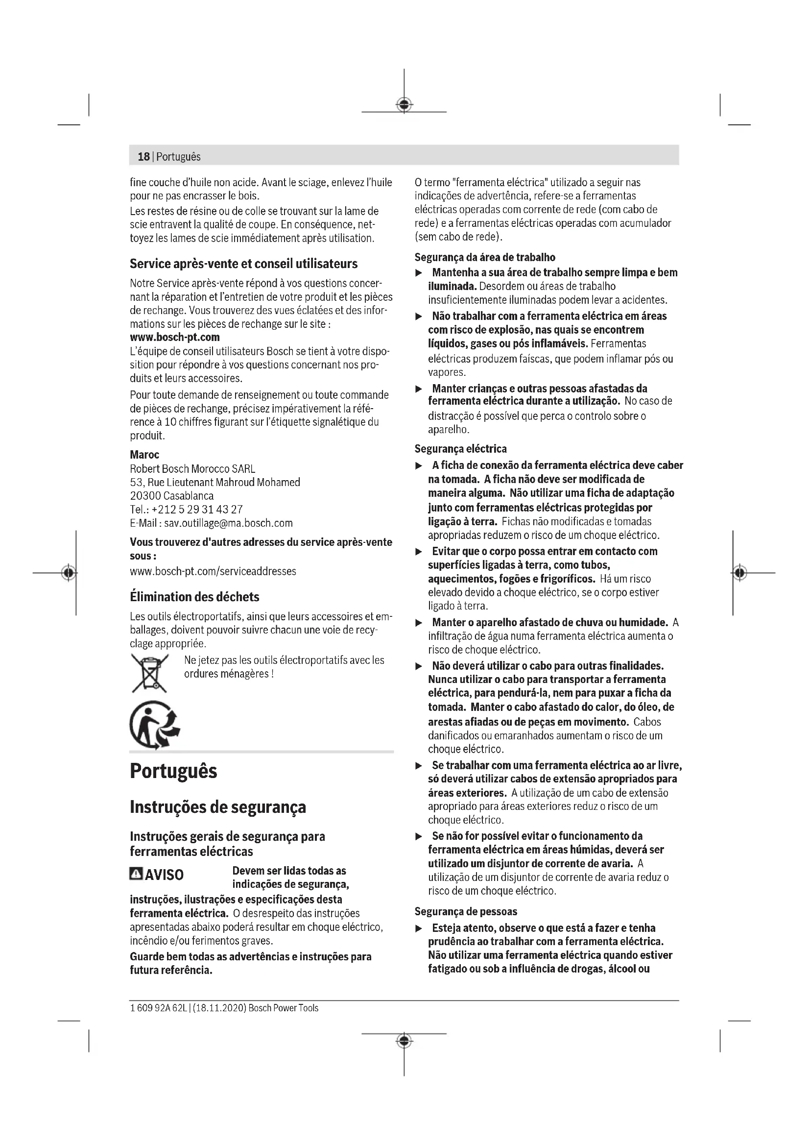 Le marquage de coupe 0° (9) indique la position de la lame de scie lors d'une coupe à angle droit. Le marquage de coupe 45° (8)indique la posi- tion de la lame de scie lors d'une coupe à angle de 45°. Afin d’obtenir une coupe de grande précision dimension- nelle, positionnez la scie cir- culaire conformément aux indications sur la figure sur la pièce à travailler. Le mieux est d’effectuer une coupe d’essai. Mise en marche u Tenez compte de la tension du réseau! La tension de la source de courant doit correspondre aux indica- tions se trouvant sur la plaque signalétique de l’outil électroportatif. Les outils électroportatifs marqués 230V peuvent également fonctionner sur 220V. Mise en marche/arrêt u Assurez-vous de pouvoir actionner l’interrupteur Marche/Arrêt sans avoir à relâcher la poignée. Pour démarrer l'outil électroportatif, actionnez d’abord l'in- terrupteur de déverrouillage (2) et appuyez ensuite sur l’in- terrupteur Marche/Arrêt (1) en le maintenant enfoncé. Pour arrêter l'outil électroportatif, l’interrupteur Marche/Ar- rêt (1). Remarque : Pour des raisons de sécurité, il n’est pas pos- sible de verrouiller l’interrupteur Marche/Arrêt (1), qui doit rester constamment enfoncé pendant le travail de sciage. Instructions d’utilisation u Débranchez le câble d’alimentation de la prise avant d’effectuer des travaux quels qu’il soient sur l’outil électroportatif. La largeur de coupe varie selon la lame de scie utilisée. Protégez les lames contre les chocs et les coups. Guider l’outil électroportatif de façon régulière et en effec- tuant une avance modérée dans le sens de la coupe. Une avance trop forte réduit considérablement la durée de vie des outils électroportatifs et peut endommager l’outil élec- troportatif. La puissance et la qualité de la coupe dépendent dans une large mesure de l’état et de la forme des dents de la lame de scie. En conséquence, n’utilisez que des lames de scie aigui- sées et appropriées aux matériaux à travailler. Sciage de bois Le bon choix de la lame de scie dépend de la nature et de la qualité du bois et du type de coupe à savoir longitudinale ou transversale. La découpe longitudinale de l’épicéa entraîne la formation de longs copeaux en spirale. Les poussières de hêtre et de chêne étant particulièrement toxiques, il est recommandé d'utiliser systématiquement un système d'aspiration. Sciage avec butée parallèle (voir figure C) La butée parallèle (10) permet des coupes précises le long du bord de la pièce ou la découpe de bandes régulières. Desserrez les vis papillon (7) et faites passer la graduation de la butée parallèle (10) à travers le guidage de la plaque de base (12). Ajustez la largeur de coupe souhaitée sur l’échelle graduée se trouvant sur le marquage de coupe (9) ou (8), voir rubrique «Marquages de la ligne de coupe». Resserrez bien la vis papillon (7). Sciage avec butée auxiliaire (voir figure D) Pour travailler des pièces de dimensions importantes ou pour couper des bords droits, il est possible de monter une planche ou une barre comme butée auxiliaire sur la pièce à travailler et de guider la scie circulaire avec la plaque de base le long de la butée auxiliaire. Entretien et Service après‑vente Nettoyage et entretien u Débranchez le câble d’alimentation de la prise avant d’effectuer des travaux quels qu’il soient sur l’outil électroportatif. u Tenez toujours propres l’outil électroportatif ainsi que les fentes de ventilation afin d’obtenir un travail im- peccable et sûr. Dans le cas où il s’avère nécessaire de remplacer le câble d’alimentation, confiez le remplacement à Bosch ou une sta- tion de Service Après-Vente agréée pour outillage Bosch afin de ne pas compromettre la sécurité. Le capot de protection à mouvement pendulaire doit tou- jours pouvoir bouger librement et fermer automatiquement. Veillez pour cela à ce que le pourtour du capot de protection à mouvement pendulaire reste propre. Enlevez la poussière et les copeaux à l’aide d’un pinceau. Les lames de scie sans revêtement de protection peuvent être protégées des risques de corrosion en appliquant une Bosch Power Tools 1 609 92A 62L | (18.11.2020)18 | Português fine couche d’huile non acide. Avant le sciage, enlevez l’huile pour ne pas encrasser le bois. Les restes de résine ou de colle se trouvant sur la lame de scie entravent la qualité de coupe. En conséquence, net- toyez les lames de scie immédiatement après utilisation. Service après-vente et conseil utilisateurs Notre Service après-vente répond à vos questions concer- nant la réparation et l’entretien de votre produit et les pièces de rechange. Vous trouverez des vues éclatées et des infor- mations sur les pièces de rechange sur le site : www.bosch-pt.com L’équipe de conseil utilisateurs Bosch se tient à votre dispo- sition pour répondre à vos questions concernant nos pro- duits et leurs accessoires. Pour toute demande de renseignement ou toute commande de pièces de rechange, précisez impérativement la réfé- rence à 10chiffres figurant sur l’étiquette signalétique du produit. Maroc Robert Bosch Morocco SARL 53, Rue Lieutenant Mahroud Mohamed 20300 Casablanca Tel.: +212529314327 E-Mail : sav.outillage@ma.bosch.com Vous trouverez d'autres adresses du service après-vente sous: www.bosch-pt.com/serviceaddresses Élimination des déchets Les outils électroportatifs, ainsi que leurs accessoires et em- ballages, doivent pouvoir suivre chacun une voie de recy- clage appropriée. Ne jetez pas les outils électroportatifs avec les ordures ménagères! Português Instruções de segurança Instruções gerais de segurança para ferramentas eléctricas AVISO Devem ser lidas todas as indicações de segurança, instruções, ilustrações e especificações desta ferramenta eléctrica. O desrespeito das instruções aprese