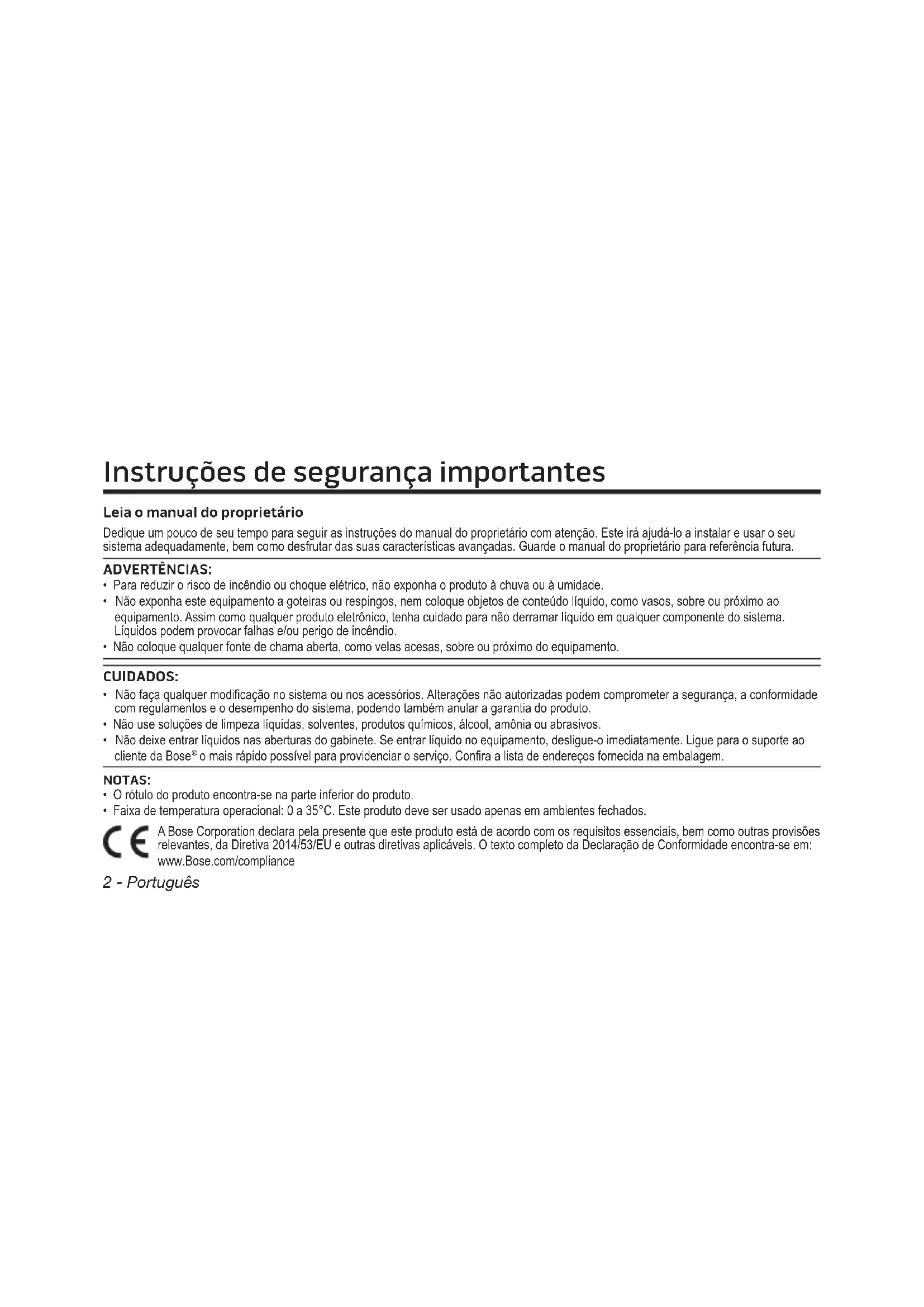 są zastrzeżonymi znakami towarowymi firmy Bluetooth SIG, Inc., wykorzystanymi przez firmę Bose Corporation na mocy licencji.2 - Português Leia o manual do proprietário Dedique um pouco de seu tempo para seguir as instruções do manual do proprietário com atenção. Este irá ajudá-lo a instalar e usar o seu sistema adequadamente, bem como desfrutar das suas características avançadas. Guarde o manual do proprietário para referência futura. ADVERTÊNCIAS: