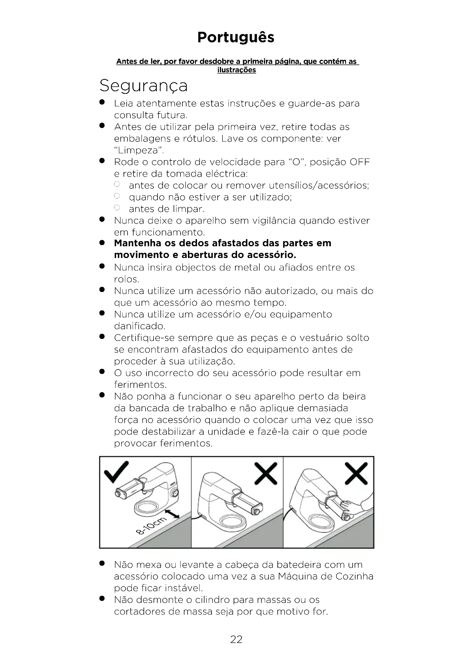 Não ponha a funcionar o seu aparelho perto da beira da bancada de trabalho e não aplique demasiada força no acessório quando o colocar uma vez que isso pode destabilizar a unidade e fazê-la cair o que pode provocar ferimentos. 8-10cm