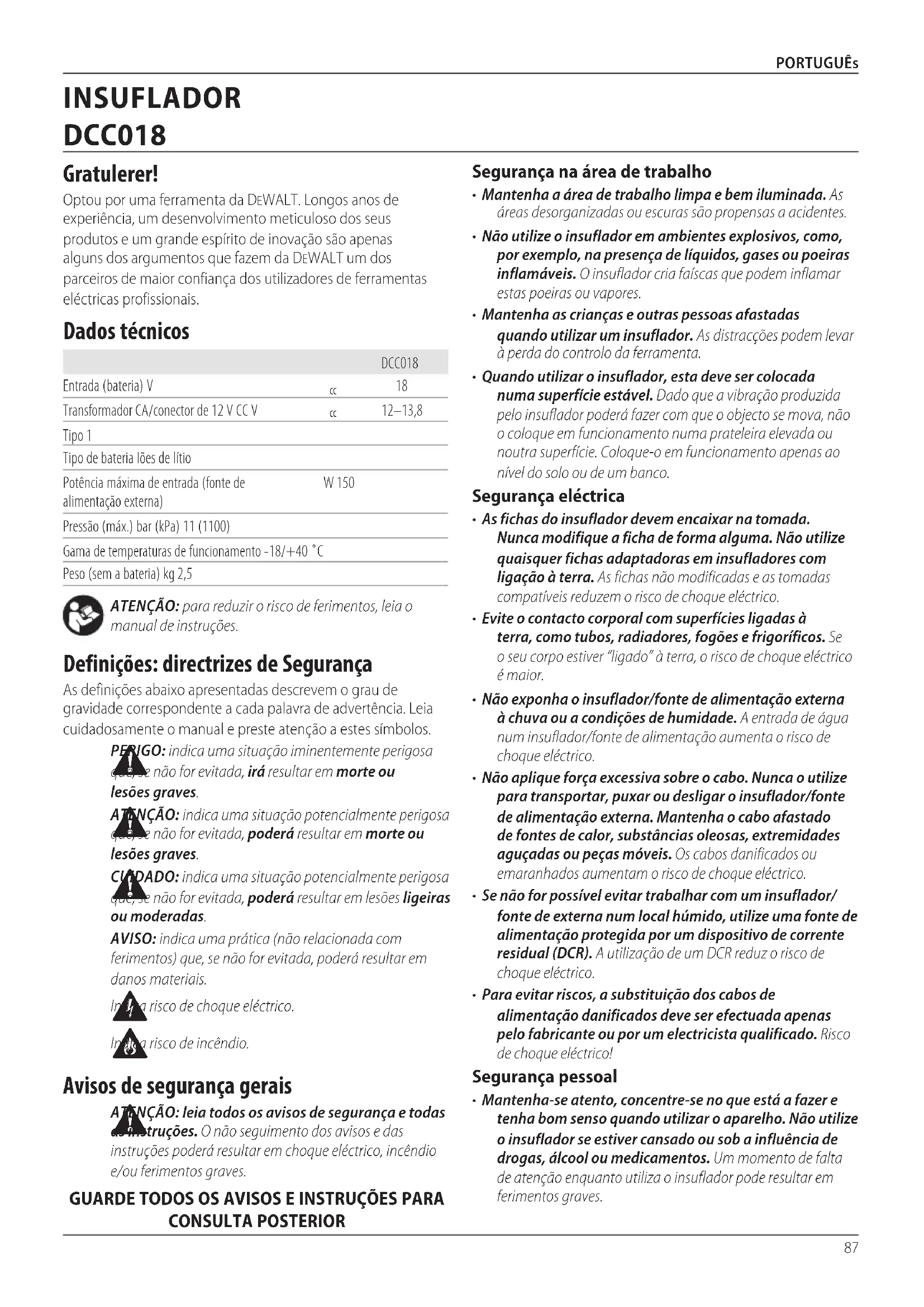 ATENÇÃO: leia todos os avisos de segurança e todas as instruções. O não seguimento dos avisos e das instruções poderá resultar em choque eléctrico, incêndio e/ou ferimentosgraves. GUARDE TODOS OS AVISOS E INSTRUÇÕES PARA CONSULTA POSTERIOR INSUFLADOR DCC018 Português (traduzido das instruções originais)88 PORTUGUês