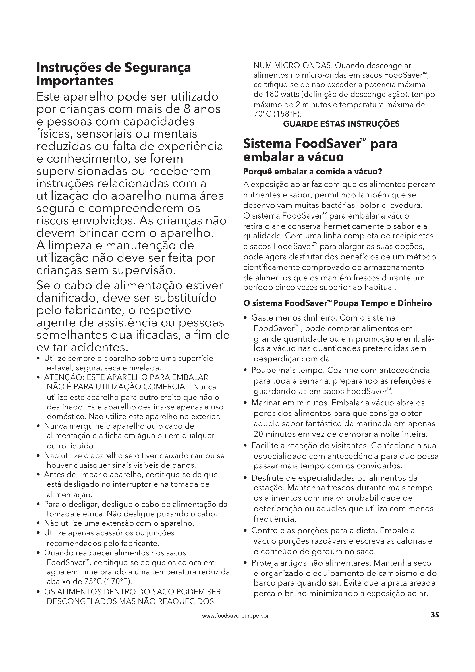 sobre os pés de armazenamento numa posição vertical. Guia de Armazenamento, Dicas e Sugestões Embalar a vácuo e segurança alimentar O processo de embalar a vácuo prolonga a validade dos alimentos através da remoção da maior parte do ar do recipiente selado, reduzindo assim a oxidação, que afeta o valor nutricional, o sabor e a qualidade geral. A remoção do ar pode também inibir o crescimento de micro-organismos, o que pode causar problemas em determinadas condições: Para preservar os alimentos em segurança, é fundamental que os mantenha a temperaturas baixas. Pode reduzir de forma significativa o crescimento de micro-organismos até uma temperatura de 4°C ou inferior. A congelação de alimentos a -17°C não destrói os micro-organismos, mas impede-os de crescer. Para um armazenamento de longa duração, congele sempre alimentos perecíveis que foram embalados a vácuo, e mantenha-os frescos após a descongelação. É importante ter em consideração que embalar a vácuo NÃO é um substituto para o processo de conservação e não pode reverter o processo de deterioração dos alimentos. Só serve para abrandar as alterações na qualidade. É difícil prever durante quanto tempo os alimentos mantêm a melhor qualidade em termos de sabor, aspeto ou textura, porque isso depende da "idade" e condição do alimento no dia em que foi embalado a vácuo. Importante: Embalar a vácuo NÃO é um substituto para refrigeração ou congelação. Todos os alimentos perecíveis ainda devem ser refrigerados ou congelados depois de serem embalados a vácuo. Para evitar possíveis contaminações, não reutilize sacos após guardar carnes ou peixes crus ou alimentos com gordura. Não reutilize sacos que tenham sido utilizados no micro-ondas ou fervidos. Descongelar e reaquecer alimentos embalados a vácuo Descongele sempre os alimentos num frigorífico ou num micro-ondas — não descongele alimentos perecíveis à temperatura ambiente. Os alimentos dentro do saco podem ser descongelados mas não reaquecidos num micro-ondas. Quando descongelar alimentos no micro-ondas em sacos FoodSaver