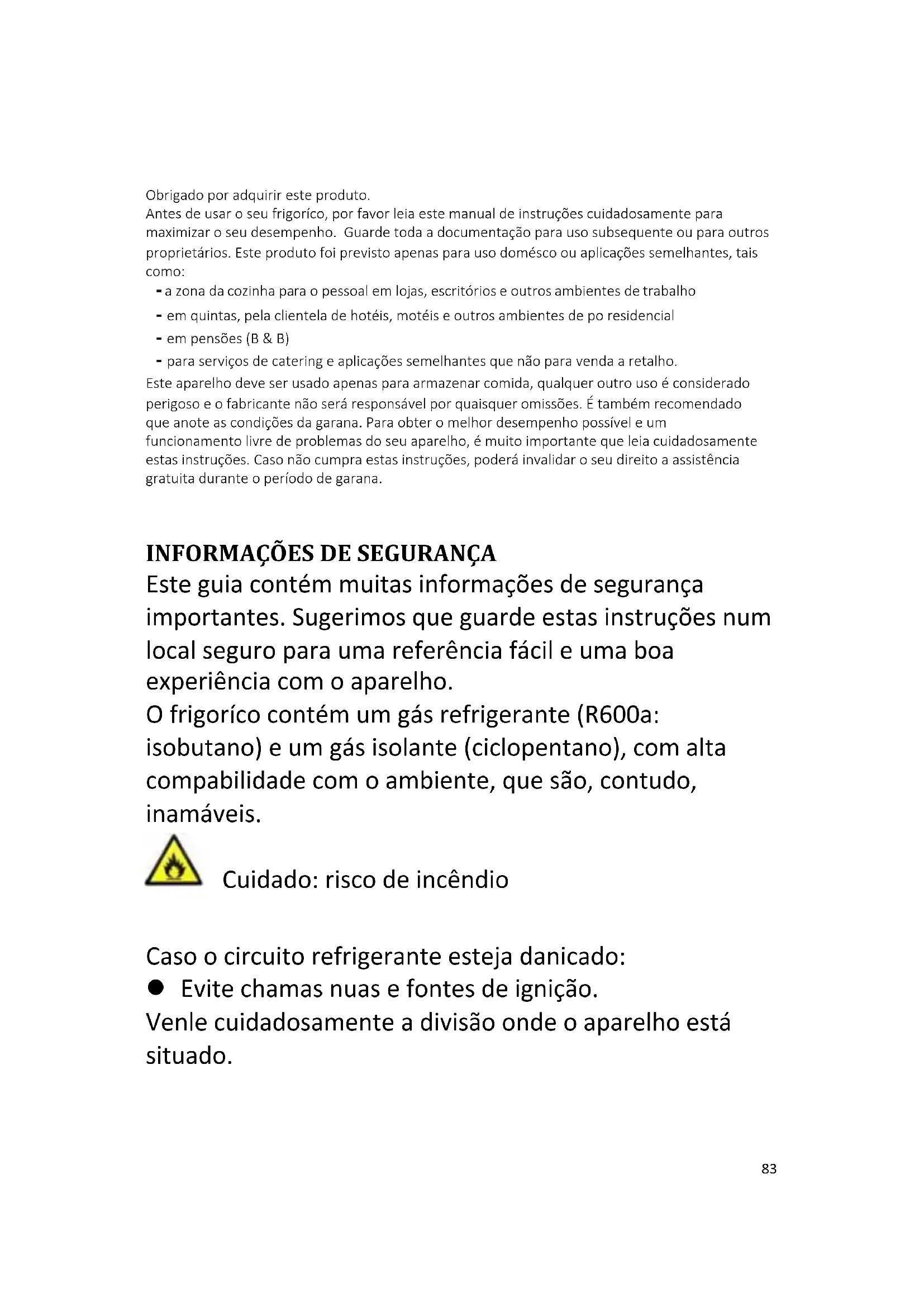 Este guia contém muitas informações de segurança importantes. Sugerimos que guarde estas instruções num local seguro para uma referência fácil e uma boa experiência com o aparelho. O frigorífico contém um gás refrigerante (R600a: isobutano) e um gás isolante (ciclopentano), com alta compatibilidade com o ambiente, que são, contudo, inflamáveis. Cuidado: risco de incêndio Caso o circuito refrigerante esteja danificado: Evite chamas nuas e fontes de ignição. Ventile cuidadosamente a divisão onde o aparelho está situado. Tempo de funcionamento em percentagem: 18℃:Funcionamento 11min,paragem 20min84 AVISO! Deve ter cuidado ao limpar/transportar o aparelho para evitar tocar nos fios metálicos do condensador na parte traseira do aparelho, já que poderá sofrer lesões nos seus dedos e mãos ou danificar o seu produto. Este aparelho não está concebido para ser empilhado com qualquer outro aparelho. Não tente sentar-se ou permanecer em pé no topo do seu aparelho, pois este não está concebido para tal utilização. Você pode magoar-se ou danificar o aparelho. Certifique-se que o cabo de alimentação não fica retido sob o aparelho durante ou após o transporte/movimentação do mesmo, para evitar que o cabo de alimentação seja cortado ou danificado. Ao posicionar o seu aparelho, tenha cuidado para não danificar o seu pavimento, canos, revestimentos de parede, etc. Não mova o aparelho puxando-o pela tampa ou pela pega. Não permita que crianças brinquem com o aparelho ou mexam nos comandos. A nossa empresa declina aceitar qualquer responsabilidade caso as instruções não sejam respeitadas. Não instale o aparelho em locais húmidos, oleosos ou poeirentos, nem o exponha à luz solar direta ou à água. Não instale o aparelho próximo de aquecedores ou85 materiais inflamáveis. Caso ocorra uma falha de energia não abra a tampa. A comida congelada não deverá ser afetada se a falha durar menos de 20 horas. Caso a falha seja mais prolongada, então a comida deve ser verificada e comida de imediato, ou cozinhada e então recongelada. Caso a tampa da arca congeladora seja difícil de abrir imediatamente depois de a ter fechado, não se preocupe. Isto deve-se à diferença de pressão que irá equilibrar-se e permitir que a tampa seja aberta normalmente após alguns minutos. Não ligue o aparelho à alimentação de energia até que todas as proteções de embalagem e de transporte tenham sido removidas. Deixe repousar durante pelo menos 4 horas antes de ligar, para permitir que o óleo do compressor estabilize, caso tenha sido transportado na horizontal. Este congelador só deverá ser utilizado para os fins previstos (i.e. armazenamento e congelação de géneros alimentícios). Não armazene medicamentos ou materiais de pesquisa nos Frigoríficos para Vinho. Quando pretender armazenar um material que exija um controlo rigoroso das temperaturas de armazenamento, é possível que se deteriore ou que ocorra uma reação descontrolada que pode causar riscos.86 Antes de realizar qualquer operação, desligue o cabo de alimentação da tomada. Aquando da entrega, certifique-se que o produto não está danificado e que todos os componentes e acessórios estão em perfeitas condições. Se reparar numa fuga no sistema de refrigeração, não toque na tomada de parede e não use chamas nuas. Abra a janela e deixe entrar ar no compartimento. Depois ligue a um centro de serviço para solicitar uma reparação. Não use extensões ou adaptadores. Não puxe ou dobre o cabo de alimentação excessivamente ou toque na ficha com as mãos molhadas. Não danifique a ficha e/ou o cabo de alimentação; isso pode causar choques elétricos ou incêndios. Se o cabo de alimentação estiver danificado, o mesmo deve ser substituído pelo serviço de assistência técnica do fabricante ou por um técnico qualificada para evitar perigo Não coloque ou armazene materiais inflamáveis e altamente voláteis como éter, petróleo, GPL, gás propano, latas de spray aerosol, adesivos, álcool puro, etc. Estes materiais podem provocar uma explosão. Não use ou armazene sprays inflamáveis, tais como tinta em spray, perto dos Frigoríficos para Vinho. Isso pode causar uma explosão ou incêndio. Não coloque objetos e/ou recipientes com água no87 topo do aparelho. Não recomendamos a utilização de extensões e adaptadores. Não elimine o aparelho através do fogo. Tenha cuidado para não danificar o circuito/tubos de refrigeração do aparelho durante o transporte e utilização. Em caso de danos, não exponha o aparelho a uma fonte potencial de ignição e ventile de imediato a divisão onde o aparelho se situa. O sistema de refrigeração posicionado atrás e no interior dos Frigoríficos para Vinho contém refrigerante. Logo, evite danificar os tubos. Não use aparelhos elétricos no interior dos compartimentos para armazenamento de comida do aparelho, a não ser que sejam do tipo recomendado pelo fabricante. Não danifique o circuito de refrigeração. Não utilize dispositivos mecânicos ou outros meios para acelerar o processo de descongelação, que não os recomendados pelo fabricante. Não use aparelhos elétricos no interior dos compartimentos para armazenamento de comida do aparelho, a não ser que sejam do tipo recomendado pelo fabricante. Não tocar os elementos de refrigeração internos, especialmente com as mãos molhadas, pois pode sofrer queimaduras ou ferimentos graves. Mantenha as aberturas de ventilação no88 revestimento do aparelho ou na estrutura integrada, livres de obstruções. Não use objetos pontiagudos ou afiados tais como facas ou garfos para remover o gelo. Nunca use secadores de cabelo, aquecedores elétricos ou outros aparelhos similares para a descongelação. Não use uma faca ou um objecto afiado para remover o gelo que possa existir. Caso os utilize, o circuito de refrigerante pode danificar-se, e a fuga que daí decorrer pode causar um incêndio ou 