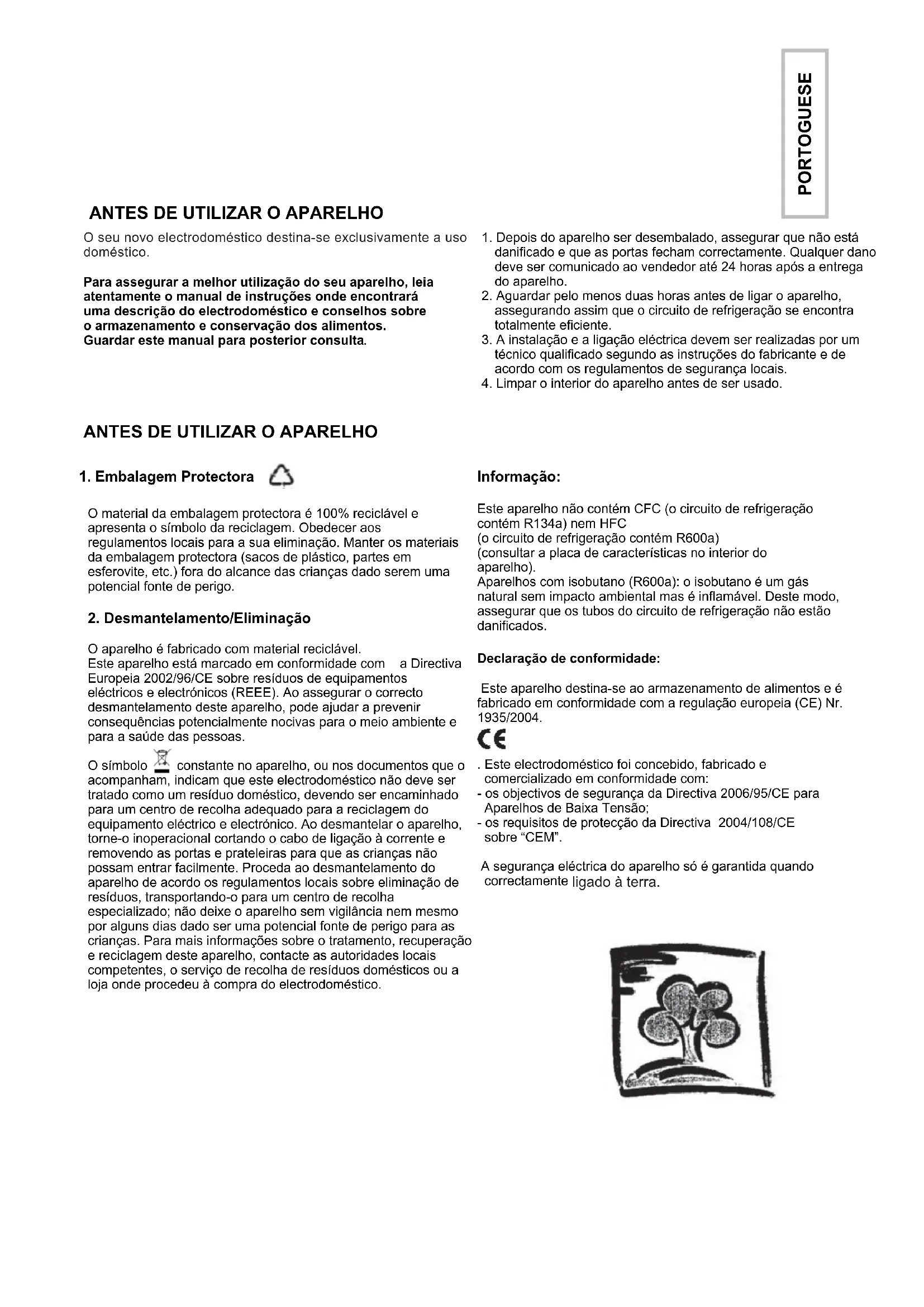 O aparelho é fabricado com material reciclável. Este aparelho está marcado em conformidade com a Directiva Europeia 2002/96/CE sobre resíduos de equipamentos eléctricos e electrónicos (REEE). Ao assegurar o correcto desmantelamento deste aparelho, pode ajudar a prevenir consequências potencialmente nocivas para o meio ambiente e para a saúde das pessoas. O símbolo constante no aparelho, ou nos documentos que o acompanham, indicam que este electrodoméstico não deve ser tratado como um resíduo doméstico, devendo ser encaminhado para um centro de recolha adequado para a reciclagem do equipamento eléctrico e electrónico. Ao desmantelar o aparelho, torne-o inoperacional cortando o cabo de ligação à corrente e removendo as portas e prateleiras para que as crianças não possam entrar facilmente. Proceda ao desmantelamento do aparelho de acordo os regulamentos locais sobre eliminação de resíduos, transportando-o para um centro de recolha especializado; não deixe o aparelho sem vigilância nem mesmo por alguns dias dado ser uma potencial fonte de perigo para as crianças. Para mais informações sobre o tratamento, recuperação e reciclagem deste aparelho, contacte as autoridades locais competentes, o serviço de recolha de resíduos domésticos ou a loja onde procedeu à compra do electrodoméstico. Informação: Este aparelho não contém CFC (o circuito de refrigeração contém R134a) nem HFC (o circuito de refrigeração contém R600a) (consultar a placa de características no interior do aparelho). Aparelhos com isobutano (R600a): o isobutano é um gás natural sem impacto ambiental mas é inflamável. Deste modo, assegurar que os tubos do circuito de refrigeração não estão danificados. Declaração de conformidade: Este aparelho destina-se ao armazenamento de alimentos e é fabricado em conformidade com a regulação europeia (CE) Nr. 1935/2004. . Este electrodoméstico foi concebido, fabricado e comercializado em conformidade com: - os objectivos de segurança da Directiva 2006/95/CE para Aparelhos de Baixa Tensão; - os requisitos de protecção da Directiva 2004/108/CE sobre “CEM”. A segurança eléctrica do aparelho só é garantida quando correctamente ligado à terra.