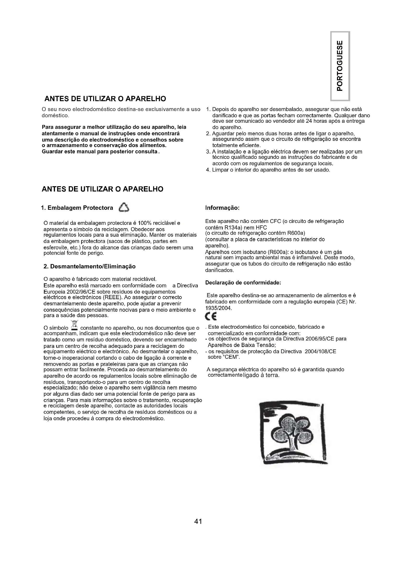 O aparelho é fabricado com material reciclável. Este aparelho está marcado em conformidade com a Directiva Europeia 2002/96/CE sobre resíduos de equipamentos eléctricos e electrónicos (REEE). Ao assegurar o correcto desmantelamento deste aparelho, pode ajudar a prevenir consequências potencialmente nocivas para o meio ambiente e para a saúde das pessoas. O símbolo constante no aparelho, ou nos documentos que o acompanham, indicam que este electrodoméstico não deve ser tratado como um resíduo doméstico, devendo ser encaminhado para um centro de recolha adequado para a reciclagem do equipamento eléctrico e electrónico. Ao desmantelar o aparelho, torne-o inoperacional cortando o cabo de ligação à corrente e removendo as portas e prateleiras para que as crianças não possam entrar facilmente. Proceda ao desmantelamento do aparelho de acordo os regulamentos locais sobre eliminação de resíduos, transportando-o para um centro de recolha especializado; não deixe o aparelho sem vigilância nem mesmo por alguns dias dado ser uma potencial fonte de perigo para as crianças. Para mais informações sobre o tratamento, recuperação e reciclagem deste aparelho, contacte as autoridades locais competentes, o serviço de recolha de resíduos domésticos ou a loja onde procedeu à compra do electrodoméstico. Informação: Este aparelho não contém CFC (o circuito de refrigeração contém R134a) nem HFC (o circuito de refrigeração contém R600a) (consultar a placa de características no interior do aparelho). Aparelhos com isobutano (R600a): o isobutano é um gás natural sem impacto ambiental mas é inflamável. Deste modo, assegurar que os tubos do circuito de refrigeração não estão danificados. Declaração de conformidade: Este aparelho destina-se ao armazenamento de alimentos e é fabricado em conformidade com a regulação europeia (CE) Nr. 1935/2004. . Este electrodoméstico foi concebido, fabricado e comercializado em conformidade com: - os objectivos de segurança da Directiva 2006/95/CE para Aparelhos de Baixa Tensão; - os requisitos de protecção da Directiva 2004/108/CE sobre “CEM”. A segurança eléctrica do aparelho só é garantida quando correctamente ligado à terra.
