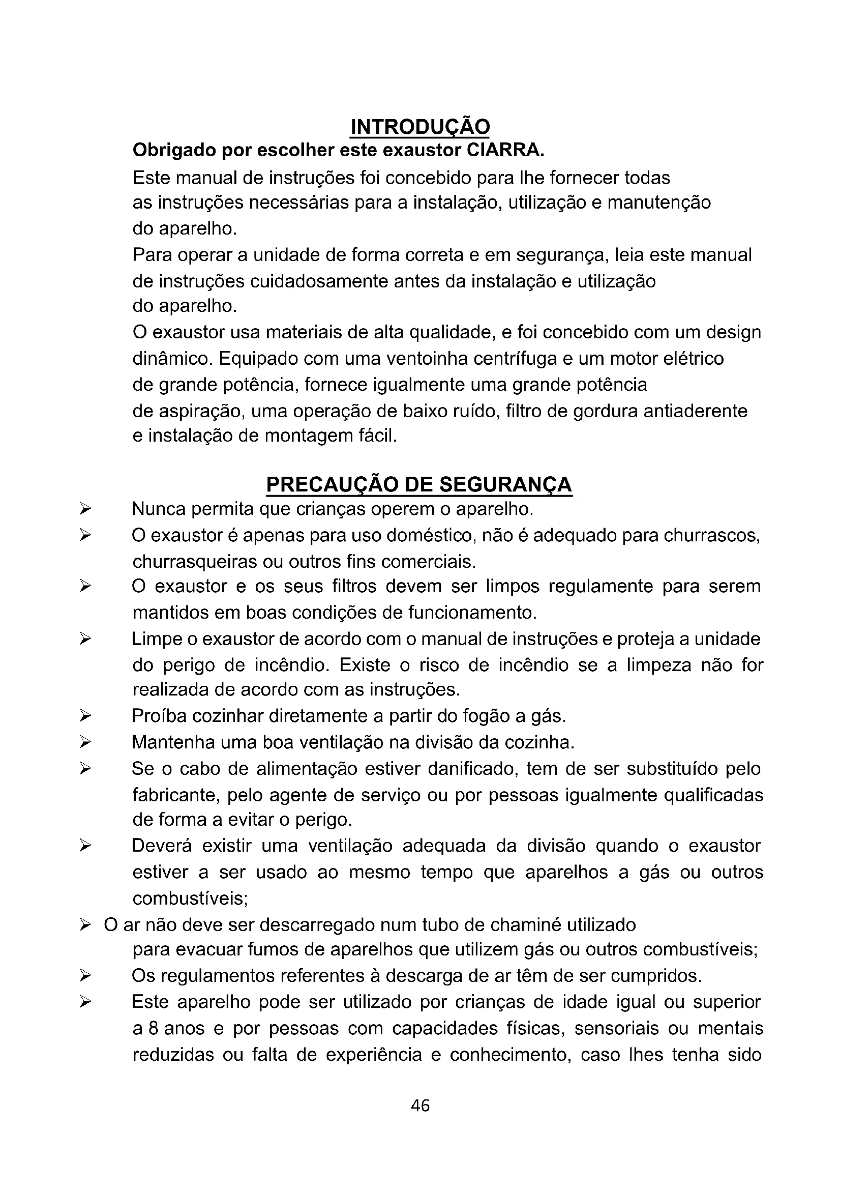 INTRODUÇÃO Obrigado por escolher este exaustor CIARRA. Este manual de instruções foi concebido para lhe fornecer todas as instruções necessárias para a instalação, utilização e manutenção do aparelho. Para operar a unidade de forma correta e em segurança, leia este manual de instruções cuidadosamente antes da instalação e utilização do aparelho. O exaustor usa materiais de alta qualidade, e foi concebido com um design dinâmico. Equipado com uma ventoinha centrífuga e um motor elétrico de grande potência, fornece igualmente uma grande potência de aspiração, uma operação de baixo ruído, filtro de gordura antiaderente e instalação de montagem fácil.