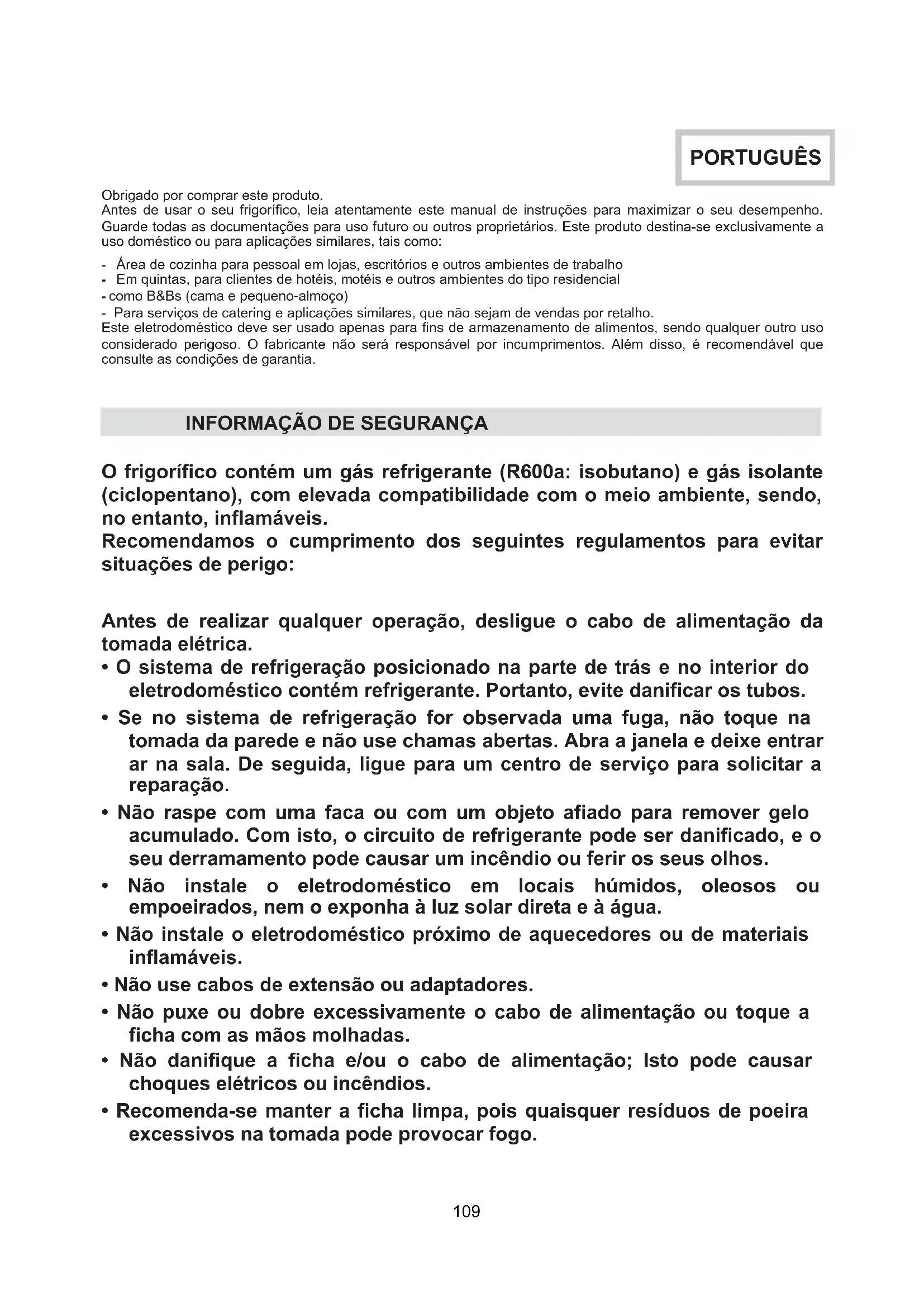 - Recomenda-se manter a ficha limpa, pois quaisquer resíduos de poeira excessivos na tomada pode provocar fogo. 109• Não use dispositivos mecânicos ou outros equipamentos para acelerar o processo de descongelação.