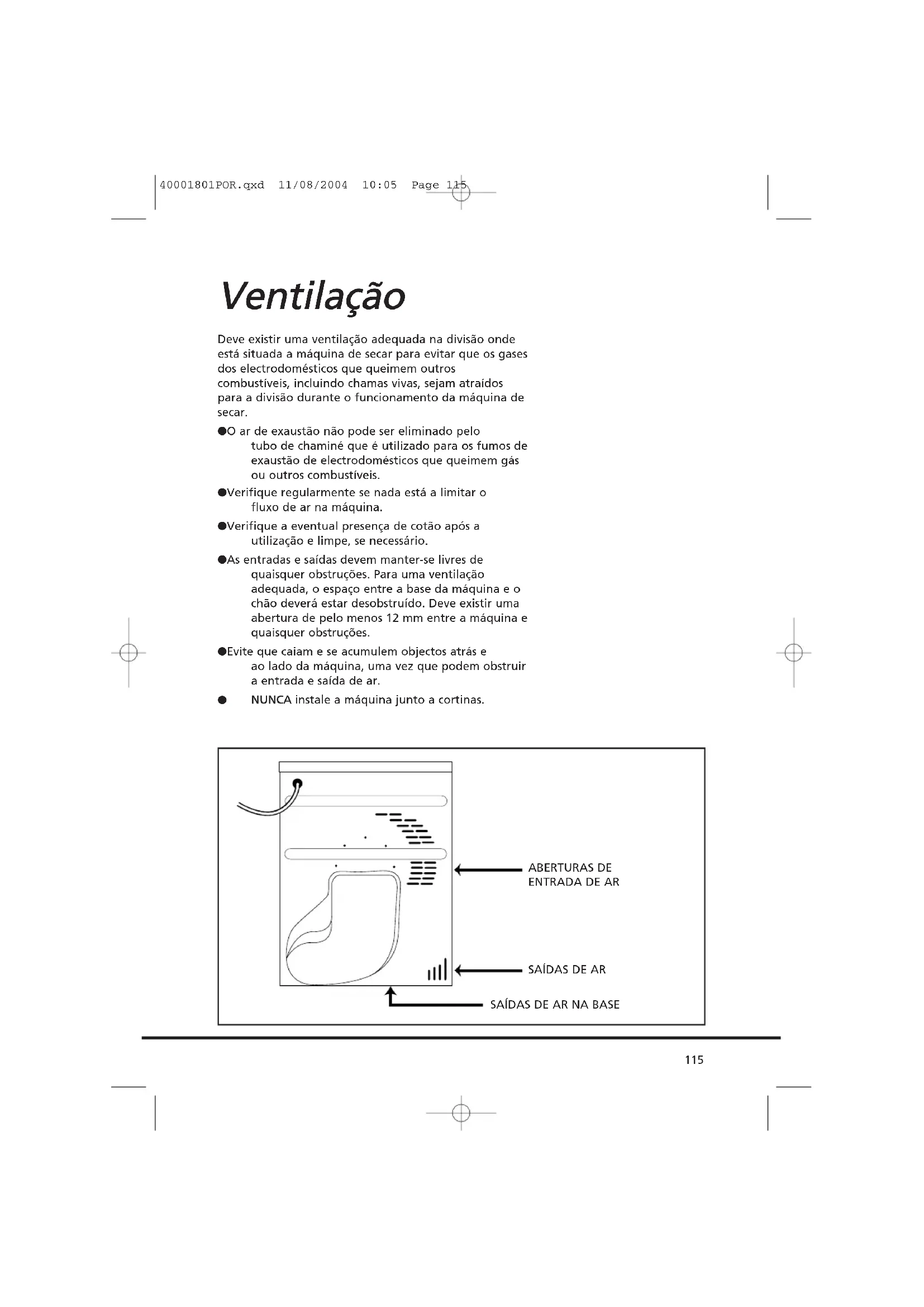 PPooddee sseerr--llhhee ccoobbrraaddaa uummaa vviissiittaa ddaa aassssiissttêênncciiaa ssee oo pprroobblleemmaa ddaa mmááqquuiinnaa ssee ddeevveerr aa uummaa iinnssttaallaaççããoo iinnccoorrrreeccttaa.. SSee oo ccaabboo ddee aalliimmeennttaaççããoo ddaa mmááqquuiinnaa ssee ddaanniiffiiccaarr,, ddeevvee sseerr ssuubbssttiittuuííddoo ppoorr uumm ccaabboo eessppeecciiaall AAPPEENNAASS ddiissppoonníívveell nnoo sseerrvviiççoo ddee ppeeççaass ssoobbrreessssaalleenntteess.. TTeemm ddee sseerr iinnssttaallaaddoo ppoorr uummaa ppeessssooaa ccoommppeetteennttee.. IInnssttaallaaççããoo NNããoo ccoonneeccttee aa mmááqquuiinnaa nneemm aa lliigguuee aattéé qquuee aa iinnssttaallaaççããoo eesstteejjaa ccoonncclluuííddaa.. PPaarraa ssuuaa sseegguurraannççaa,, aa mmááqquuiinnaa ddeevvee sseerr ccoorrrreeccttaammeennttee iinnssttaallaaddaa.. SSee ttiivveerr aallgguummaa ddúúvviiddaa ssoobbrree aa iinnssttaallaaççããoo,, aaccoonnsseellhhee--ssee ccoomm aa AAssssiissttêênncciiaa GGIIAASS.. 40001801POR.qxd 11/08/2004 10:05 Page 114Deve existir uma ventilação adequada na divisão onde está situada a máquina de secar para evitar que os gases dos electrodomésticos que queimem outros combustíveis, incluindo chamas vivas, sejam atraídos para a divisão durante o funcionamento da máquina de secar. ● O ar de exaustão não pode ser eliminado pelo tubo de chaminé que é utilizado para os fumos de exaustão de electrodomésticos que queimem gás ou outros combustíveis. ● Verifique regularmente se nada está a limitar o fluxo de ar na máquina. ● Verifique a eventual presença de cotão após a utilização e limpe, se necessário. ● As entradas e saídas devem manter-se livres de quaisquer obstruções. Para uma ventilação adequada, o espaço entre a base da máquina e o chão deverá estar desobstruído. Deve existir uma abertura de pelo menos 12 mm entre a máquina e quaisquer obstruções. ● Evite que caiam e se acumulem objectos atrás e ao lado da máquina, uma vez que podem obstruir a entrada e saída de ar.