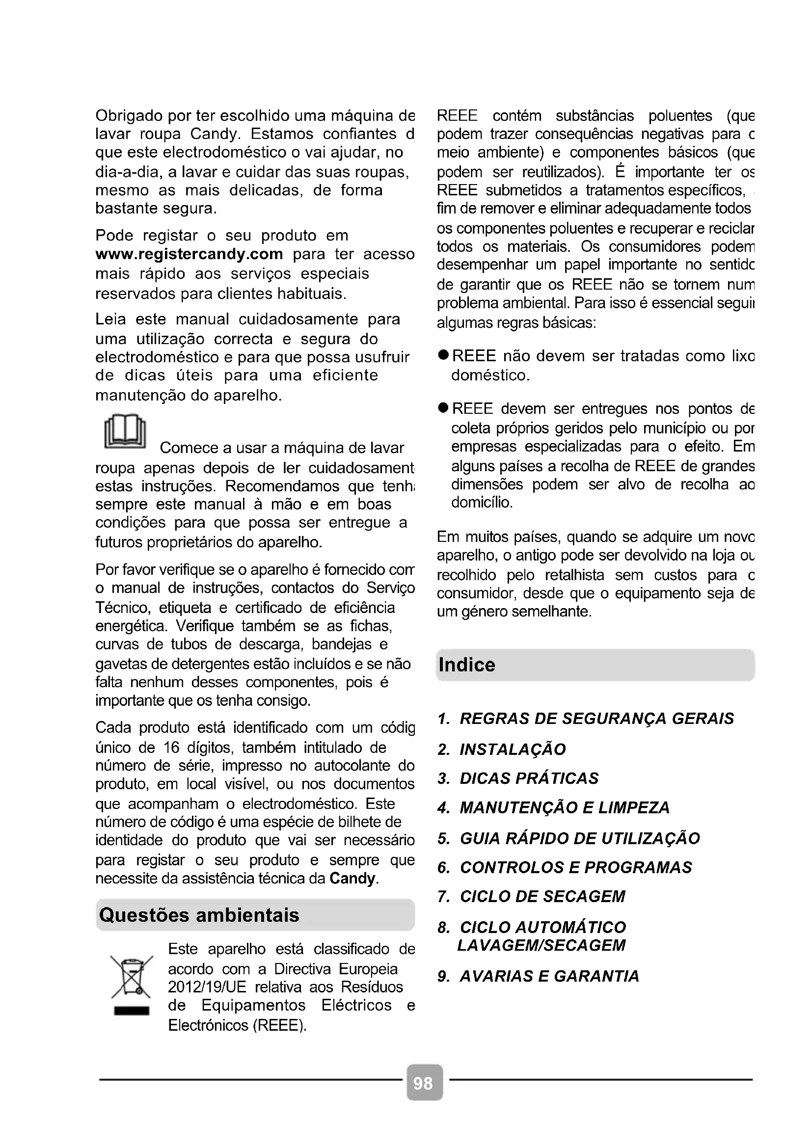 Obrigado por ter escolhido uma máquina de lavar roupa Candy. Estamos confiantes de que este electrodoméstico o vai ajudar, no dia-a-dia, a lavar e cuidar das suas roupas, mesmo as mais delicadas, de forma bastante segura. Pode registar o seu produto em www.registercandy.com para ter acesso mais rápido aos serviços especiais reservados para clientes habituais. Leia este manual cuidadosamente para uma utilização correcta e segura do electrodoméstico e para que possa usufruir de dicas úteis para uma eficiente manutenção do aparelho. Comece a usar a máquina de lavar roupa apenas depois de ler cuidadosamente estas instruções. Recomendamos que tenha sempre este manual à mão e em boas condições para que possa ser entregue a futuros proprietários do aparelho. Por favor verifique se o aparelho é fornecido com o manual de instruções, contactos do Serviço Técnico, etiqueta e certificado de eficiência energética. Verifique também se as fichas, curvas de tubos de descarga, bandejas e gavetas de detergentes estão incluídos e se não falta nenhum desses componentes, pois é importante que os tenha consigo. Cada produto está identificado com um código único de 16 dígitos, também intitulado de número de série, impresso no autocolante do produto, em local visível, ou nos documentos que acompanham o electrodoméstico. Este número de código é uma espécie de bilhete de identidade do produto que vai ser necessário para registar o seu produto e sempre que necessite da assistência técnica da Candy.