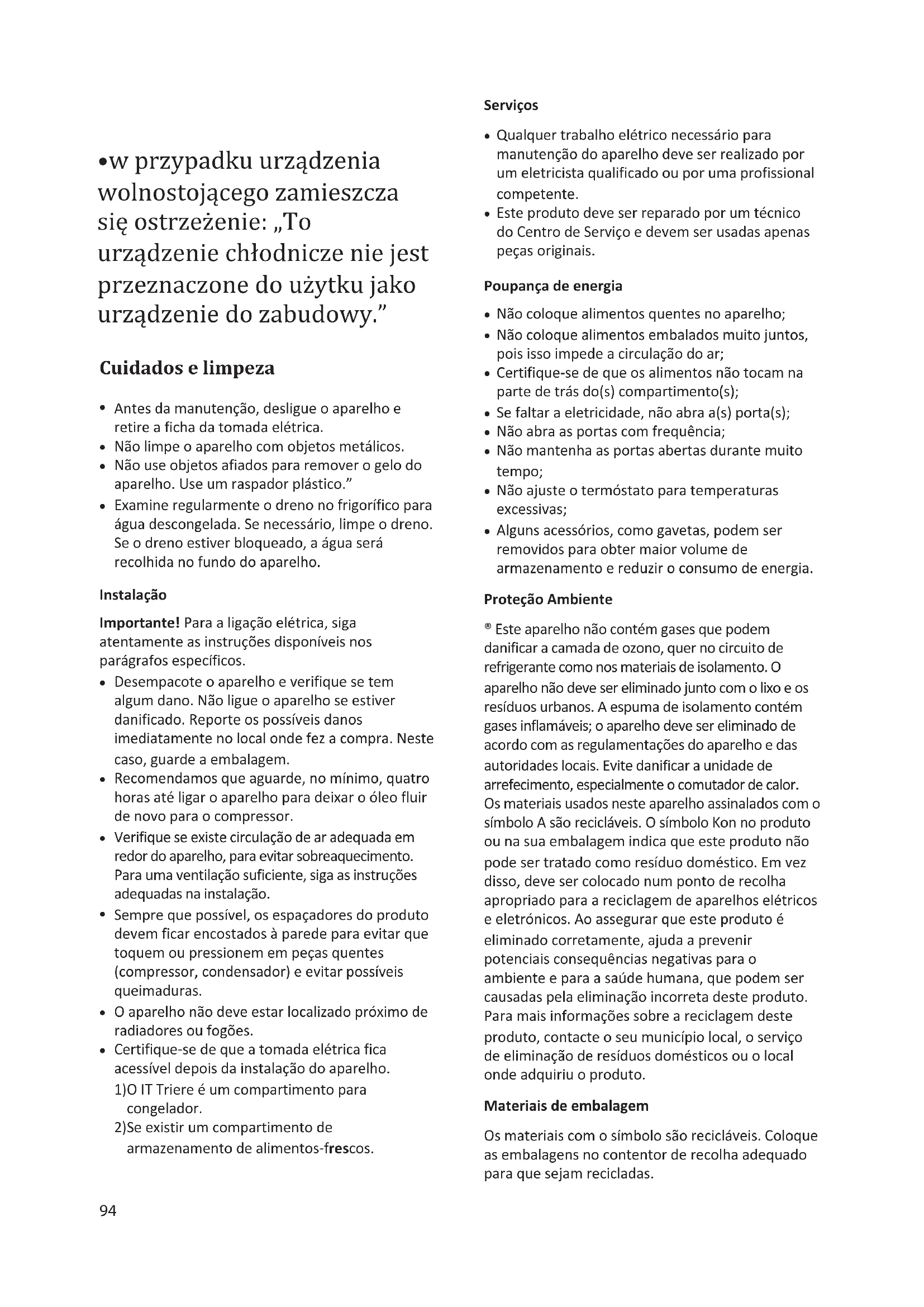 WƌŽƚĞĕĆŽŵďŝĞŶƚĞ ® Este aparelho não contém gases que podem danificar a camada de ozono, quer no circuito de refrigerante como nos materiais de isolamento. O aparelho não deve ser eliminado junto com o lixo e os resíduos urbanos. A espuma de isolamento contém gases inflamáveis; o aparelho deve ser eliminado de acordo com as regulamentações do aparelho e das autoridades locais. Evite danificar a unidade de arrefecimento, especialmente o comutador de calor. Os materiais usados neste aparelho assinalados com o símbolo A são recicláveis. O símbolo Kon no produto ou na sua embalagem indica que este produto não pode ser tratado como resíduo doméstico. Em vez disso, deve ser colocado num ponto de recolha apropriado para a reciclagem de aparelhos elétricos e eletrónicos. Ao assegurar que este produto é eliminado corretamente, ajuda a prevenir potenciais consequências negativas para o ambiente e para a saúde humana, que podem ser causadas pela eliminação incorreta deste produto. Para mais informações sobre a reciclagem deste produto, contacte o seu município local, o serviço de eliminação de resíduos domésticos ou o local onde adquiriu o produto. DĂƚĞƌŝĂŝƐĚĞĞŵďĂůĂŐĞŵ Os materiais com o símbolo são recicláveis. Coloque as embalagens no contentor de recolha adequado para que sejam recicladas.