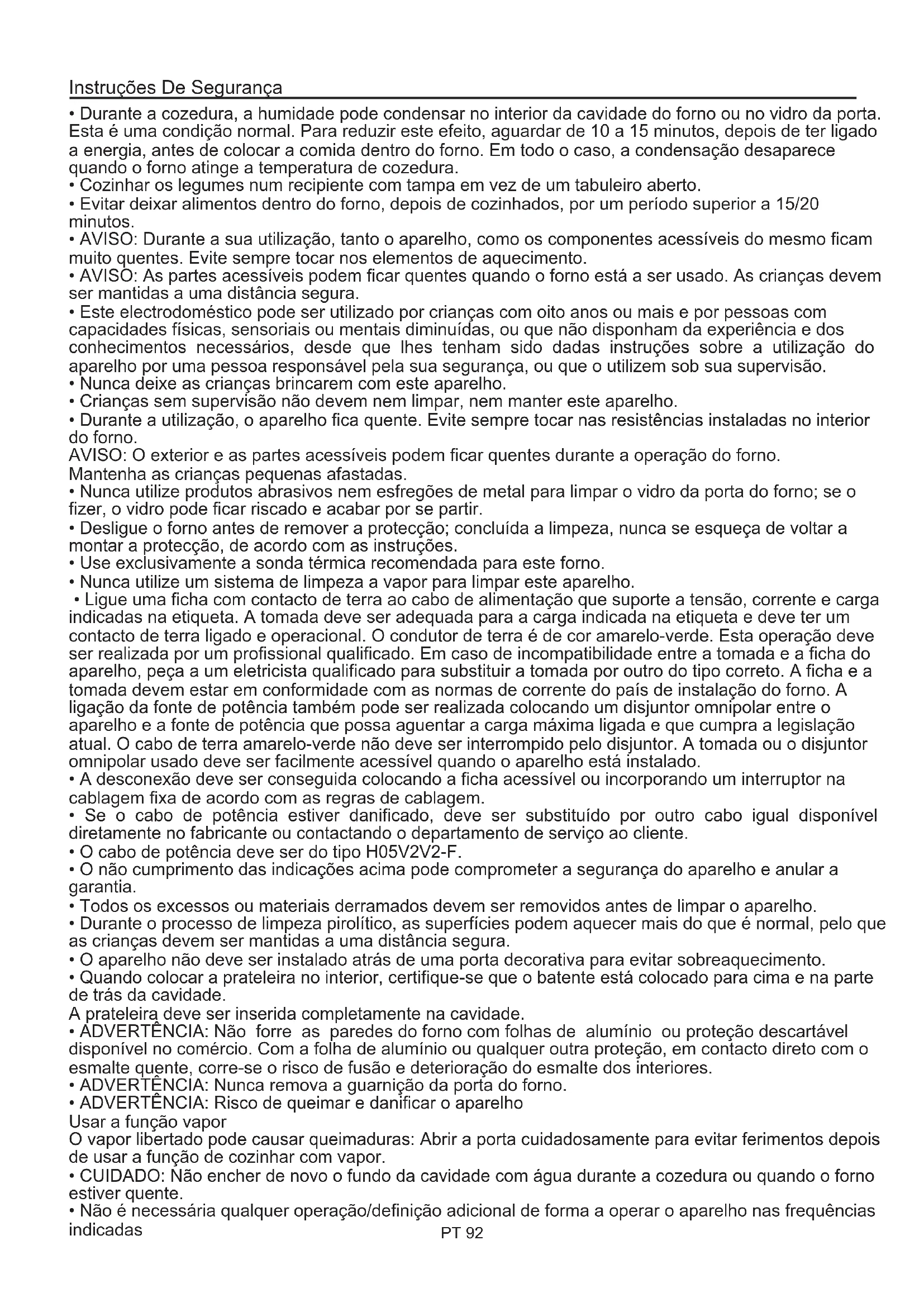 - Não é necessária qualquer operação/definição adicional de forma a operar o aparelho nas frequências indicadas Instruções De Segurança PT 92Resumo PT 93 Limpeza e manutenção do forno Indicações De Carácter Geral
