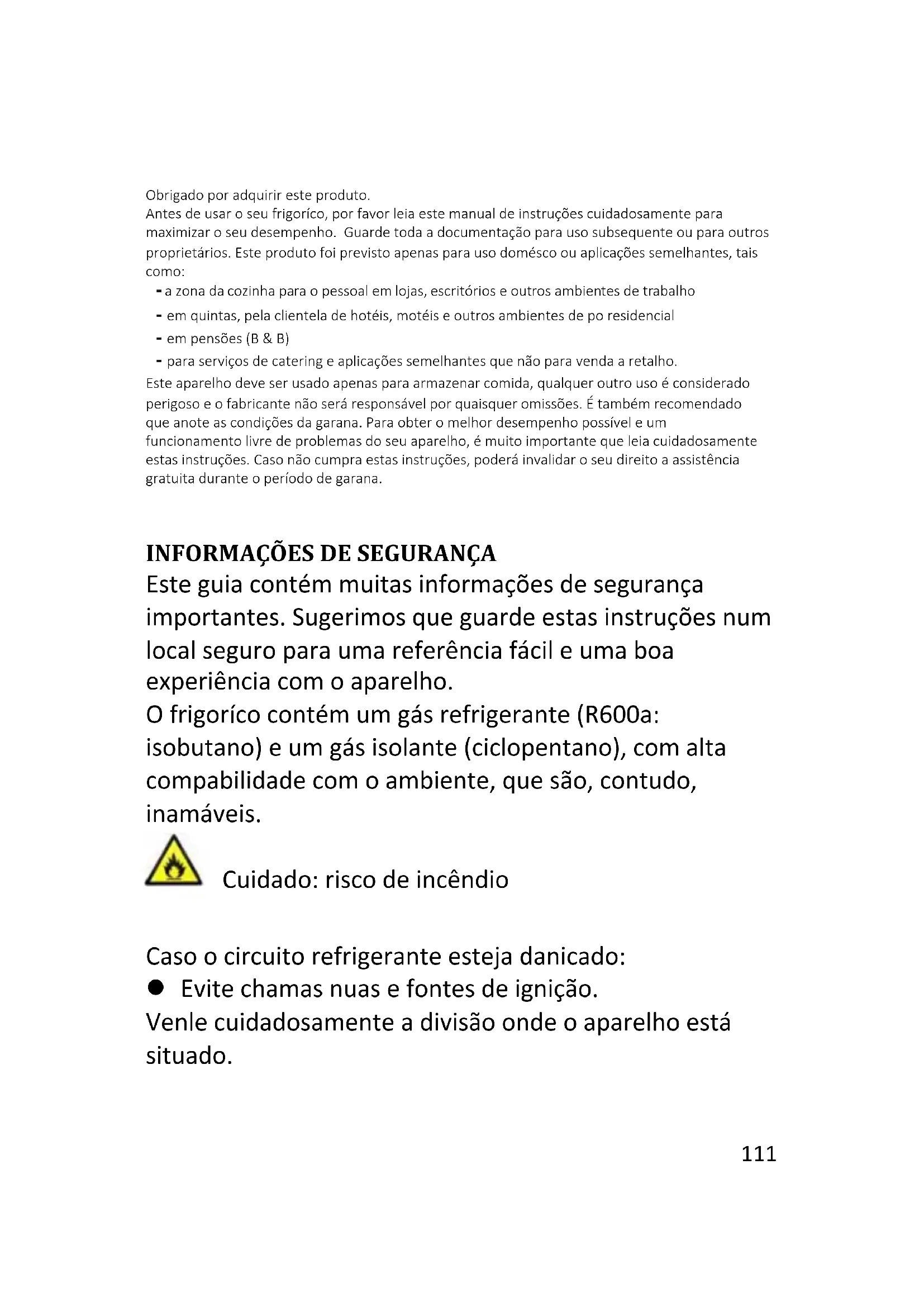 - RESOLUÇÃO DE PROBLEMAS 11 Obrigado por adquirir este produto. Antes de usar o seu frigorífico, por favor leia este manual de instruções cuidadosamente para maximizar o seu desempenho. Guarde toda a documentação para uso subsequente ou para outros proprietários. Este produto foi previsto apenas para uso doméstico ou aplicações semelhantes, tais como: - a zona da cozinha para o pessoal em lojas, escritórios e outros ambientes de trabalho - em quintas, pela clientela de hotéis, motéis e outros ambientes de tipo residencial - em pensões (B & B) - para serviços de catering e aplicações semelhantes que não para venda a retalho. Este aparelho deve ser usado apenas para armazenar comida, qualquer outro uso é considerado perigoso e o fabricante não será responsável por quaisquer omissões. É também recomendado que anote as condições da garantia. Para obter o melhor desempenho possível e um funcionamento livre de problemas do seu aparelho, é muito importante que leia cuidadosamente estas instruções. Caso não cumpra estas instruções, poderá invalidar o seu direito a assistência gratuita durante o período de garantia. p. 1301