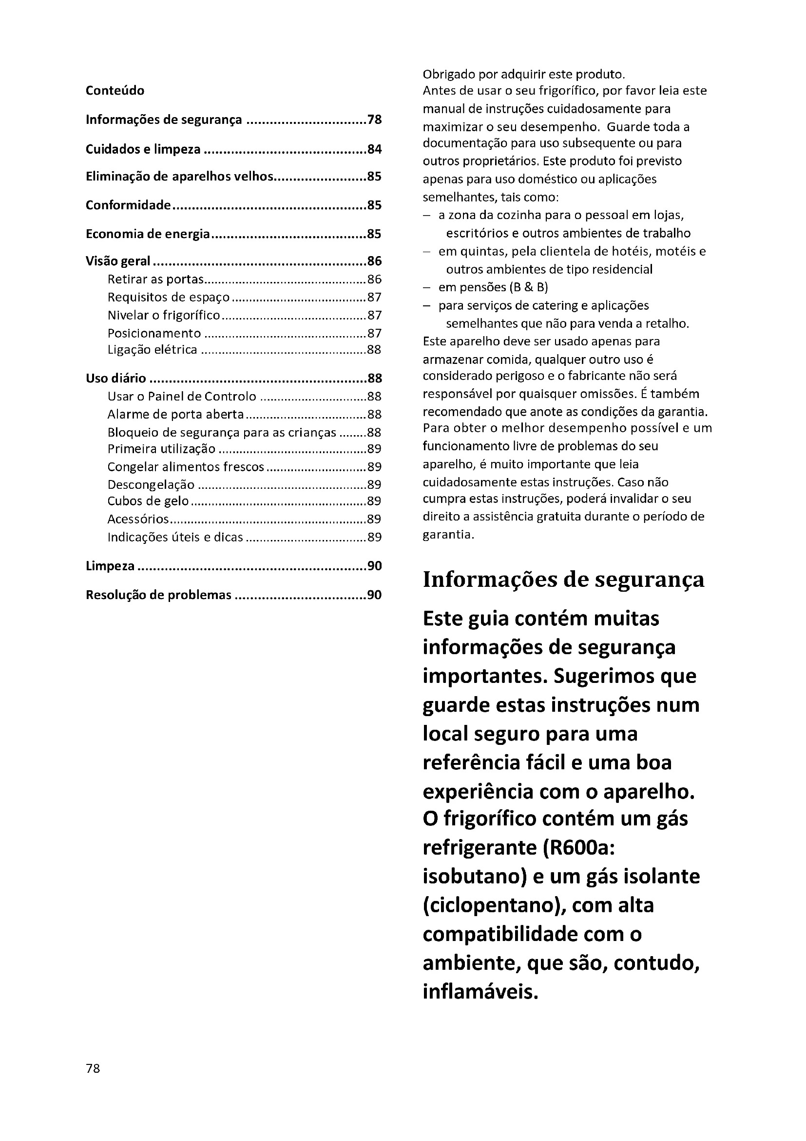 Obrigado por adquirir este produto. Antes de usar o seu frigorífico, por favor leia este manual de instruções cuidadosamente para maximizar o seu desempenho. Guarde toda a documentação para uso subsequente ou para outros proprietários. Este produto foi previsto apenas para uso doméstico ou aplicações semelhantes, tais como: − a zona da cozinha para o pessoal em lojas, escritórios e outros ambientes de trabalho − em quintas, pela clientela de hotéis, motéis e outros ambientes de tipo residencial − em pensões (B & B) − para serviços de catering e aplicações semelhantes que não para venda a retalho. Este aparelho deve ser usado apenas para armazenar comida, qualquer outro uso é considerado perigoso e o fabricante não será responsável por quaisquer omissões. É também recomendado que anote as condições da garantia. Para obter o melhor desempenho possível e um funcionamento livre de problemas do seu aparelho, é muito importante que leia cuidadosamente estas instruções. Caso não cumpra estas instruções, poderá invalidar o seu direito a assistência gratuita durante o período de garantia. Informações de segurança Este guia contém muitas informações de segurança importantes. Sugerimos que guarde estas instruções num local seguro para uma referência fácil e uma boa experiência com o aparelho. O frigorífico contém um gás refrigerante (R600a: isobutano) e um gás isolante (ciclopentano), com alta compatibilidade com o ambiente, que são, contudo, inflamáveis.79 Cuidado: risco de incêndio Caso o circuito refrigerante esteja danificado: