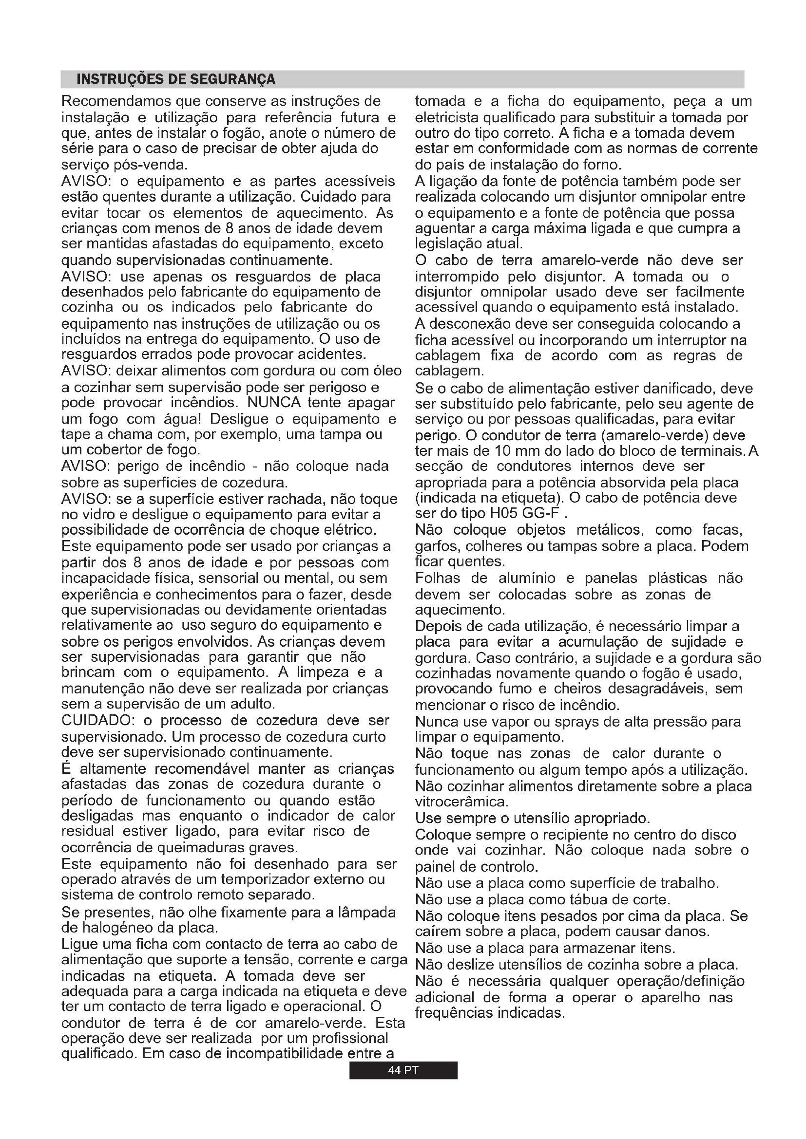 L'elettrodomestico è conforme alla Direttiva Europea 2009/142/CE (GAD) e a partire dal 21/04/2018 con il regolamento GAR (Gas Appliances Regulation) 2016/426. Apponendo la marcatura su questo prodotto, dichiariamo, sotto la nostra responsabilità, di ottemperare a tutti i requisiti relativi alla tutela di sicurezza, salute e ambiente previsti dalla legislazione europea in essere per questo prodotto.44 PT AVISO: use apenas os resguardos de placa desenhados pelo fabricante do equipamento de cozinha ou os indicados pelo fabricante do equipamento nas instruções de utilização ou os incluídos na entrega do equipamento. O uso de resguardos errados pode provocar acidentes. AVISO: o equipamento e as partes acessíveis estão quentes durante a utilização. Cuidado para evitar tocar os elementos de aquecimento. As crianças com menos de 8 anos de idade devem ser mantidas afastadas do equipamento, exceto quando supervisionadas continuamente. Se presentes, não olhe fixamente para a lâmpada de halogéneo da placa. Recomendamos que conserve as instruções de instalação e utilização para referência futura e que, antes de instalar o fogão, anote o número de série para o caso de precisar de obter ajuda do serviço pós-venda. É altamente recomendável manter as crianças afastadas das zonas de cozedura durante o período de funcionamento ou quando estão desligadas mas enquanto o indicador de calor residual estiver ligado, para evitar risco de ocorrência de queimaduras graves. Ligue uma ficha com contacto de terra ao cabo de alimentação que suporte a tensão, corrente e carga indicadas na etiqueta. A tomada deve ser adequada para a carga indicada na etiqueta e deve ter um contacto de terra ligado e operacional. O condutor de terra é de cor amarelo-verde. Esta operação deve ser realizada por um profissional qualificado. Em caso de incompatibilidade entre a AVISO: deixar alimentos com gordura ou com óleo a cozinhar sem supervisão pode ser perigoso e pode provocar incêndios. NUNCA tente apagar um fogo com água! Desligue o equipamento e tape a chama com, por exemplo, uma tampa ou um cobertor de fogo. Este equipamento não foi desenhado para ser operado através de um temporizador externo ou sistema de controlo remoto separado. Este equipamento pode ser usado por crianças a partir dos 8 anos de idade e por pessoas com incapacidade física, sensorial ou mental, ou sem experiência e conhecimentos para o fazer, desde que supervisionadas ou devidamente orientadas relativamente ao uso seguro do equipamento e sobre os perigos envolvidos. As crianças devem ser supervisionadas para garantir que não brincam com o equipamento. A limpeza e a manutenção não deve ser realizada por crianças sem a supervisão de um adulto. AVISO: se a superfície estiver rachada, não toque no vidro e desligue o equipamento para evitar a possibilidade de ocorrência de choque elétrico. AVISO: perigo de incêndio - não coloque nada sobre as superfícies de cozedura. CUIDADO: o processo de cozedura deve ser supervisionado. Um processo de cozedura curto deve ser supervisionado continuamente.
