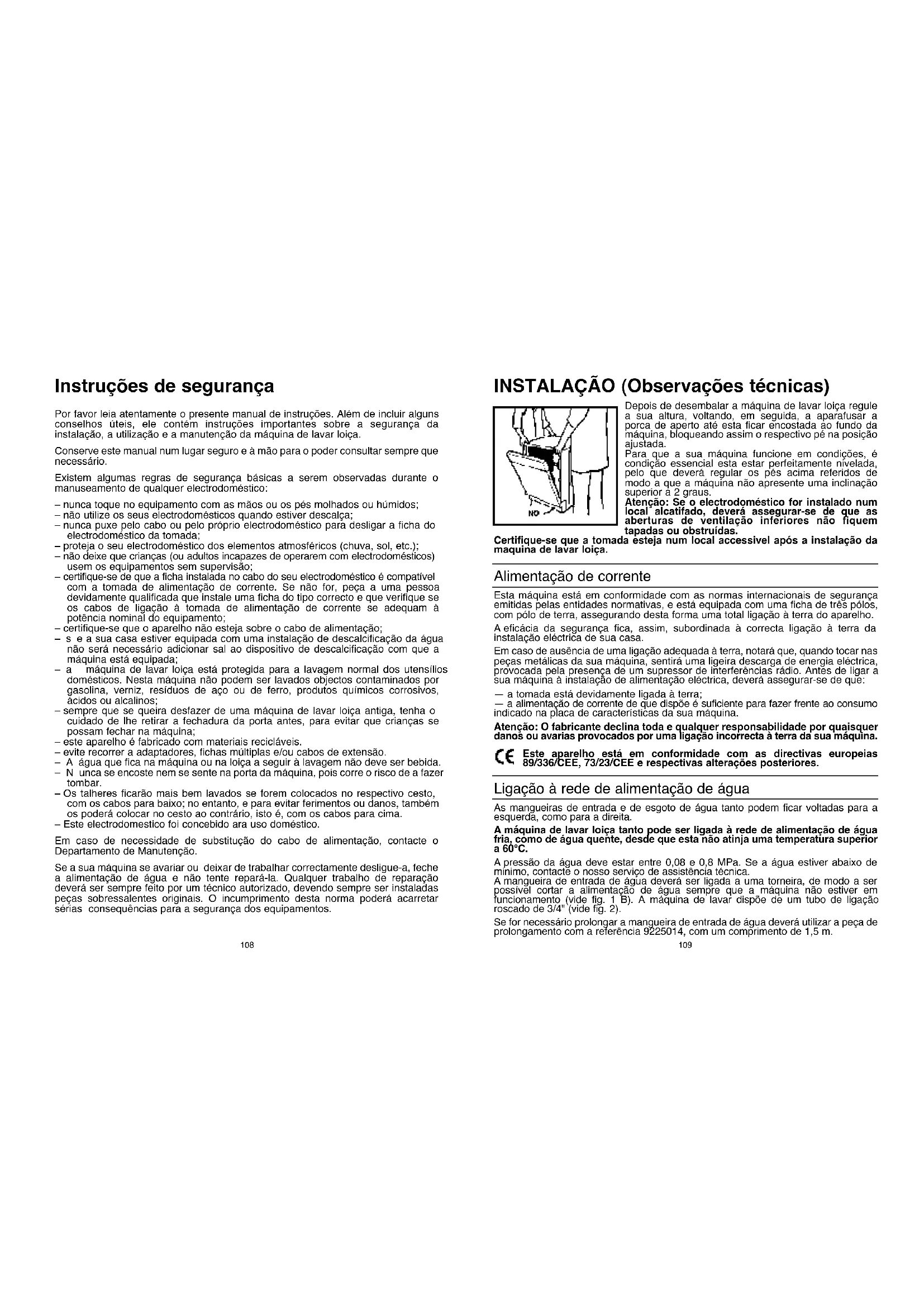 Instruções de segurança Por favor leia atentamente o presente manual de instruções. Além de incluir alguns conselhos úteis, ele contém instruções importantes sobre a segurança da instalação, a utilização e a manutenção da máquina de lavar loiça. Conserve este manual num lugar seguro e à mão para o poder consultar sempre que necessário. Existem algumas regras de segurança básicas a serem observadas durante o manuseamento de qualquer electrodoméstico: – nunca toque no equipamento com as mãos ou os pés molhados ou húmidos; – não utilize os seus electrodomésticos quando estiver descalça; – nunca puxe pelo cabo ou pelo próprio electrodoméstico para desligar a ficha do electrodoméstico da tomada; – proteja o seu electrodoméstico dos elementos atmosféricos (chuva, sol, etc.); – não deixe que crianças (ou adultos incapazes de operarem com electrodomésticos) usem os equipamentos sem supervisão; – certifique-se de que a ficha instalada no cabo do seu electrodoméstico é compatível com a tomada de alimentação de corrente. Se não for, peça a uma pessoa devidamente qualificada que instale uma ficha do tipo correcto e que verifique se os cabos de ligação à tomada de alimentação de corrente se adequam à potência nominal do equipamento; – certifique-se que o aparelho não esteja sobre o cabo de alimentação; –se a sua casa estiver equipada com uma instalação de descalcificação da água não será necessário adicionar sal ao dispositivo de descalcificação com que a máquina está equipada; –a máquina de lavar loiça está protegida para a lavagem normal dos utensílios domésticos. Nesta máquina não podem ser lavados objectos contaminados por gasolina, verniz, resíduos de aço ou de ferro, produtos químicos corrosivos, ácidos ou alcalinos; – sempre que se queira desfazer de uma máquina de lavar loiça antiga, tenha o cuidado de lhe retirar a fechadura da porta antes, para evitar que crianças se possam fechar na máquina; – este aparelho é fabricado com materiais recicláveis. – evite recorrer a adaptadores, fichas múltiplas e/ou cabos de extensão. –Aágua que fica na máquina ou na loiça a seguir à lavagem não deve ser bebida. –Nunca se encoste nem se sente na porta da máquina, pois corre o risco de a fazer tombar. – Os talheres ficarão mais bem lavados se forem colocados no respectivo cesto, com os cabos para baixo; no entanto, e para evitar ferimentos ou danos, também os poderá colocar no cesto ao contrário, isto é, com os cabos para cima. – Este electrodomestico foi concebido ara uso doméstico. Em caso de necessidade de substitução do cabo de alimentação, contacte o Departamento de Manutenção. Se a sua máquina se avariar ou deixar de trabalhar correctamente desligue-a, feche a alimentação de água e não tente repará-la. Qualquer trabalho de reparação deverá ser sempre feito por um técnico autorizado, devendo sempre ser instaladas peças sobressalentes originais. O incumprimento desta norma poderá acarretar sérias consequências para a segurança dos equipamentos.Ligação ao sistema de esgoto de água Ligue a mangueira de esgoto de água ao sistema de esgoto de água, tendo o cuidado de não deixar que a mangueira fique torcida (fig. 4). O sistema de esgoto fixo deverá ter um diâmetro interno de, pelo menos, 4 cm, devendo ficar a uma altura mínima do chão de 40 cm. Recomendamos a utilização de sifões anti-odores (fig. 4 x). Se necessário, poderá prolongar a mangueira de esgoto da água até ao máximo de 2,6 m de comprimento, tendo porém o cuidade de nunca colocar a mangueira a uma altura superior a 85 cm do chão. Se necessitar de prolongar a mangueira de esgoto utilize a peça de prolongamento com a referência 9269214 e a peça de união com a referência 9264427. A extremidade curva da mangueira de esgoto poderá ser apoiada à borda de um lavatório (a fim de evitar o refluxo da água durante o programa de lavagem, deverá sempre certificar-se de que a extremidade da mangueira não se encontra dentro de água. Vide a fig. 4 y). Sempre que a máquina seja instalada sob uma bancada continua a curva deverá ser fixada imediatamente abaixo da bancada, num ponto o mais alto possível (fig. 4 z). Ao proceder à instalação da máquina certifique-se sem- pre de que nem a mangueira de entrada de água nem a de esgoto de água fiquem dobradas ou torcidas.