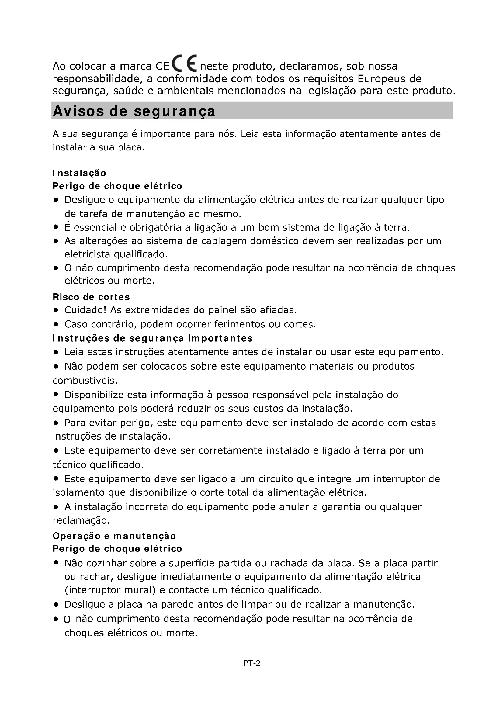 - O não cumprimento desta recomendação pode resultar na ocorrência de choques elétricos ou morte. PT-2Perigo para a saúde