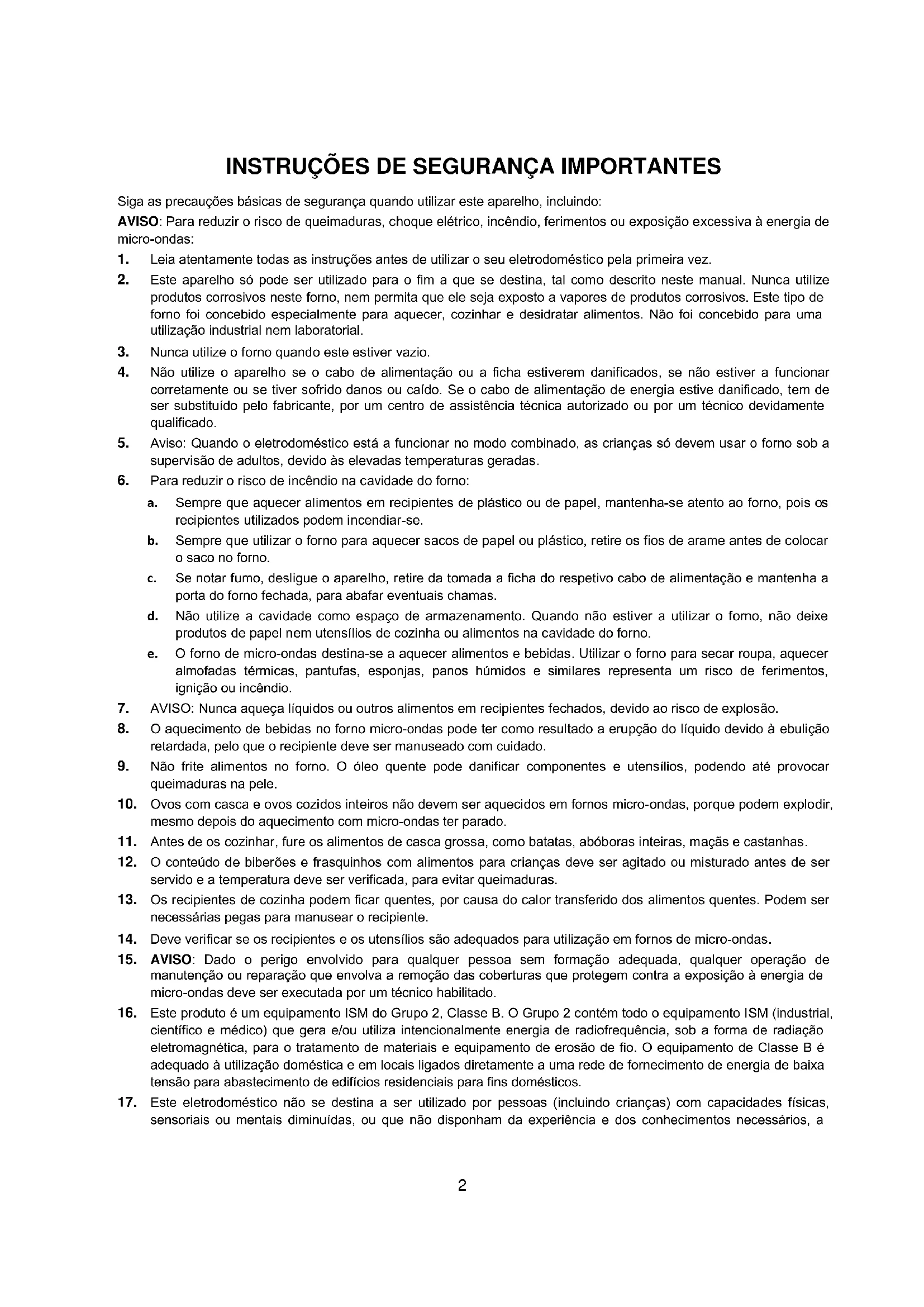 Siga as precauções básicas de segurança quando utilizar este aparelho, incluindo: AVISO: Para reduzir o risco de queimaduras, choque elétrico, incêndio, ferimentos ou exposição excessiva à energia de micro-ondas: