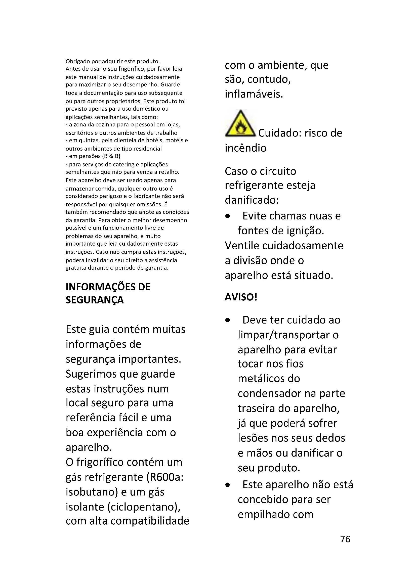 SEGURANÇA Este guia contém muitas informações de segurança importantes. Sugerimos que guarde estas instruções num local seguro para uma referência fácil e uma boa experiência com o aparelho. O frigorífico contém um gás refrigerante (R600a: isobutano) e um gás isolante (ciclopentano), com alta compatibilidade com o ambiente, que são, contudo, inflamáveis. Cuidado: risco de incêndio Caso o circuito refrigerante esteja danificado: