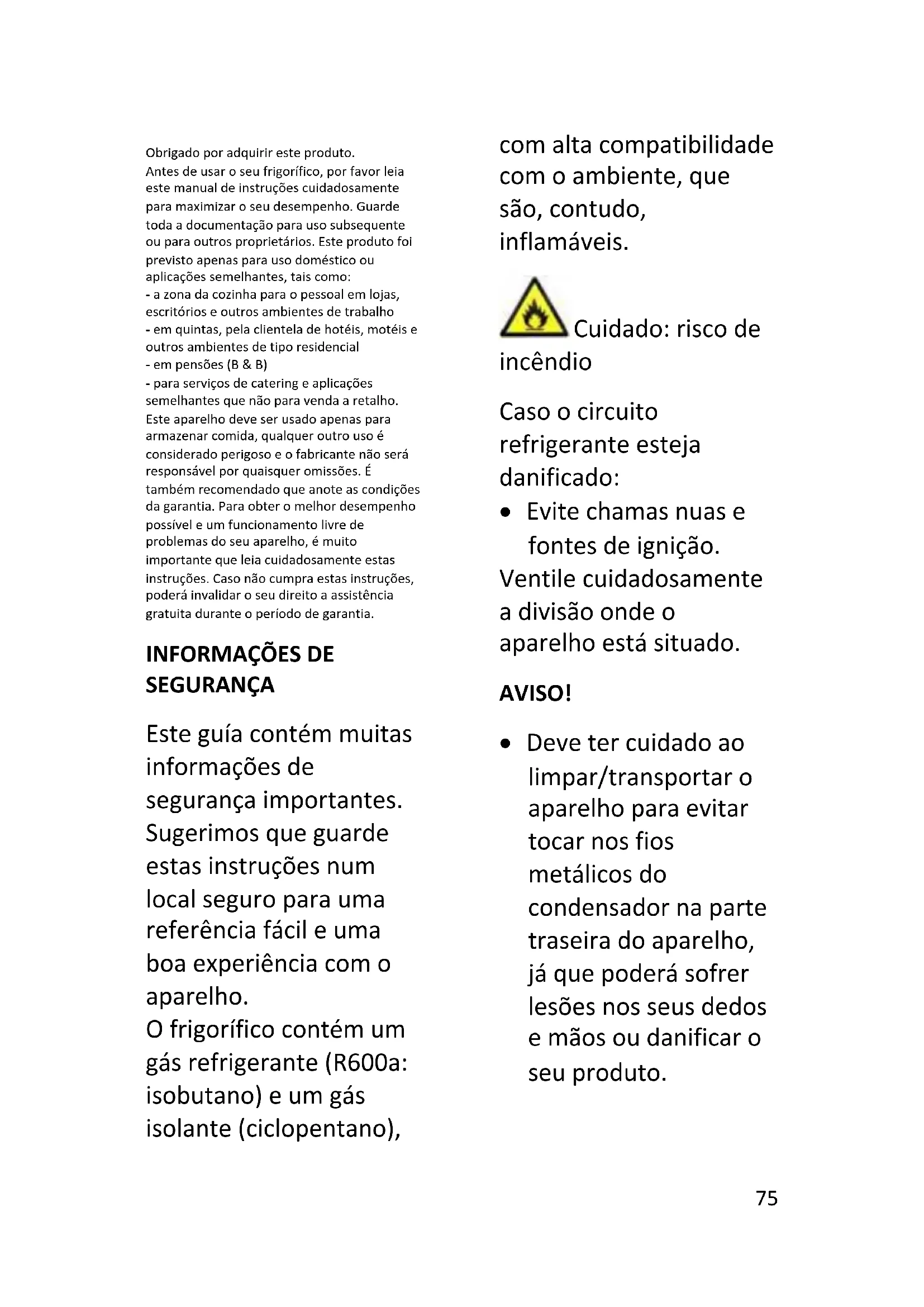 SEGURANÇA Este guía contém muitas informações de segurança importantes. Sugerimos que guarde estas instruções num local seguro para uma referência fácil e uma boa experiência com o aparelho. O frigorífico contém um gás refrigerante (R600a: isobutano) e um gás isolante (ciclopentano), com alta compatibilidade com o ambiente, que são, contudo, inflamáveis. Cuidado: risco de incêndio Caso o circuito refrigerante esteja danificado: