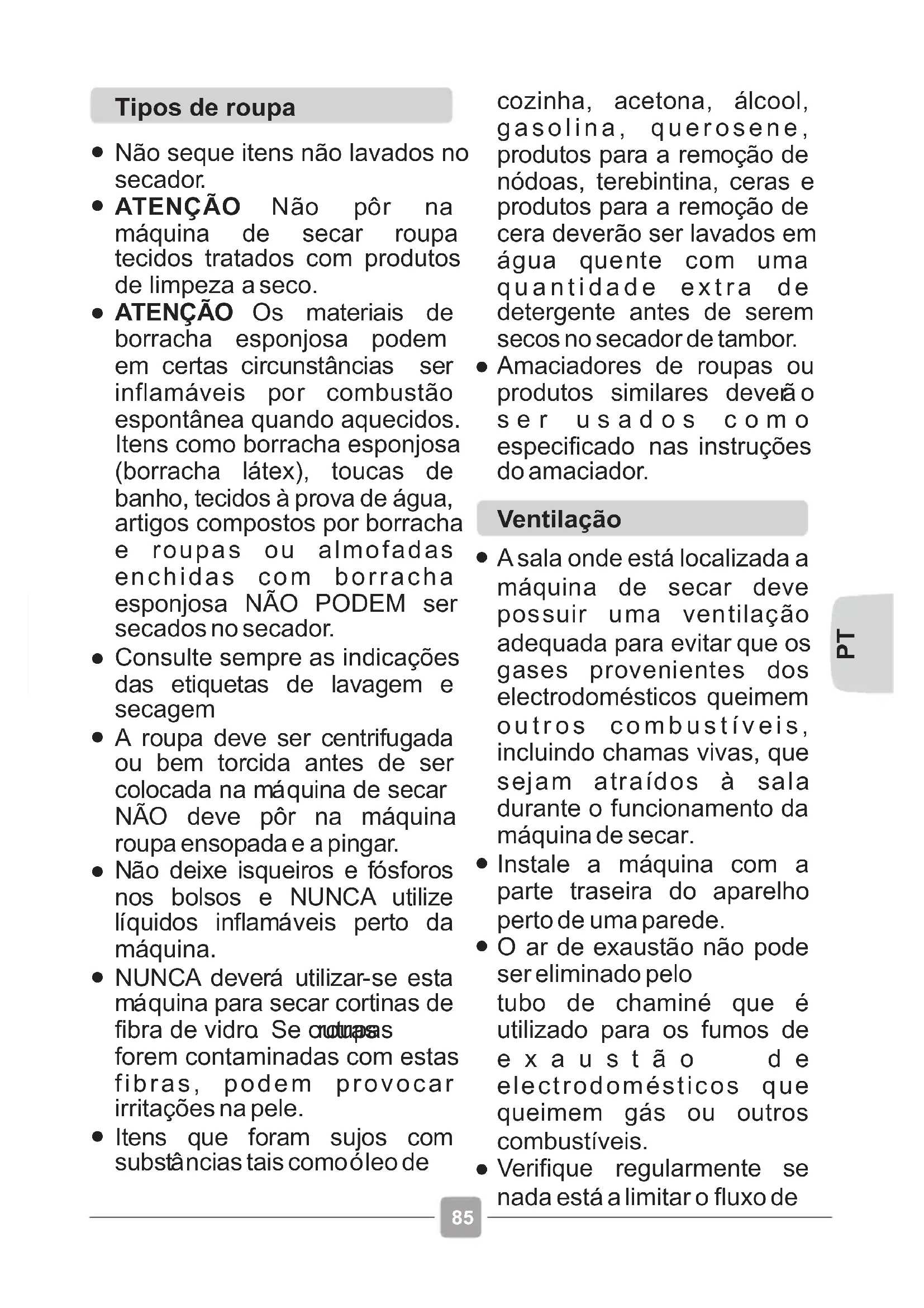 ATENÇÃO Não pôr na máquina de secar roupa tecidos tratados com produtos de limpeza a seco. ATENÇÃO Os materiais de borracha esponjosa podem em certas circunstâncias ser inflamáveis por combustão espontânea quando aquecidos. Itens como borracha esponjosa (borracha látex), toucas de banho, tecidos à prova de água, artigos compostos por borracha e roupas ou almofadas en chidas com borracha esponjosa NÃO PODEM ser secados no secador. Consulte sempre as indicações das etiquetas de lavagem e secagem