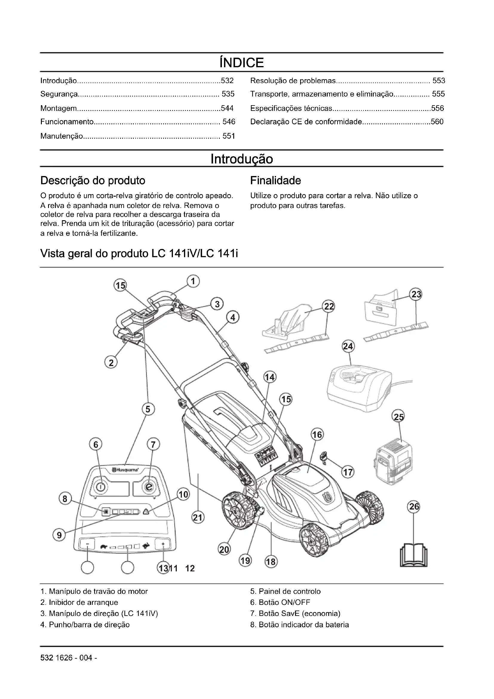 Símbolos no produto Uma utilização não cuidadosa e incorreta poderá provocar ferimentos ou a morte 1626 - 004 - 533do operador ou de terceiros. Leia o manual do operador e certifique-se de que compreende as instruções antes de utilizar este produto. Mantenha as pessoas e os animais a uma distância de segurança da área de trabalho. Tenha cuidado com objetos projetados e ricochetes. Aviso: Mantenha as mãos e os pés afastados da lâmina rotativa. Aviso: Mantenha as mãos e os pés afastados das peças rotativas. Retire a chave de segurança antes de efetuar a manutenção do produto. (modelo LC 141iV/LC 141i) Desligue o produto da tomada elétrica antes de realizar tarefas de manutenção no mesmo. (modelo LC 141C) IPX1 - O produto possui proteção contra gotas de água (modelo LC 141iV/LC 141i) IPX4 - O produto possui proteção contra salpicos de água (modelo LC 141C) Não permita que caia chuva sobre o produto (modelo LC 141iV/ LC 141i) Aviso: Não utilize o produto sobre o cabo de alimentação, uma vez que tal pode provocar um choque elétrico ou danos no produto. (modelo LC 141C) Este produto está em conformidade com as diretivas aplicáveis da CE. Emissões de ruído para o meio ambiente conforme diretiva da Comunidade Europeia. As emissões do produto são indicadas no capítulo de Especificações técnicas e na etiqueta. 534 1626 - 004 -Corrente contínua. 36 V Isolamento duplo. Recicle este produto numa localização de reciclagem pa- ra equipamen- tos elétricos e eletrónicos. (Válido unica- mente na Euro- pa) Procedimento de arranque para o modelo LC 141iV/ LC 141i: prima o botão ON/ OFF, solte o inibidor de ar- ranque, empur- re o manípulo de travão do motor para bai- xo. Procedimento de arranque para o modelo LC 141C: desaperte o inibidor de arranque e empurre o punho do travão do motor para baixo. Solte o manípulo de travão do motor para parar. Lento Rápido Código para leitura Nota: Os restantes símbolos/autocolantes existentes no produto dizem respeito às exigências de homologação de alguns países. Responsabilidade pelo produto Como referido nas leis de responsabilidade pelo produto, não somos responsáveis por danos causados pelo nosso produto se: