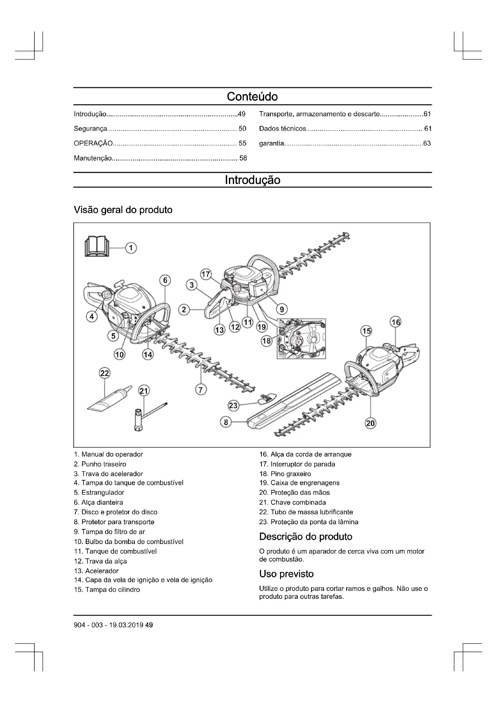 Descrição do produto O produto é um aparador de cerca viva com um motor de combustão. Uso previsto Utilize o produto para cortar ramos e galhos. Não use o produto para outras tarefas.