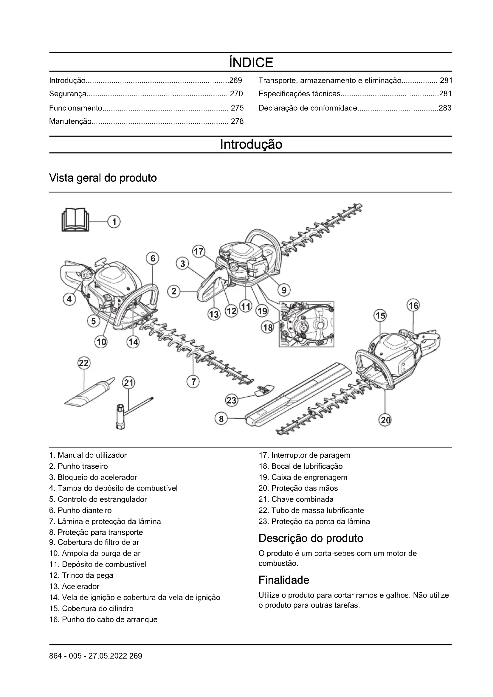 Descrição do produto O produto é um corta-sebes com um motor de combustão. Finalidade Utilize o produto para cortar ramos e galhos. Não utilize o produto para outras tarefas.