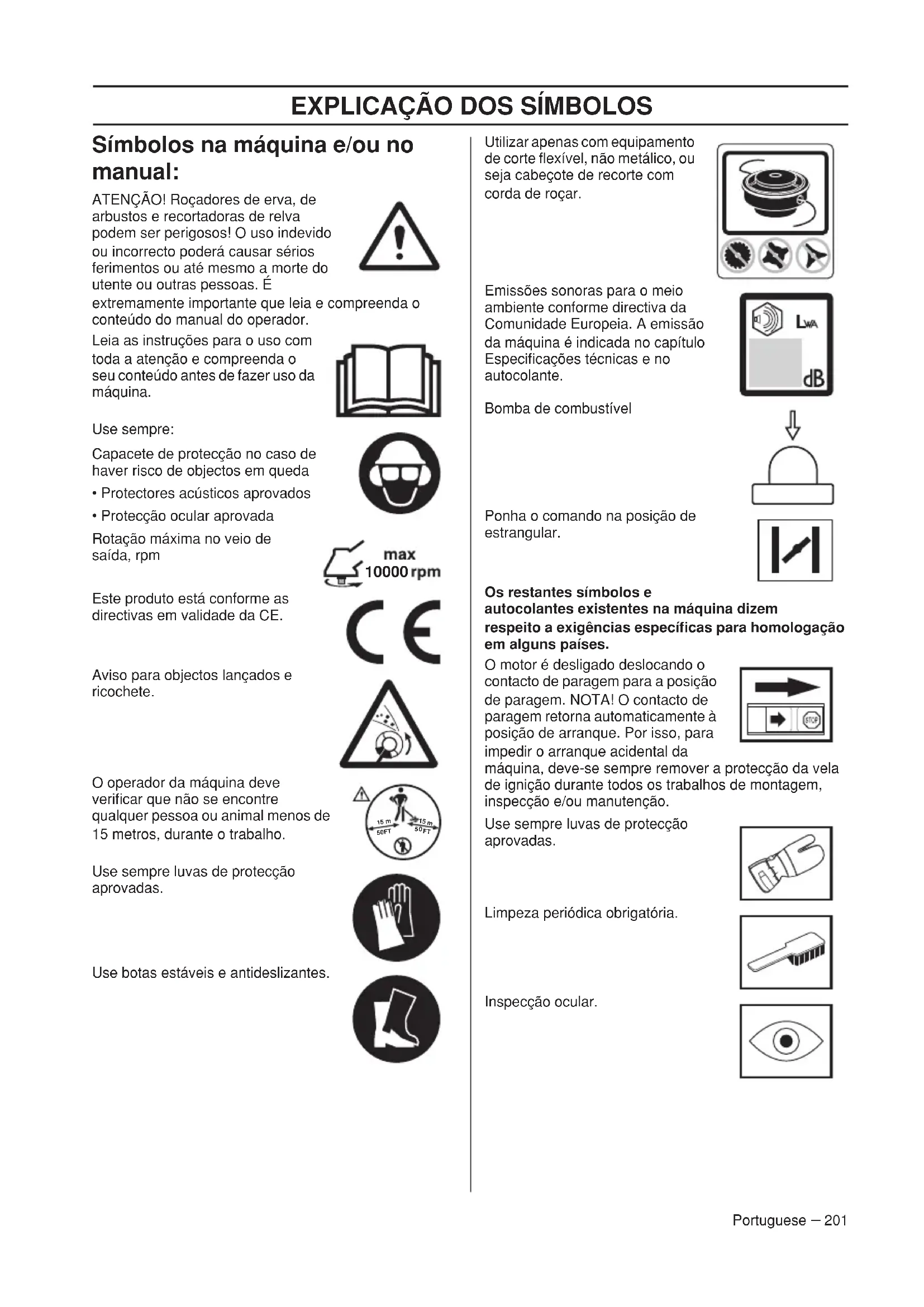 - Protecção ocular aprovada Rotação máxima no veio de saída, rpm Este produto está conforme as directivas em validade da CE. Aviso para objectos lançados e ricochete. O operador da máquina deve verificar que não se encontre qualquer pessoa ou animal menos de 15 metros, durante o trabalho. Use sempre luvas de protecção aprovadas. Use botas estáveis e antideslizantes. Utilizar apenas com equipamento de corte flexível, não metálico, ou seja cabeçote de recorte com corda de roçar. Emissões sonoras para o meio ambiente conforme directiva da Comunidade Europeia. A emissão da máquina é indicada no capítulo Especificações técnicas e no autocolante. Bomba de combustível Ponha o comando na posição de estrangular. Os restantes símbolos e autocolantes existentes na máquina dizem respeito a exigências específicas para homologação em alguns países. O motor é desligado deslocando o contacto de paragem para a posição de paragem. NOTA! O contacto de paragem retorna automaticamente à posição de arranque. Por isso, para impedir o arranque acidental da máquina, deve-se sempre remover a protecção da vela de ignição durante todos os trabalhos de montagem, inspecção e/ou manutenção. Use sempre luvas de protecção aprovadas. Limpeza periódica obrigatória. Inspecção ocular.