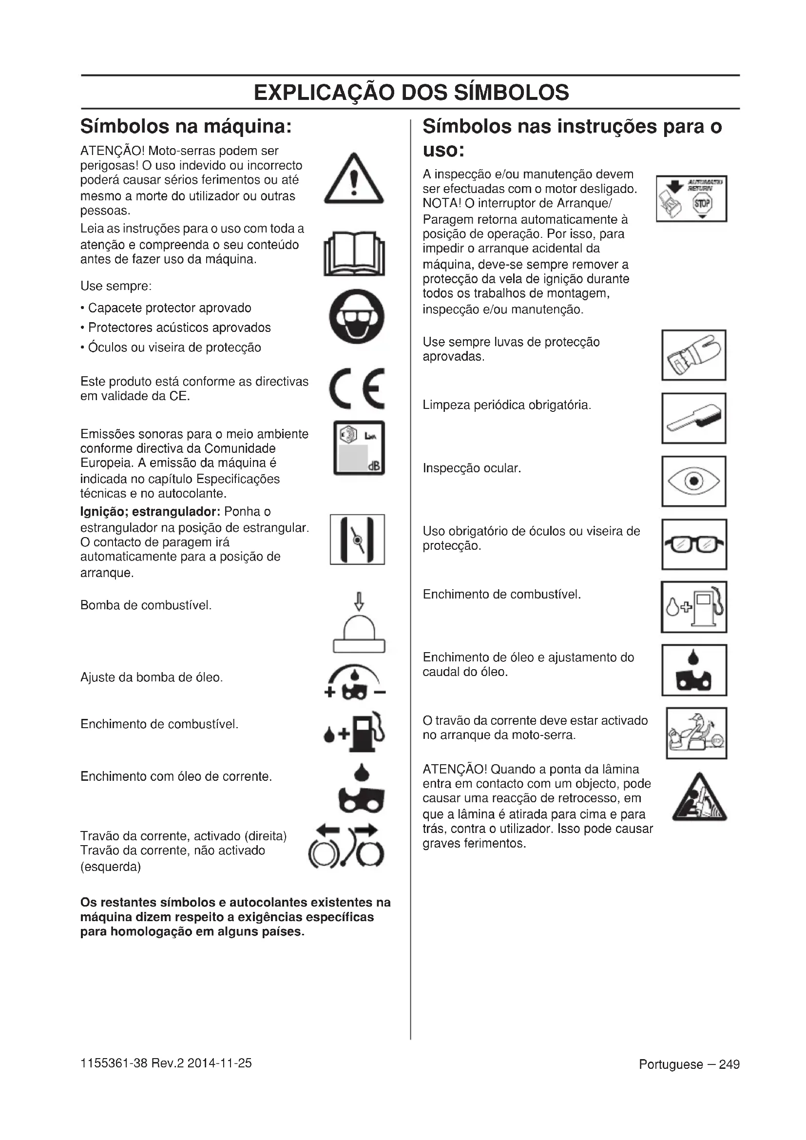 - Óculos ou viseira de protecção Este produto está conforme as directivas em validade da CE. Emissões sonoras para o meio ambiente conforme directiva da Comunidade Europeia. A emissão da máquina é indicada no capítulo Especificações técnicas e no autocolante. Ignição; estrangulador: Ponha o estrangulador na posição de estrangular. O contacto de paragem irá automaticamente para a posição de arranque. Bomba de combustível. Ajuste da bomba de óleo. Enchimento de combustível. Enchimento com óleo de corrente. Travão da corrente, activado (direita) Travão da corrente, não activado (esquerda) Os restantes símbolos e autocolantes existentes na máquina dizem respeito a exigências específicas para homologação em alguns países. Símbolos nas instruções para o uso: A inspecção e/ou manutenção devem ser efectuadas com o motor desligado. NOTA! O interruptor de Arranque/ Paragem retorna automaticamente à posição de operação. Por isso, para impedir o arranque acidental da máquina, deve-se sempre remover a protecção da vela de ignição durante todos os trabalhos de montagem, inspecção e/ou manutenção. Use sempre luvas de protecção aprovadas. Limpeza periódica obrigatória. Inspecção ocular. Uso obrigatório de óculos ou viseira de protecção. Enchimento de combustível. Enchimento de óleo e ajustamento do caudal do óleo. O travão da corrente deve estar activado no arranque da moto-serra. ATENÇÃO! Quando a ponta da lâmina entra em contacto com um objecto, pode causar uma reacção de retrocesso, em que a lâmina é atirada para cima e para trás, contra o utilizador. Isso pode causar graves ferimentos.ÍNDICE 250 – Portuguese 1155361-38 Rev.2 2014-11-25 Índice