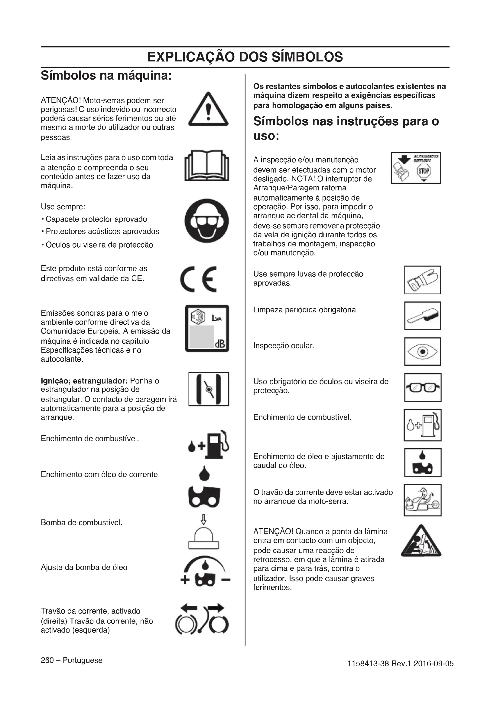 - Óculos ou viseira de protecção Este produto está conforme as directivas em validade da CE. Emissões sonoras para o meio ambiente conforme directiva da Comunidade Europeia. A emissão da máquina é indicada no capítulo Especificações técnicas e no autocolante. Ignição; estrangulador: Ponha o estrangulador na posição de estrangular. O contacto de paragem irá automaticamente para a posição de arranque. Enchimento de combustível. Enchimento com óleo de corrente. Bomba de combustível. Ajuste da bomba de óleo Travão da corrente, activado (direita) Travão da corrente, não activado (esquerda) Os restantes símbolos e autocolantes existentes na máquina dizem respeito a exigências específicas para homologação em alguns países. Símbolos nas instruções para o uso: A inspecção e/ou manutenção devem ser efectuadas com o motor desligado. NOTA! O interruptor de Arranque/Paragem retorna automaticamente à posição de operação. Por isso, para impedir o arranque acidental da máquina, deve-se sempre remover a protecção da vela de ignição durante todos os trabalhos de montagem, inspecção e/ou manutenção. Use sempre luvas de protecção aprovadas. Limpeza periódica obrigatória. Inspecção ocular. Uso obrigatório de óculos ou viseira de protecção. Enchimento de combustível. Enchimento de óleo e ajustamento do caudal do óleo. O travão da corrente deve estar activado no arranque da moto-serra. ATENÇÃO! Quando a ponta da lâmina entra em contacto com um objecto, pode causar uma reacção de retrocesso, em que a lâmina é atirada para cima e para trás, contra o utilizador. Isso pode causar graves ferimentos.ÍNDICE Portuguese – 261 1158413-38 Rev.1 2016-09-05 Índice