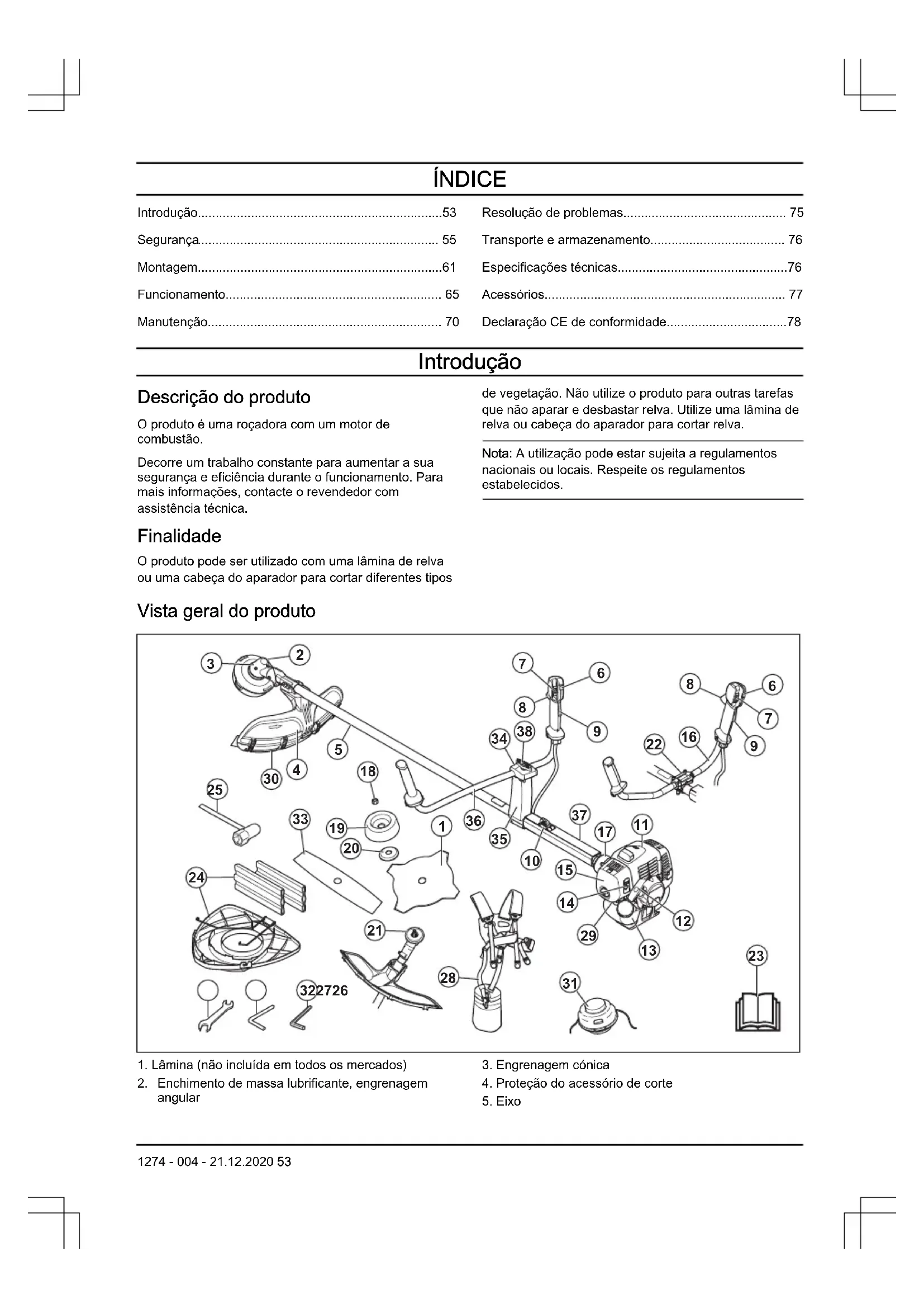 - Declaração CE de conformidade Introdução Descrição do produto O produto é uma roçadora com um motor de combustão. Decorre um trabalho constante para aumentar a sua segurança e eficiência durante o funcionamento. Para mais informações, contacte o revendedor com assistência técnica. Finalidade O produto pode ser utilizado com uma lâmina de relva ou uma cabeça do aparador para cortar diferentes tipos de vegetação. Não utilize o produto para outras tarefas que não aparar e desbastar relva. Utilize uma lâmina de relva ou cabeça do aparador para cortar relva. Nota: A utilização pode estar sujeita a regulamentos nacionais ou locais. Respeite os regulamentos estabelecidos. Vista geral do produto p. 78
