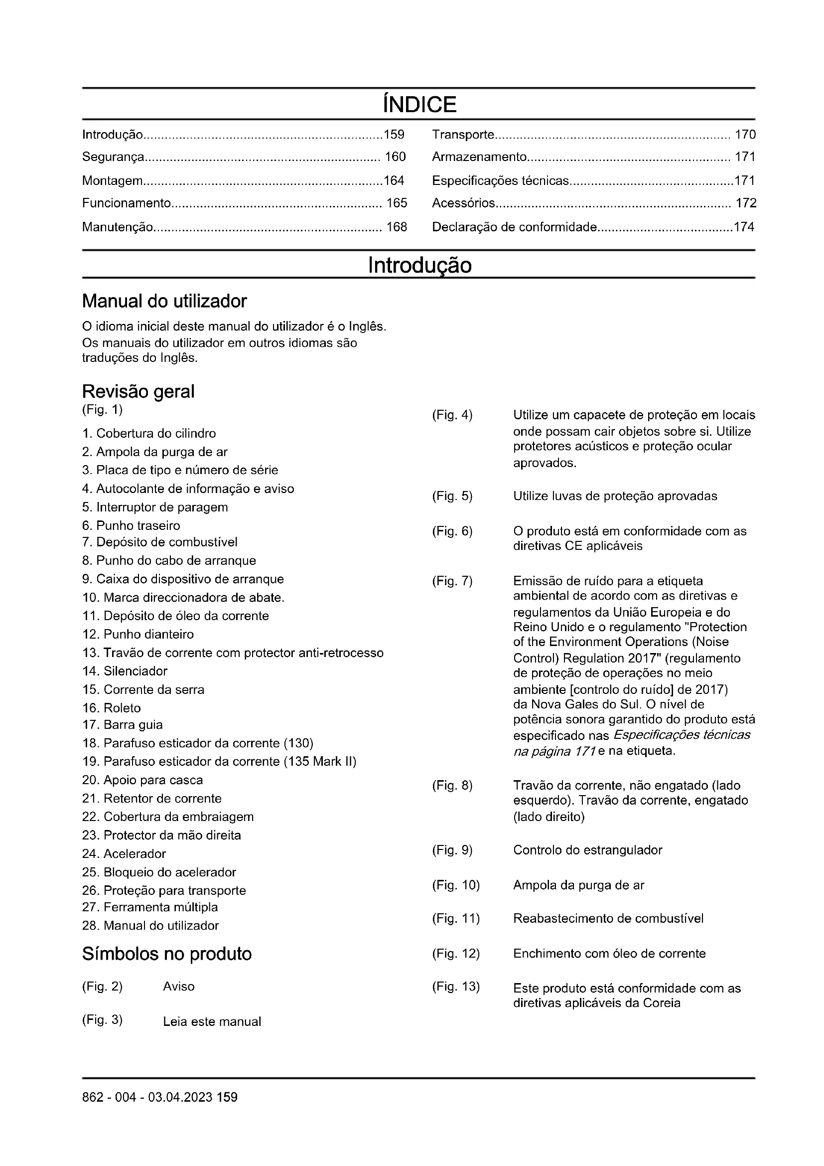Símbolos no produto (Fig. 2) Aviso (Fig. 3) Leia este manual (Fig. 4) Utilize um capacete de proteção em locais onde possam cair objetos sobre si. Utilize protetores acústicos e proteção ocular aprovados. (Fig. 5) Utilize luvas de proteção aprovadas (Fig. 6) O produto está em conformidade com as diretivas CE aplicáveis (Fig. 7) Emissão de ruído para a etiqueta ambiental de acordo com as diretivas e regulamentos da União Europeia e do Reino Unido e o regulamento "Protection of the Environment Operations (Noise Control) Regulation 2017" (regulamento de proteção de operações no meio ambiente [controlo do ruído] de 2017) da Nova Gales do Sul. O nível de potência sonora garantido do produto está especificado nas Especificações técnicas na página 171 e na etiqueta. (Fig. 8) Travão da corrente, não engatado (lado esquerdo). Travão da corrente, engatado (lado direito) (Fig. 9) Controlo do estrangulador (Fig. 10) Ampola da purga de ar (Fig. 11) Reabastecimento de combustível (Fig. 12) Enchimento com óleo de corrente (Fig. 13) Este produto está conformidade com as diretivas aplicáveis da Coreia