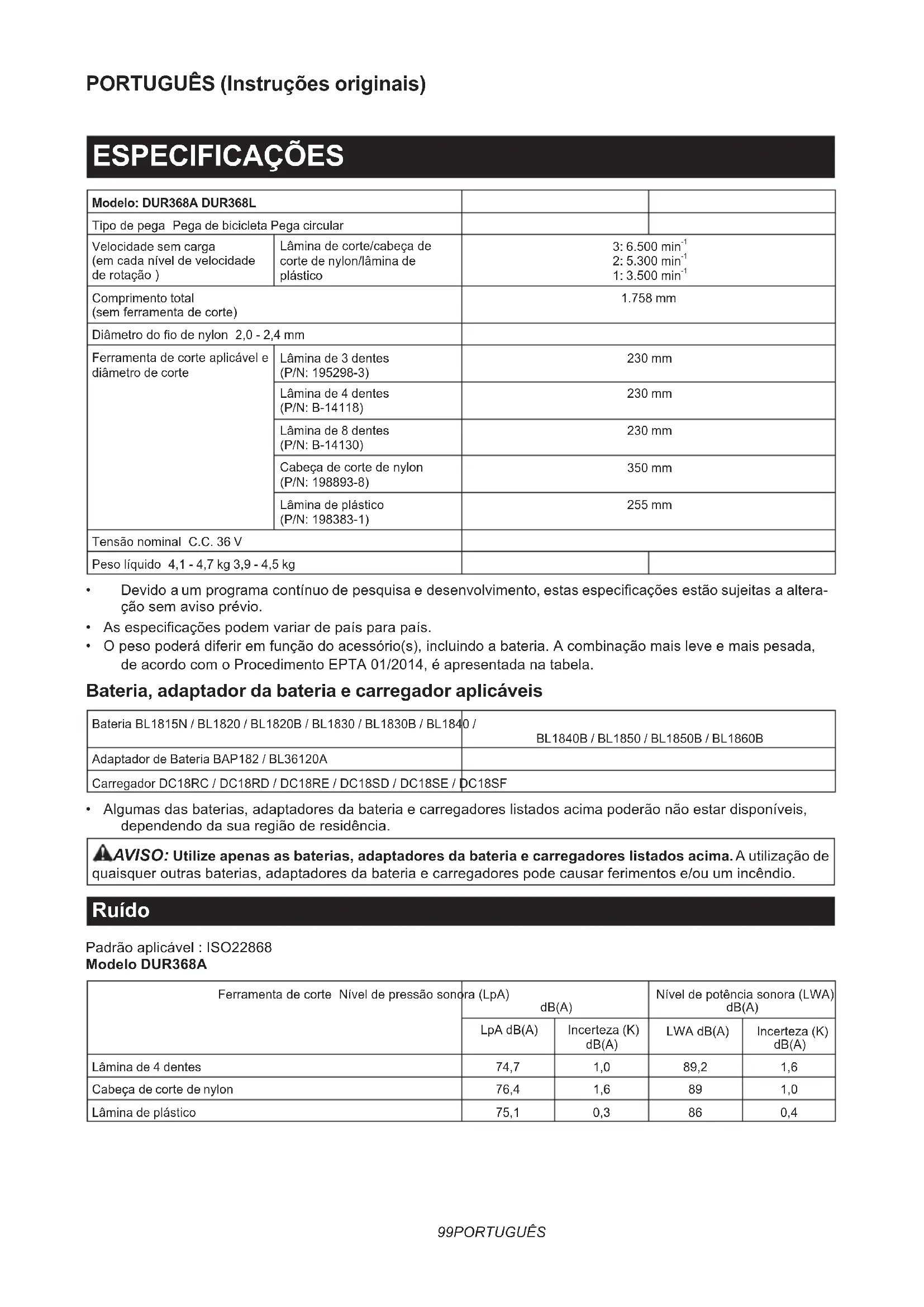 - Algumasdasbaterias,adaptadoresdabateriaecarregadoreslistadosacimapoderãonãoestardisponíveis, dependendodasuaregiãoderesidência. AVISO: Utilize apenas as baterias, adaptadores da bateria e carregadores listados acima.Autilizaçãode quaisqueroutrasbaterias,adaptadoresdabateriaecarregadorespodecausarferimentose/ouumincêndio. Ruído Padrãoaplicável:ISO22868 Modelo DUR368A Ferramentadecorte Níveldepressãosonora(LpA)dB(A)Níveldepotênciasonora(LWA)dB(A)LpA dB(A) Incerteza (K)dB(A)LWAdB(A) Incerteza (K)dB(A) Lâmina de 4 dentes 74,7 1,0 89,2 1,6 Cabeçadecortedenylon 76,4 1,6 89 1,0 Lâmina de plástico 75,1 0,3 86 0,4100 PORTUGUÊS Modelo DUR368L Ferramentadecorte Níveldepressãosonora(LpA) dB(A) Níveldepotênciasonora(LWA) dB(A) LpA dB(A) Incerteza (K) dB(A) LWAdB(A) Incerteza (K) dB(A) Lâmina de 4 dentes 74,7 1,0 89,2 1,6 Cabeçadecortedenylon 76,4 1,6 89 1,0 Lâmina de plástico 75,1 0,3 86 0,4