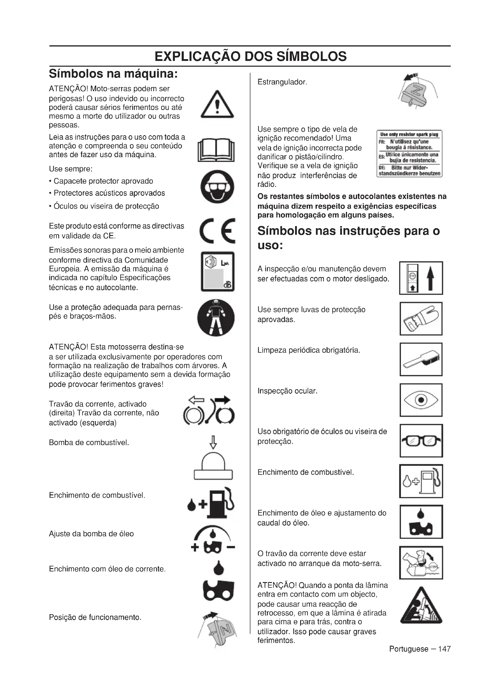 Portuguese – 147 Símbolos na máquina: ATENÇÃO! Moto-serras podem ser perigosas! O uso indevido ou incorrecto poderá causar sérios ferimentos ou até mesmo a morte do utilizador ou outras pessoas. Leia as instruções para o uso com toda a atenção e compreenda o seu conteúdo antes de fazer uso da máquina. Use sempre: