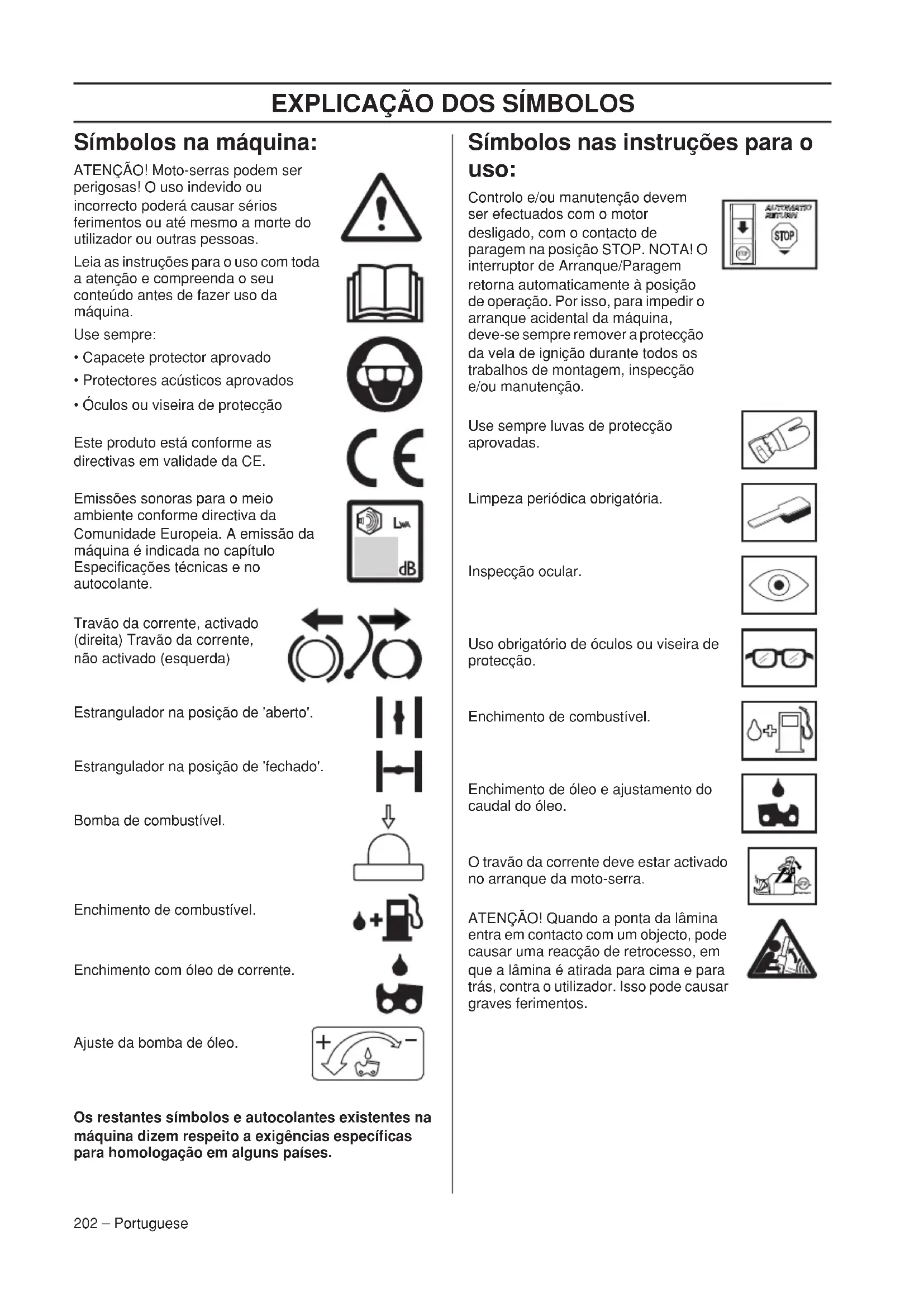 H1155951-39,439,west,R2.fm Page 201 Tuesday, October 22, 2013 11:29 AMEXPLICAÇÃO DOS SÍMBOLOS 202 – Portuguese Símbolos na máquina: ATENÇÃO! Moto-serras podem ser perigosas! O uso indevido ou incorrecto poderá causar sérios ferimentos ou até mesmo a morte do utilizador ou outras pessoas. Leia as instruções para o uso com toda a atenção e compreenda o seu conteúdo antes de fazer uso da máquina. Use sempre: