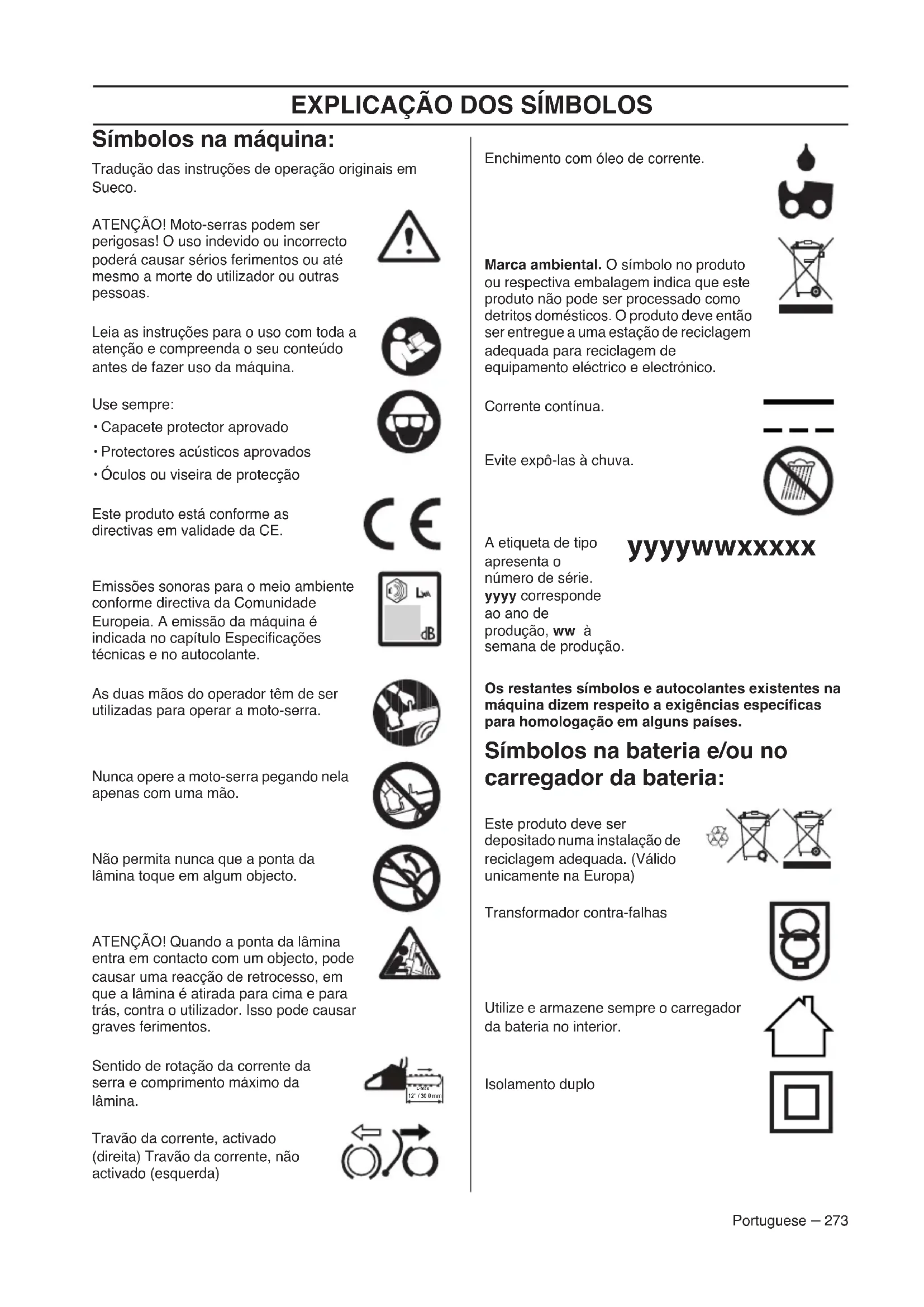 Portuguese – 273 Símbolos na máquina: Tradução das instruções de operação originais em Sueco. ATENÇÃO! Moto-serras podem ser perigosas! O uso indevido ou incorrecto poderá causar sérios ferimentos ou até mesmo a morte do utilizador ou outras pessoas. Leia as instruções para o uso com toda a atenção e compreenda o seu conteúdo antes de fazer uso da máquina. Use sempre: