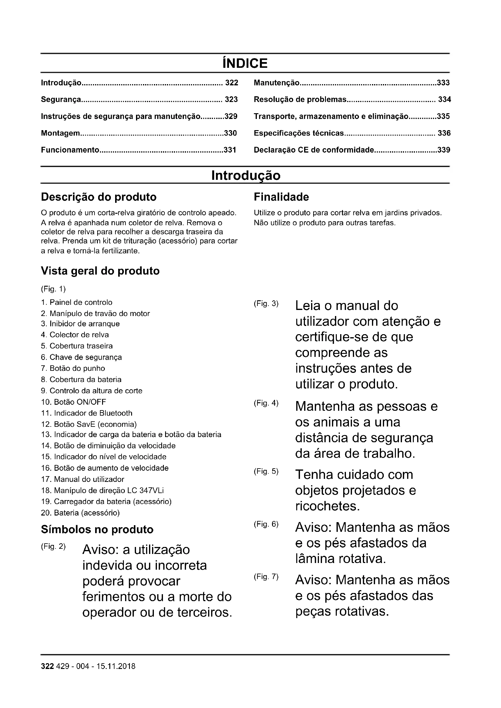 Símbolos no produto (Fig. 2) Aviso: a utilização indevida ou incorreta poderá provocar ferimentos ou a morte do operador ou de terceiros. (Fig. 3) Leia o manual do utilizador com atenção e certifique-se de que compreende as instruções antes de utilizar o produto. (Fig. 4) Mantenha as pessoas e os animais a uma distância de segurança da área de trabalho. (Fig. 5) Tenha cuidado com objetos projetados e ricochetes. (Fig. 6) Aviso: Mantenha as mãos e os pés afastados da lâmina rotativa. (Fig. 7) Aviso: Mantenha as mãos e os pés afastados das peças rotativas. 322 429 - 004 - 15.11.2018(Fig. 8) Retire a chave de segurança antes de efetuar trabalhos de reparação ou manutenção. (Fig. 9) IPX1 - proteção contra gotejamento (Fig. 10) Não expor à chuva (Fig. 1) O produto está em conformidade com as diretivas CE aplicáveis. (Fig. 12) Emissões de ruído para o meio ambiente conforme diretiva da Comunidade Europeia. As emissões do produto são indicadas no capítulo de Especificações técnicas e na etiqueta. (Fig. 16) Procedimento de arran- que: prima o botão ON/ OFF, desaperte o inibidor de arranque e empurre o punho do travão do motor para baixo. (Fig. 13) Solte o manípulo de travão do motor para parar. (Fig. 14) Lento (Fig. 15) Rápido Nota: Os restantes símbolos/autocolantes existentes no produto dizem respeito às exigências de homologação de alguns países. Responsabilidade pelo produto Como referido nas leis de responsabilidade pelo produto, não somos responsáveis por danos causados pelo nosso produto se: