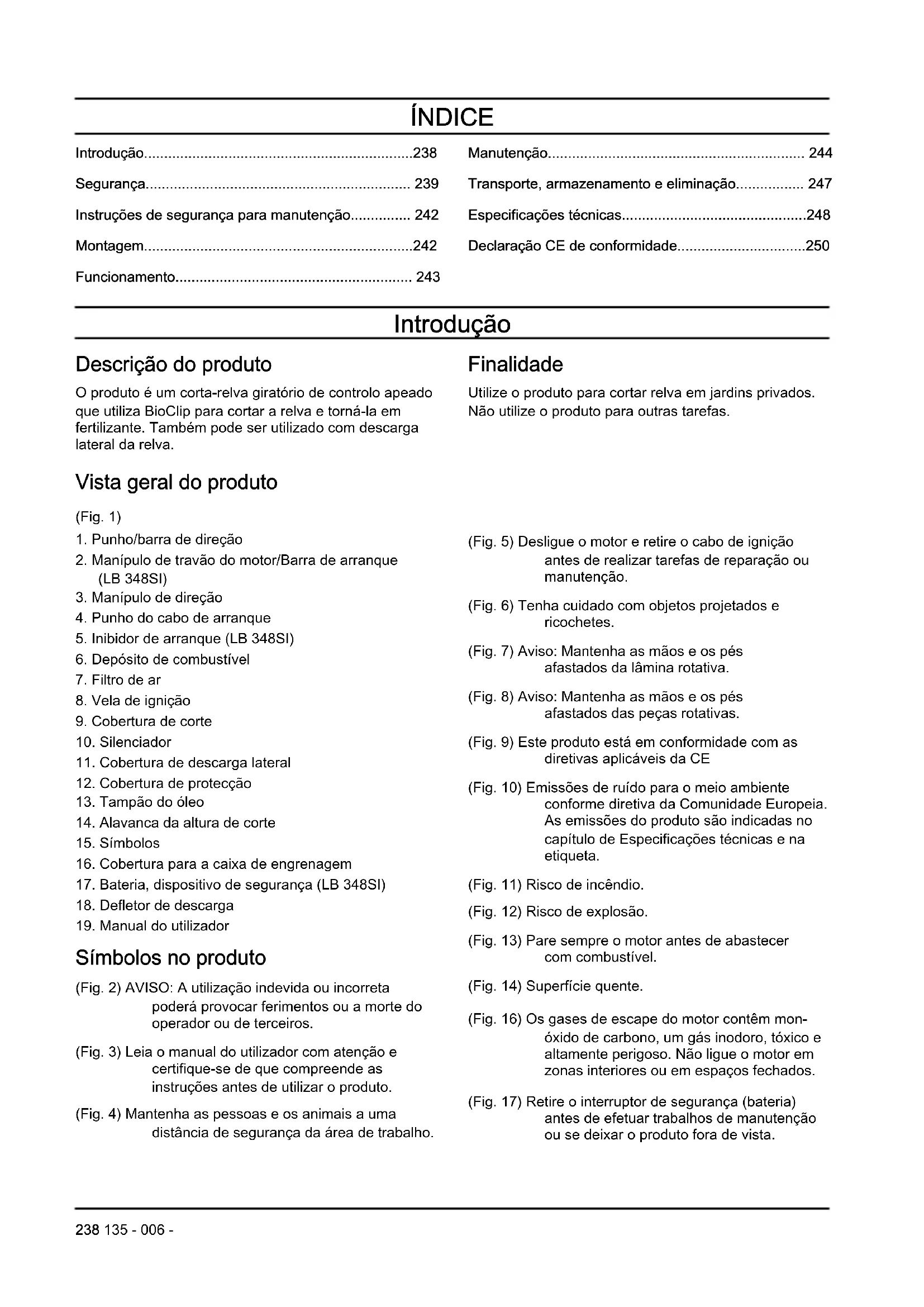 Símbolos no produto (Fig. 2) AVISO: A utilização indevida ou incorreta poderá provocar ferimentos ou a morte do operador ou de terceiros. (Fig. 3) Leia o manual do utilizador com atenção e certifique-se de que compreende as instruções antes de utilizar o produto. (Fig. 4) Mantenha as pessoas e os animais a uma distância de segurança da área de trabalho. (Fig. 5) Desligue o motor e retire o cabo de ignição antes de realizar tarefas de reparação ou manutenção. (Fig. 6) Tenha cuidado com objetos projetados e ricochetes. (Fig. 7) Aviso: Mantenha as mãos e os pés afastados da lâmina rotativa. (Fig. 8) Aviso: Mantenha as mãos e os pés afastados das peças rotativas. (Fig. 9) Este produto está em conformidade com as diretivas aplicáveis da CE (Fig. 10) Emissões de ruído para o meio ambiente conforme diretiva da Comunidade Europeia. As emissões do produto são indicadas no capítulo de Especificações técnicas e na etiqueta. (Fig. 11) Risco de incêndio. (Fig. 12) Risco de explosão. (Fig. 13) Pare sempre o motor antes de abastecer com combustível. (Fig. 14) Superfície quente. (Fig. 16) Os gases de escape do motor contêm mon- óxido de carbono, um gás inodoro, tóxico e altamente perigoso. Não ligue o motor em zonas interiores ou em espaços fechados. (Fig. 17) Retire o interruptor de segurança (bateria) antes de efetuar trabalhos de manutenção ou se deixar o produto fora de vista. 238 135 - 006 -(Fig. 18) Procedimento de arranque para LB 248S, LB 253S: Empurre o manípulo de travão do motor para baixo e puxe o punho do cabo de arranque. (Fig. 19) Procedimento de arranque para LB 348SI: Solte o inibidor de arranque e empurre a barra de arranque para baixo. (Fig. 15) Código para leitura. Nota: Os restantes símbolos/autocolantes existentes no produto dizem respeito a requisitos para homologação em algumas áreas comerciais. Responsabilidade pelo produto Como referido nas leis de responsabilidade pelo produto, não somos responsáveis por danos causados pelo nosso produto se: