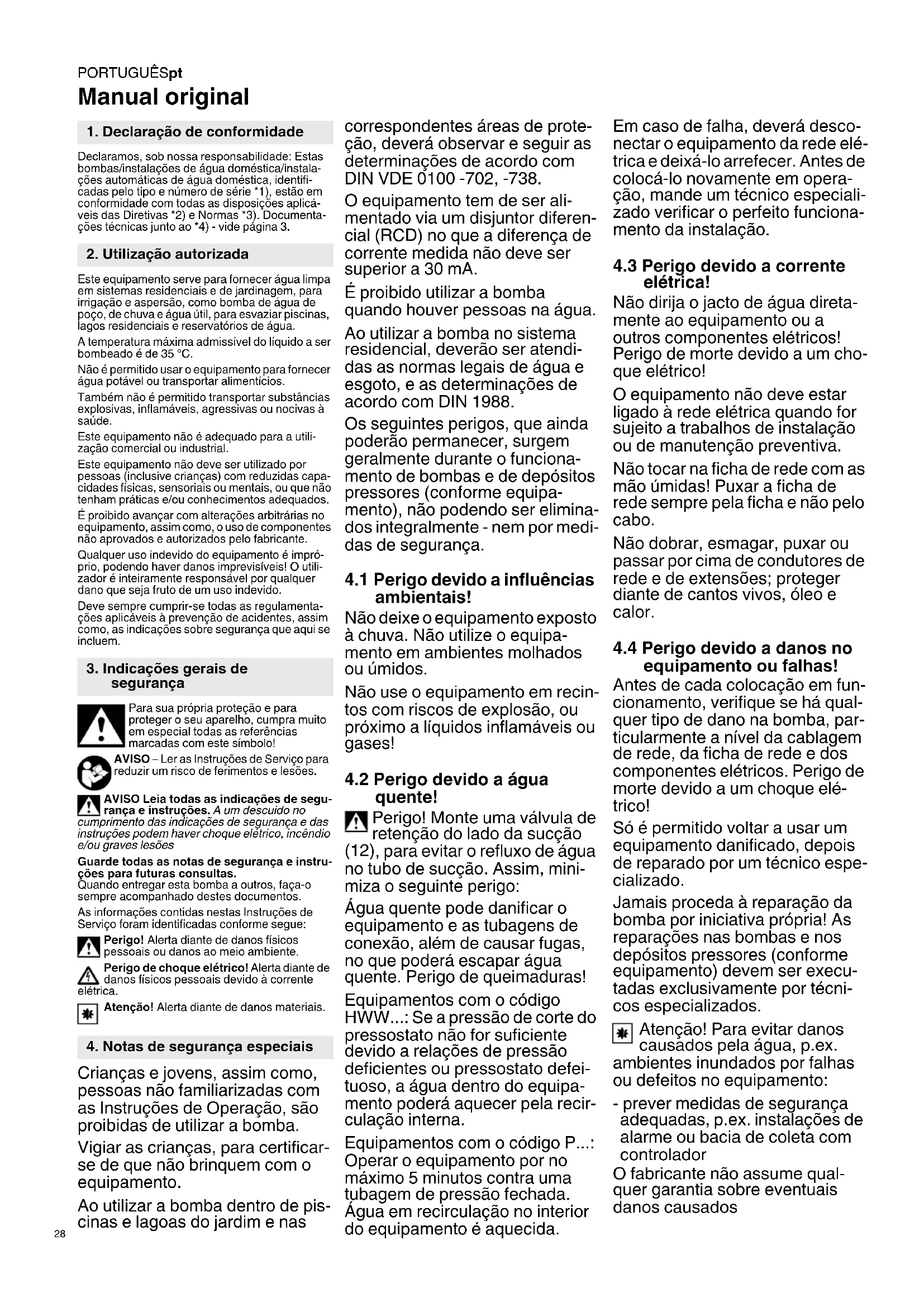 Manual original Declaramos, sob nossa responsabilidade: Estas bombas/instalações de água doméstica/instala- ções automáticas de água doméstica, identifi- cadas pelo tipo e número de série *1), estão em conformidade com todas as disposições aplicá- veis das Diretivas *2) e Normas *3). Documenta- ções técnicas junto ao *4) - vide página 3. Este equipamento serve para fornecer água limpa em sistemas residenciais e de jardinagem, para irrigação e aspersão, como bomba de água de poço, de chuva e água útil, para esvaziar piscinas, lagos residenciais e reservatórios de água. A temperatura máxima admissível do líquido a ser bombeado é de 35 °C. Não é permitido usar o equipamento para fornecer água potável ou transportar alimentícios. Também não é permitido transportar substâncias explosivas, inflamáveis, agressivas ou nocivas à saúde. Este equipamento não é adequado para a utili- zação comercial ou industrial. Este equipamento não deve ser utilizado por pessoas (inclusive crianças) com reduzidas capa- cidades físicas, sensoriais ou mentais, ou que não tenham práticas e/ou conhecimentos adequados. É proibido avançar com alterações arbitrárias no equipamento, assim como, o uso de componentes não aprovados e autorizados pelo fabricante. Qualquer uso indevido do equipamento é impró- prio, podendo haver danos imprevisíveis! O utili- zador é inteiramente responsável por qualquer dano que seja fruto de um uso indevido. Deve sempre cumprir-se todas as regulamenta- ções aplicáveis à prevenção de acidentes, assim como, as indicações sobre segurança que aqui se incluem. Para sua própria proteção e para proteger o seu aparelho, cumpra muito em especial todas as referências marcadas com este símbolo! AVISO – Ler as Instruções de Serviço para reduzir um risco de ferimentos e lesões. AVISO Leia todas as indicações de segu- rança e instruções. A um descuido no cumprimento das indicações de segurança e das instruções podem haver choque elétrico, incêndio e/ou graves lesões Guarde todas as notas de segurança e instru- ções para futuras consultas. Quando entregar esta bomba a outros, faça-o sempre acompanhado destes documentos. As informações contidas nestas Instruções de Serviço foram identificadas conforme segue: Perigo! Alerta diante de danos físicos pessoais ou danos ao meio ambiente. Perigo de choque elétrico! Alerta diante de danos físicos pessoais devido à corrente elétrica. Atenção! Alerta diante de danos materiais. Crianças e jovens, assim como, pessoas não familiarizadas com as Instruções de Operação, são proibidas de utilizar a bomba. Vigiar as crianças, para certificar- se de que não brinquem com o equipamento. Ao utilizar a bomba dentro de pis- cinas e lagoas do jardim e nas correspondentes áreas de prote- ção, deverá observar e seguir as determinações de acordo com DIN VDE 0100 -702, -738. O equipamento tem de ser ali- mentado via um disjuntor diferen- cial (RCD) no que a diferença de corrente medida não deve ser superior a 30 mA. É proibido utilizar a bomba quando houver pessoas na água. Ao utilizar a bomba no sistema residencial, deverão ser atendi- das as normas legais de água e esgoto, e as determinações de acordo com DIN 1988. Os seguintes perigos, que ainda poderão permanecer, surgem geralmente durante o funciona- mento de bombas e de depósitos pressores (conforme equipa- mento), não podendo ser elimina- dos integralmente - nem por medi- das de segurança.