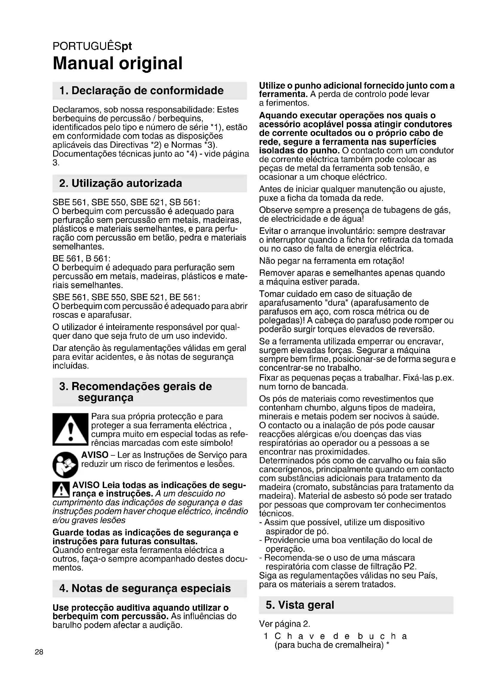 SBE 561, SBE 550, SBE 521, SB 561: O berbequim com percussão é adequado para perfuração sem percussão em metais, madeiras, plásticos e materiais semelhantes, e para perfu- ração com percussão em betão, pedra e materiais semelhantes. BE 561, B 561: O berbequim é adequado para perfuração sem percussão em metais, madeiras, plásticos e mate- riais semelhantes. SBE 561, SBE 550, SBE 521, BE 561: O berbequim com percussão é adequado para abrir roscas e aparafusar. O utilizador é inteiramente responsável por qual- quer dano que seja fruto de um uso indevido. Dar atenção às regulamentações válidas em geral para evitar acidentes, e às notas de segurança incluídas. Para sua própria protecção e para proteger a sua ferramenta eléctrica , cumpra muito em especial todas as refe- rências marcadas com este símbolo! AVISO – Ler as Instruções de Serviço para reduzir um risco de ferimentos e lesões. AVISO Leia todas as indicações de segu- rança e instruções. A um descuido no cumprimento das indicações de segurança e das instruções podem haver choque eléctrico, incêndio e/ou graves lesões Guarde todas as indicações de segurança e instruções para futuras consultas. Quando entregar esta ferramenta eléctrica a outros, faça-o sempre acompanhado destes docu- mentos. Use protecção auditiva aquando utilizar o berbequim com percussão. As influências do barulho podem afectar a audição. Utilize o punho adicional fornecido junto com a ferramenta. A perda de controlo pode levar a ferimentos. Aquando executar operações nos quais o acessório acoplável possa atingir condutores de corrente ocultados ou o próprio cabo de rede, segure a ferramenta nas superfícies isoladas do punho. O contacto com um condutor de corrente eléctrica também pode colocar as peças de metal da ferramenta sob tensão, e ocasionar a um choque eléctrico. Antes de iniciar qualquer manutenção ou ajuste, puxe a ficha da tomada da rede. Observe sempre a presença de tubagens de gás, de electricidade e de água! Evitar o arranque involuntário: sempre destravar o interruptor quando a ficha for retirada da tomada ou no caso de falta de energia eléctrica. Não pegar na ferramenta em rotação! Remover aparas e semelhantes apenas quando a máquina estiver parada. Tomar cuidado em caso de situação de aparafusamento "dura" (aparafusamento de parafusos em aço, com rosca métrica ou de polegadas)! A cabeça do parafuso pode romper ou poderão surgir torques elevados de reversão. Se a ferramenta utilizada emperrar ou encravar, surgem elevadas forças. Segurar a máquina sempre bem firme, posicionar-se de forma segura e concentrar-se no trabalho. Fixar as pequenas peças a trabalhar. Fixá-las p.ex. num torno de bancada. Os pós de materiais como revestimentos que contenham chumbo, alguns tipos de madeira, minerais e metais podem ser nocivos à saúde. O contacto ou a inalação de pós pode causar reacções alérgicas e/ou doenças das vias respiratórias ao operador ou a pessoas a se encontrar nas proximidades. Determinados pós como de carvalho ou faia são cancerígenos, principalmente quando em contacto com substâncias adicionais para tratamento da madeira (cromato, substâncias para tratamento da madeira). Material de asbesto só pode ser tratado por pessoas que comprovam ter conhecimentos técnicos. - Assim que possível, utilize um dispositivo aspirador de pó. - Providencie uma boa ventilação do local de operação. - Recomenda-se o uso de uma máscara respiratória com classe de filtração P2. Siga as regulamentações válidas no seu País, para os materiais a serem tratados. Ver página 2. 1Chave de bucha (para bucha de cremalheira) *