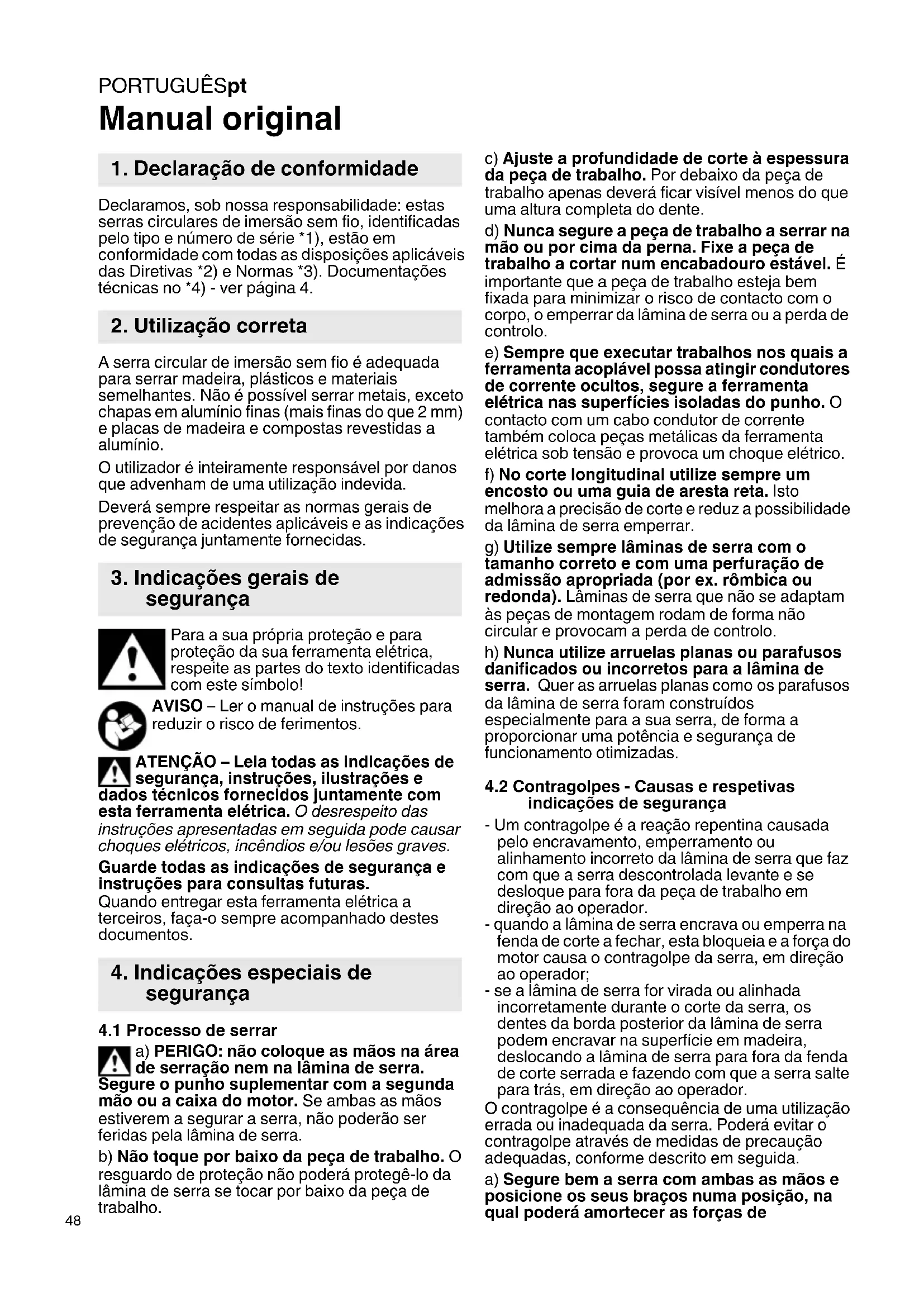 Manual original Declaramos, sob nossa responsabilidade: estas serras circulares de imersão sem fio, identificadas pelo tipo e número de série *1), estão em conformidade com todas as disposições aplicáveis das Diretivas *2) e Normas *3). Documentações técnicas no *4) - ver página 4. A serra circular de imersão sem fio é adequada para serrar madeira, plásticos e materiais semelhantes. Não é possível serrar metais, exceto chapas em alumínio finas (mais finas do que 2 mm) e placas de madeira e compostas revestidas a alumínio. O utilizador é inteiramente responsável por danos que advenham de uma utilização indevida. Deverá sempre respeitar as normas gerais de prevenção de acidentes aplicáveis e as indicações de segurança juntamente fornecidas. Para a sua própria proteção e para proteção da sua ferramenta elétrica, respeite as partes do texto identificadas com este símbolo! AVISO – Ler o manual de instruções para reduzir o risco de ferimentos. ATENÇÃO – Leia todas as indicações de segurança, instruções, ilustrações e dados técnicos fornecidos juntamente com esta ferramenta elétrica. O desrespeito das instruções apresentadas em seguida pode causar choques elétricos, incêndios e/ou lesões graves. Guarde todas as indicações de segurança e instruções para consultas futuras. Quando entregar esta ferramenta elétrica a terceiros, faça-o sempre acompanhado destes documentos.