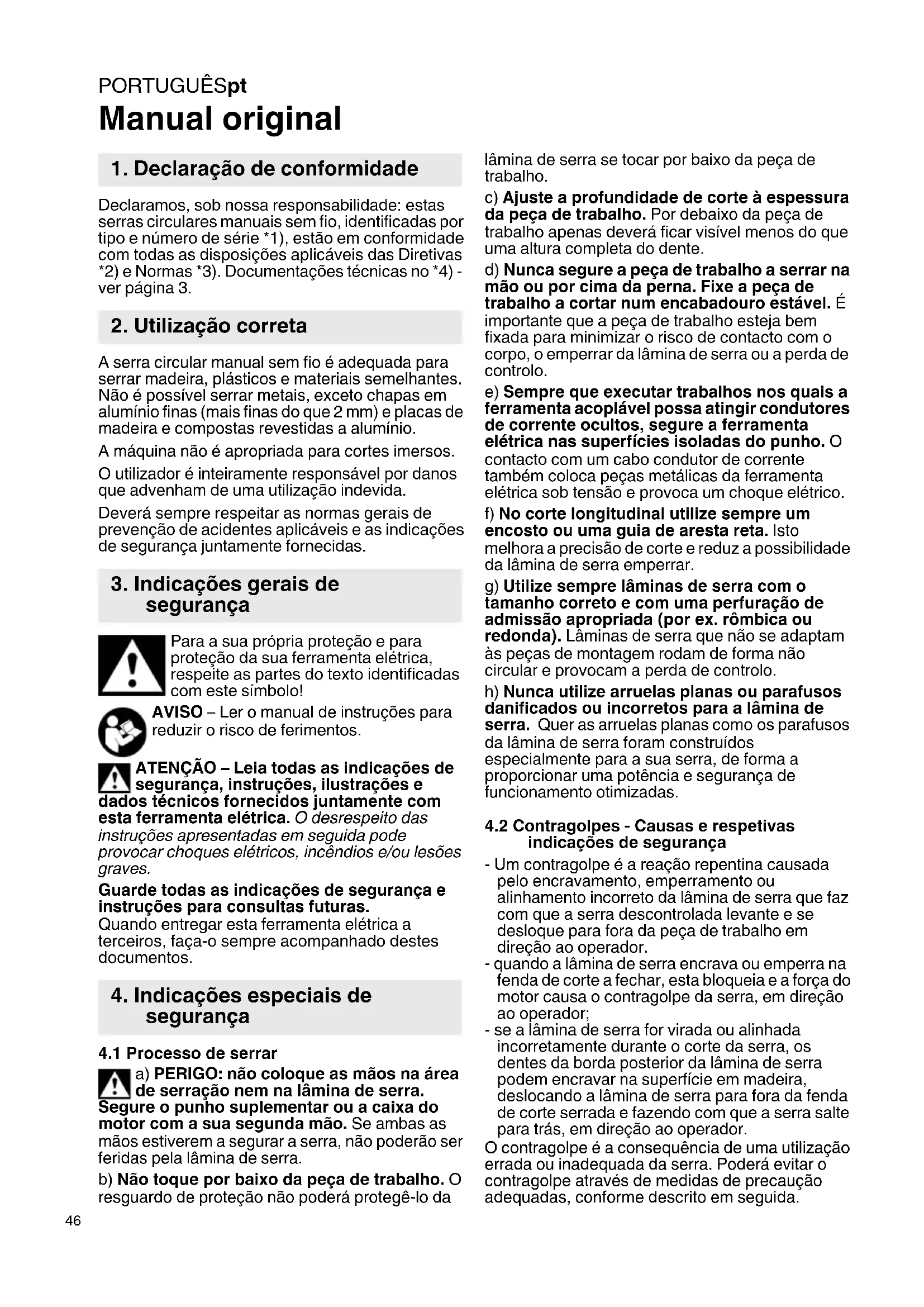 Manual original Declaramos, sob nossa responsabilidade: estas serras circulares manuais sem fio, identificadas por tipo e número de série *1), estão em conformidade com todas as disposições aplicáveis das Diretivas *2) e Normas *3). Documentações técnicas no *4) - ver página 3. A serra circular manual sem fio é adequada para serrar madeira, plásticos e materiais semelhantes. Não é possível serrar metais, exceto chapas em alumínio finas (mais finas do que 2 mm) e placas de madeira e compostas revestidas a alumínio. A máquina não é apropriada para cortes imersos. O utilizador é inteiramente responsável por danos que advenham de uma utilização indevida. Deverá sempre respeitar as normas gerais de prevenção de acidentes aplicáveis e as indicações de segurança juntamente fornecidas. Para a sua própria proteção e para proteção da sua ferramenta elétrica, respeite as partes do texto identificadas com este símbolo! AVISO – Ler o manual de instruções para reduzir o risco de ferimentos. ATENÇÃO – Leia todas as indicações de segurança, instruções, ilustrações e dados técnicos fornecidos juntamente com esta ferramenta elétrica. O desrespeito das instruções apresentadas em seguida pode provocar choques elétricos, incêndios e/ou lesões graves. Guarde todas as indicações de segurança e instruções para consultas futuras. Quando entregar esta ferramenta elétrica a terceiros, faça-o sempre acompanhado destes documentos.