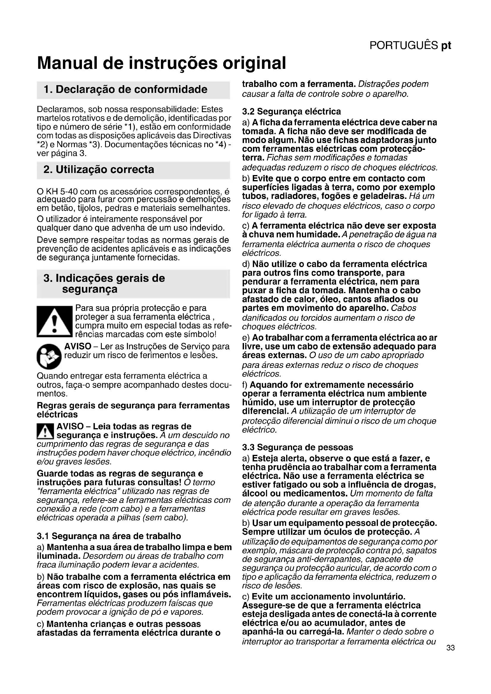 Manual de instruções original Declaramos, sob nossa responsabilidade: Estes martelos rotativos e de demolição, identificadas por tipo e número de série *1), estão em conformidade com todas as disposições aplicáveis das Directivas *2) e Normas *3). Documentações técnicas no *4) - ver página 3. O KH 5-40 com os acessórios correspondentes, é adequado para furar com percussão e demolições em betão, tijolos, pedras e materiais semelhantes. O utilizador é inteiramente responsável por qualquer dano que advenha de um uso indevido. Deve sempre respeitar todas as normas gerais de prevenção de acidentes aplicáveis e as indicações de segurança juntamente fornecidas. Para sua própria protecção e para proteger a sua ferramenta eléctrica , cumpra muito em especial todas as refe- rências marcadas com este símbolo! AVISO – Ler as Instruções de Serviço para reduzir um risco de ferimentos e lesões. Quando entregar esta ferramenta eléctrica a outros, faça-o sempre acompanhado destes docu- mentos. Regras gerais de segurança para ferramentas eléctricas AVISO – Leia todas as regras de segurança e instruções. A um descuido no cumprimento das regras de segurança e das instruções podem haver choque eléctrico, incêndio e/ou graves lesões. Guarde todas as regras de segurança e instruções para futuras consultas! O termo "ferramenta eléctrica" utilizado nas regras de segurança, refere-se a ferramentas eléctricas com conexão a rede (com cabo) e a ferramentas eléctricas operada a pilhas (sem cabo).