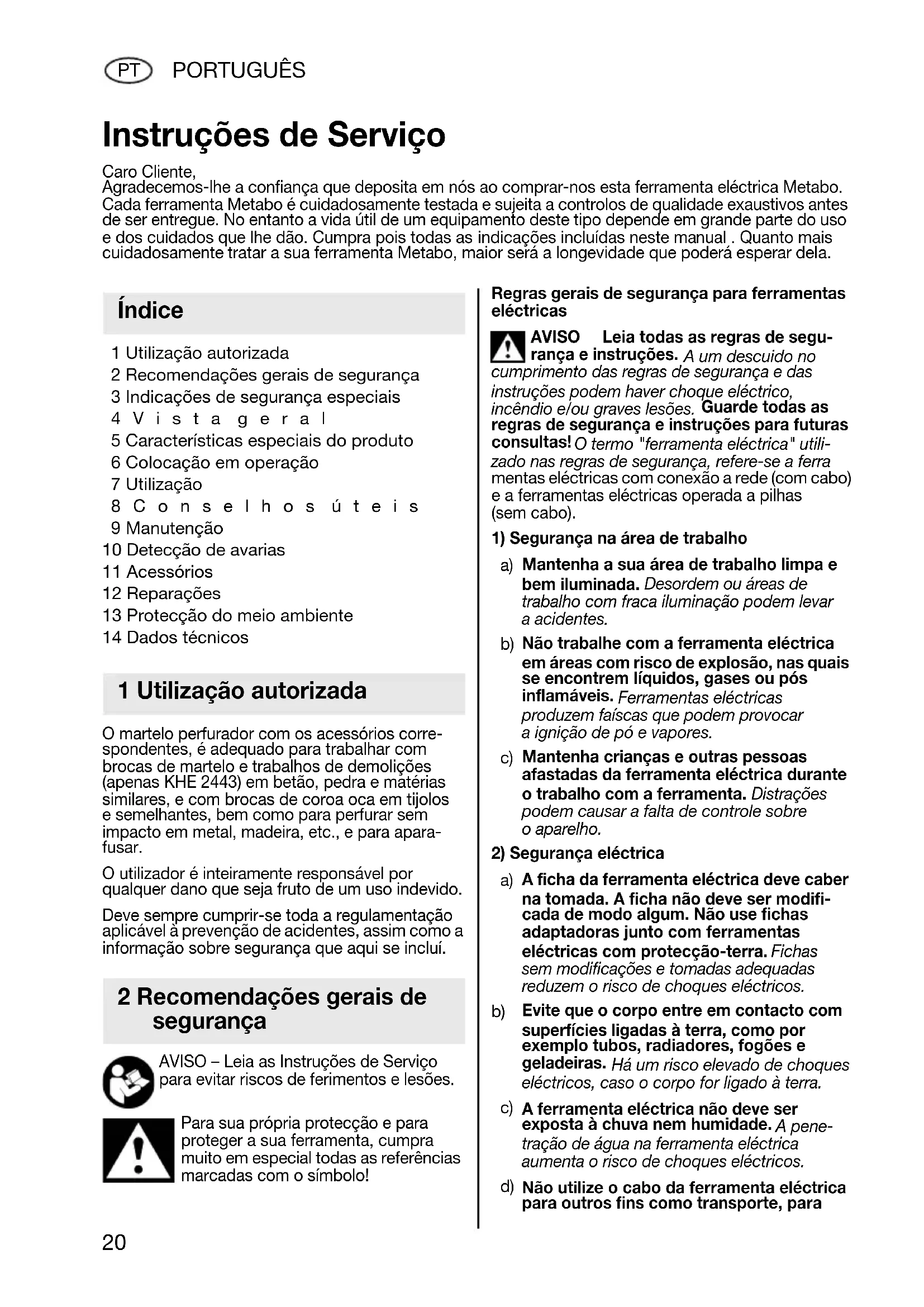 Não utilize o cabo da ferramenta eléctrica para outros fins como transporte, para Instruções de Serviço Caro Cliente, Agradecemos-lhe a confiança que deposita em nós ao comprar-nos esta ferramenta eléctrica Metabo. Cada ferramenta Metabo é cuidadosamente testada e sujeita a controlos de qualidade exaustivos antes de ser entregue. No entanto a vida útil de um equipamento deste tipo depende em grande parte do uso e dos cuidados que lhe dão. Cumpra pois todas as indicações incluídas neste manual . Quanto mais cuidadosamente tratar a sua ferramenta Metabo, maior será a longevidade que poderá esperar dela. Índice 1 Utilização autorizada 2 Recomendações gerais de segurança 17027073_0111 BHE 2243 KHE 2443 NAFTA.book Seite 20 Dienstag, 18. Januar 2011 11:03 11PORTUGUÊS