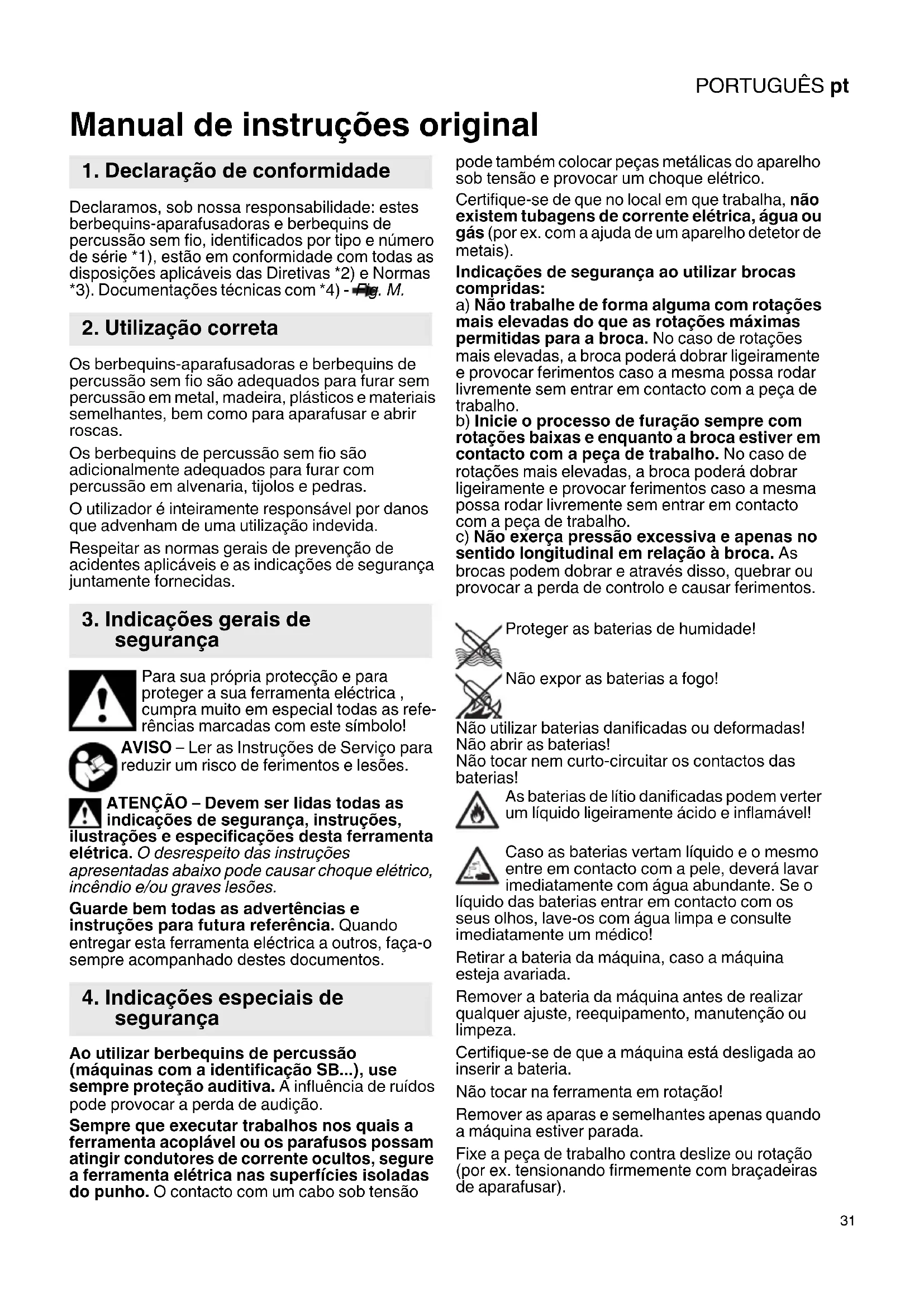 Declaramos, sob nossa responsabilidade: estes berbequins-aparafusadoras e berbequins de percussão sem fio, identificados por tipo e número de série *1), estão em conformidade com todas as disposições aplicáveis das Diretivas *2) e Normas *3). Documentações técnicas com *4) - Fig. M. Os berbequins-aparafusadoras e berbequins de percussão sem fio são adequados para furar sem percussão em metal, madeira, plásticos e materiais semelhantes, bem como para aparafusar e abrir roscas. Os berbequins de percussão sem fio são adicionalmente adequados para furar com percussão em alvenaria, tijolos e pedras. O utilizador é inteiramente responsável por danos que advenham de uma utilização indevida. Respeitar as normas gerais de prevenção de acidentes aplicáveis e as indicações de segurança juntamente fornecidas. Para sua própria protecção e para proteger a sua ferramenta eléctrica , cumpra muito em especial todas as refe- rências marcadas com este símbolo! AVISO – Ler as Instruções de Serviço para reduzir um risco de ferimentos e lesões. ATENÇÃO – Devem ser lidas todas as indicações de segurança, instruções, ilustrações e especificações desta ferramenta elétrica. O desrespeito das instruções apresentadas abaixo pode causar choque elétrico, incêndio e/ou graves lesões. Guarde bem todas as advertências e instruções para futura referência. Quando entregar esta ferramenta eléctrica a outros, faça-o sempre acompanhado destes documentos. Ao utilizar berbequins de percussão (máquinas com a identificação SB...), use sempre proteção auditiva. A influência de ruídos pode provocar a perda de audição. Sempre que executar trabalhos nos quais a ferramenta acoplável ou os parafusos possam atingir condutores de corrente ocultos, segure a ferramenta elétrica nas superfícies isoladas do punho. O contacto com um cabo sob tensão pode também colocar peças metálicas do aparelho sob tensão e provocar um choque elétrico. Certifique-se de que no local em que trabalha, não existem tubagens de corrente elétrica, água ou gás (por ex. com a ajuda de um aparelho detetor de metais). Indicações de segurança ao utilizar brocas compridas: a) Não trabalhe de forma alguma com rotações mais elevadas do que as rotações máximas permitidas para a broca. No caso de rotações mais elevadas, a broca poderá dobrar ligeiramente e provocar ferimentos caso a mesma possa rodar livremente sem entrar em contacto com a peça de trabalho. b) Inicie o processo de furação sempre com rotações baixas e enquanto a broca estiver em contacto com a peça de trabalho. No caso de rotações mais elevadas, a broca poderá dobrar ligeiramente e provocar ferimentos caso a mesma possa rodar livremente sem entrar em contacto com a peça de trabalho. c) Não exerça pressão excessiva e apenas no sentido longitudinal em relação à broca. As brocas podem dobrar e através disso, quebrar ou provocar a perda de controlo e causar ferimentos. Proteger as baterias de humidade! Não expor as baterias a fogo! Não utilizar baterias danificadas ou deformadas! Não abrir as baterias! Não tocar nem curto-circuitar os contactos das baterias! As baterias de lítio danificadas podem verter um líquido ligeiramente ácido e inflamável! Caso as baterias vertam líquido e o mesmo entre em contacto com a pele, deverá lavar imediatamente com água abundante. Se o líquido das baterias entrar em contacto com os seus olhos, lave-os com água limpa e consulte imediatamente um médico! Retirar a bateria da máquina, caso a máquina esteja avariada. Remover a bateria da máquina antes de realizar qualquer ajuste, reequipamento, manutenção ou limpeza. Certifique-se de que a máquina está desligada ao inserir a bateria. Não tocar na ferramenta em rotação! Remover as aparas e semelhantes apenas quando a máquina estiver parada. Fixe a peça de trabalho contra deslize ou rotação (por ex. tensionando firmemente com braçadeiras de aparafusar). Manual de instruções original