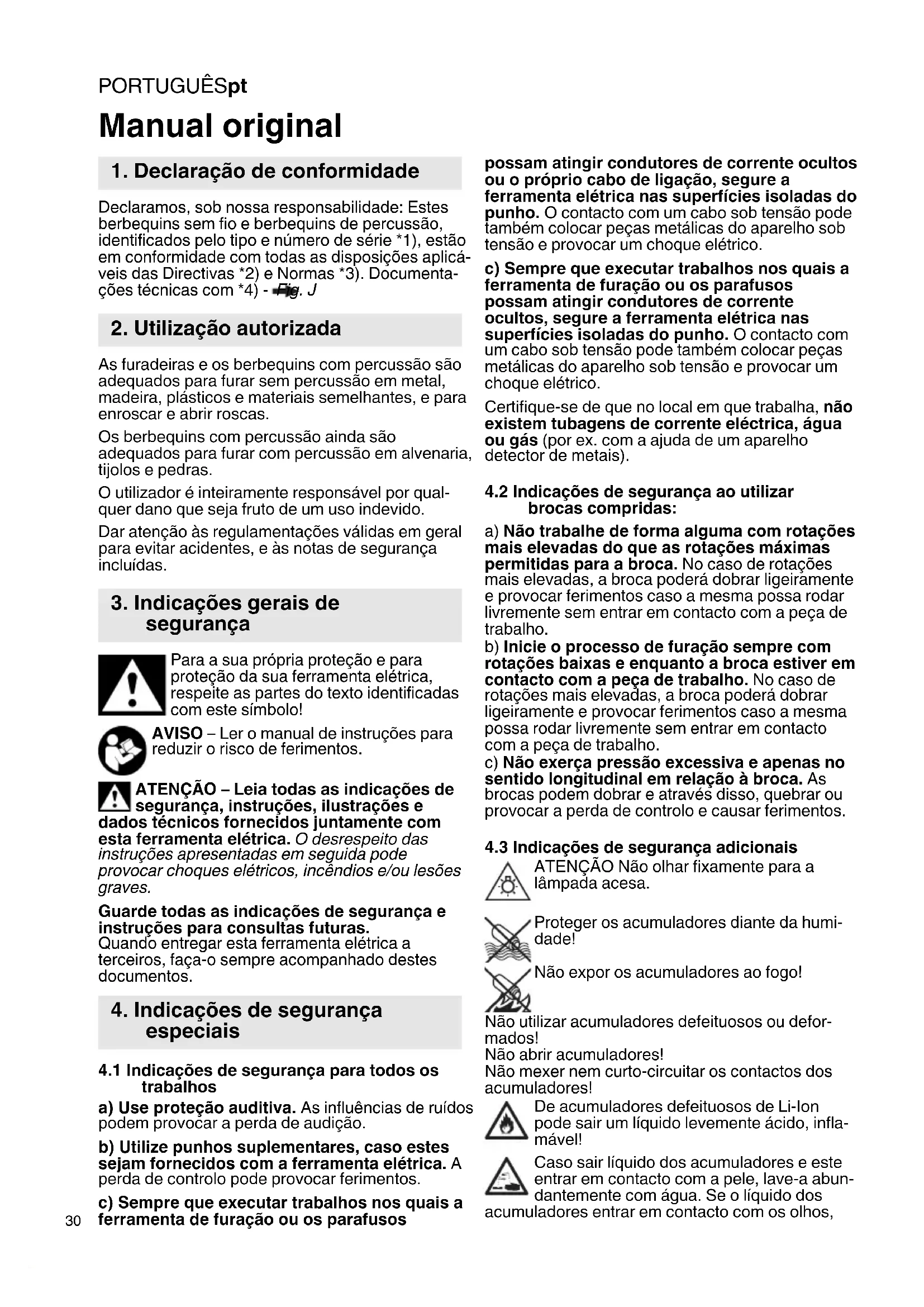 Declaramos, sob nossa responsabilidade: Estes berbequins sem fio e berbequins de percussão, identificados pelo tipo e número de série *1), estão em conformidade com todas as disposições aplicá- veis das Directivas *2) e Normas *3). Documenta- ções técnicas com *4) - Fig. J As furadeiras e os berbequins com percussão são adequados para furar sem percussão em metal, madeira, plásticos e materiais semelhantes, e para enroscar e abrir roscas. Os berbequins com percussão ainda são adequados para furar com percussão em alvenaria, tijolos e pedras. O utilizador é inteiramente responsável por qual- quer dano que seja fruto de um uso indevido. Dar atenção às regulamentações válidas em geral para evitar acidentes, e às notas de segurança incluídas. Para a sua própria proteção e para proteção da sua ferramenta elétrica, respeite as partes do texto identificadas com este símbolo! AVISO – Ler o manual de instruções para reduzir o risco de ferimentos. ATENÇÃO – Leia todas as indicações de segurança, instruções, ilustrações e dados técnicos fornecidos juntamente com esta ferramenta elétrica. O desrespeito das instruções apresentadas em seguida pode provocar choques elétricos, incêndios e/ou lesões graves. Guarde todas as indicações de segurança e instruções para consultas futuras. Quando entregar esta ferramenta elétrica a terceiros, faça-o sempre acompanhado destes documentos.