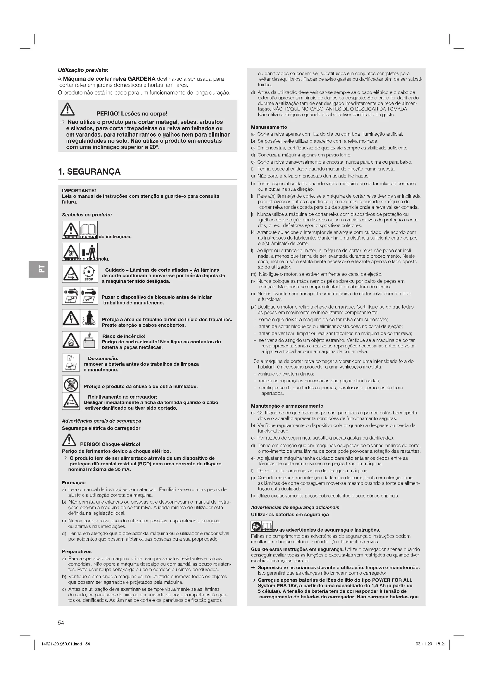 Utilização prevista: A Máquina de cortar relva GARDENA destina-se a ser usada para cortar relva em jardins domésticos e hortas familiares. O produto não está indicado para um funcionamento de longa duração. PERIGO! Lesões no corpo! v Não utilize o produto para cortar matagal, sebes, arbustos esilvados, para cortar trepadeiras ou relva em telhados ou emvarandas, para retalhar ramos e galhos nem para eliminar irregularidades no solo. Não utilize o produto em encostas com uma inclinação superior a 20°. IMPORTANTE! Leia o manual de instruções com atenção e guarde-o para consulta futura. Símbolos no produto: Leia o manual de instruções. Manter a distância. Cuidado – Lâminas de corte afiadas – As lâminas de corte continuam a mover-se por inércia depois de amáquina ter sido desligada. Puxar o dispositivo de bloqueio antes de iniciar trabalhos de manutenção. Proteja a área de trabalho antes do início dos trabalhos. Preste atenção a cabos encobertos. Risco de incêndio! Perigo de curto-circuito! Não ligue os contactos da bateria a peças metálicas. Desconexão: remover a bateria antes dos trabalhos de limpeza e manutenção. Proteja o produto da chuva e de outra humidade. Relativamente ao carregador: Desligar imediatamente a ficha da tomada quando o cabo estiver danificado ou tiver sido cortado. Advertências gerais de segurança Segurança elétrica do carregador PERIGO! Choque elétrico! Perigo de ferimentos devido a choque elétrico. v O produto tem de ser alimentado através de um dispositivo de proteção diferencial residual (RCD) com uma corrente de disparo nominal máxima de 30 mA. Formação a) Leia o manual de instruções com atenção. Familiari ze-se com as peças de ajuste e a utilização correta da máquina. b) Não permita que crianças ou pessoas que desconheçam o manual de instru- ções operem a máquina de cortar relva. A idade mínima do utilizador está definida na legislação local. c) Nunca corte a relva quando estiverem pessoas, especialmente crianças, ou animais nas imediações. d) Tenha em atenção que o operador da máquina ou o utilizador é responsável por acidentes que possam afetar outras pessoas ou a sua propriedade. Preparativos a) Para a operação da máquina utilizar sempre sapatos resistentes e calças compridas. Não opere a máquina descalço ou com sandálias pouco resisten- tes. Evite usar roupa solta/larga ou com cordões ou cintos pendurados. b) Verifique a área onde a máquina vai ser utilizada e remova todos os objetos que possam ser agarrados e projetados pela máquina. c) Antes da utilização deve examinar-se sempre visualmente se as lâminas decorte, os parafusos de fixação e a unidade de corte completa estão gas- tos ou danificados. As lâminas de corte e os parafusos de fixação gastos