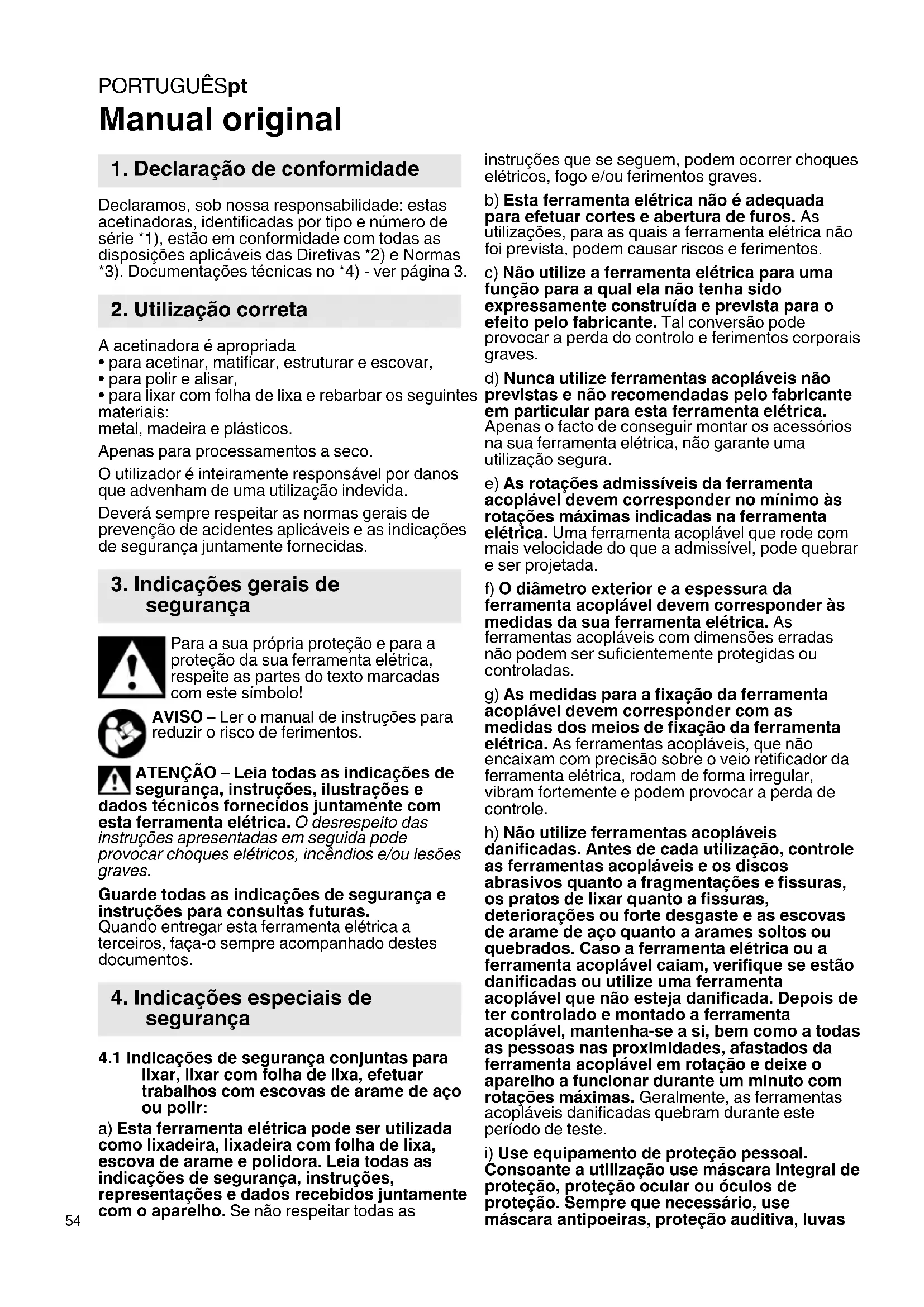 - para lixar com folha de lixa e rebarbar os seguintes materiais: metal, madeira e plásticos. Apenas para processamentos a seco. O utilizador é inteiramente responsável por danos que advenham de uma utilização indevida. Deverá sempre respeitar as normas gerais de prevenção de acidentes aplicáveis e as indicações de segurança juntamente fornecidas. Para a sua própria proteção e para a proteção da sua ferramenta elétrica, respeite as partes do texto marcadas com este símbolo! AVISO – Ler o manual de instruções para reduzir o risco de ferimentos. ATENÇÃO – Leia todas as indicações de segurança, instruções, ilustrações e dados técnicos fornecidos juntamente com esta ferramenta elétrica. O desrespeito das instruções apresentadas em seguida pode provocar choques elétricos, incêndios e/ou lesões graves. Guarde todas as indicações de segurança e instruções para consultas futuras. Quando entregar esta ferramenta elétrica a terceiros, faça-o sempre acompanhado destes documentos.