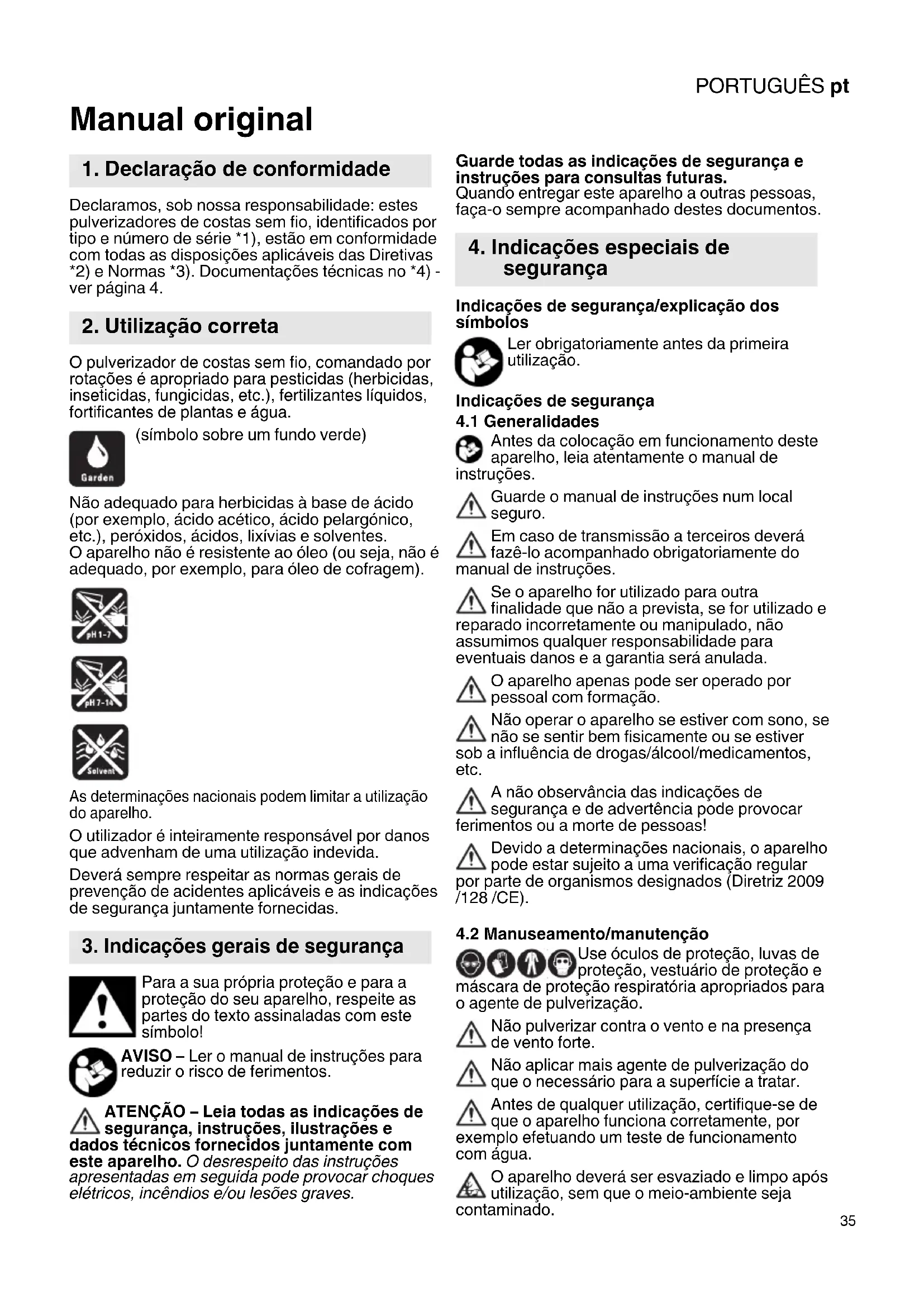 Manual original Declaramos, sob nossa responsabilidade: estes pulverizadores de costas sem fio, identificados por tipo e número de série *1), estão em conformidade com todas as disposições aplicáveis das Diretivas *2) e Normas *3). Documentações técnicas no *4) - ver página 4. O pulverizador de costas sem fio, comandado por rotações é apropriado para pesticidas (herbicidas, inseticidas, fungicidas, etc.), fertilizantes líquidos, fortificantes de plantas e água. (símbolo sobre um fundo verde) Não adequado para herbicidas à base de ácido (por exemplo, ácido acético, ácido pelargónico, etc.), peróxidos, ácidos, lixívias e solventes. O aparelho não é resistente ao óleo (ou seja, não é adequado, por exemplo, para óleo de cofragem). As determinações nacionais podem limitar a utilização do aparelho. O utilizador é inteiramente responsável por danos que advenham de uma utilização indevida. Deverá sempre respeitar as normas gerais de prevenção de acidentes aplicáveis e as indicações de segurança juntamente fornecidas. Para a sua própria proteção e para a proteção do seu aparelho, respeite as partes do texto assinaladas com este símbolo! AVISO – Ler o manual de instruções para reduzir o risco de ferimentos. ATENÇÃO – Leia todas as indicações de segurança, instruções, ilustrações e dados técnicos fornecidos juntamente com este aparelho. O desrespeito das instruções apresentadas em seguida pode provocar choques elétricos, incêndios e/ou lesões graves. Guarde todas as indicações de segurança e instruções para consultas futuras. Quando entregar este aparelho a outras pessoas, faça-o sempre acompanhado destes documentos. Indicações de segurança/explicação dos símbolos Ler obrigatoriamente antes da primeira utilização. Indicações de segurança