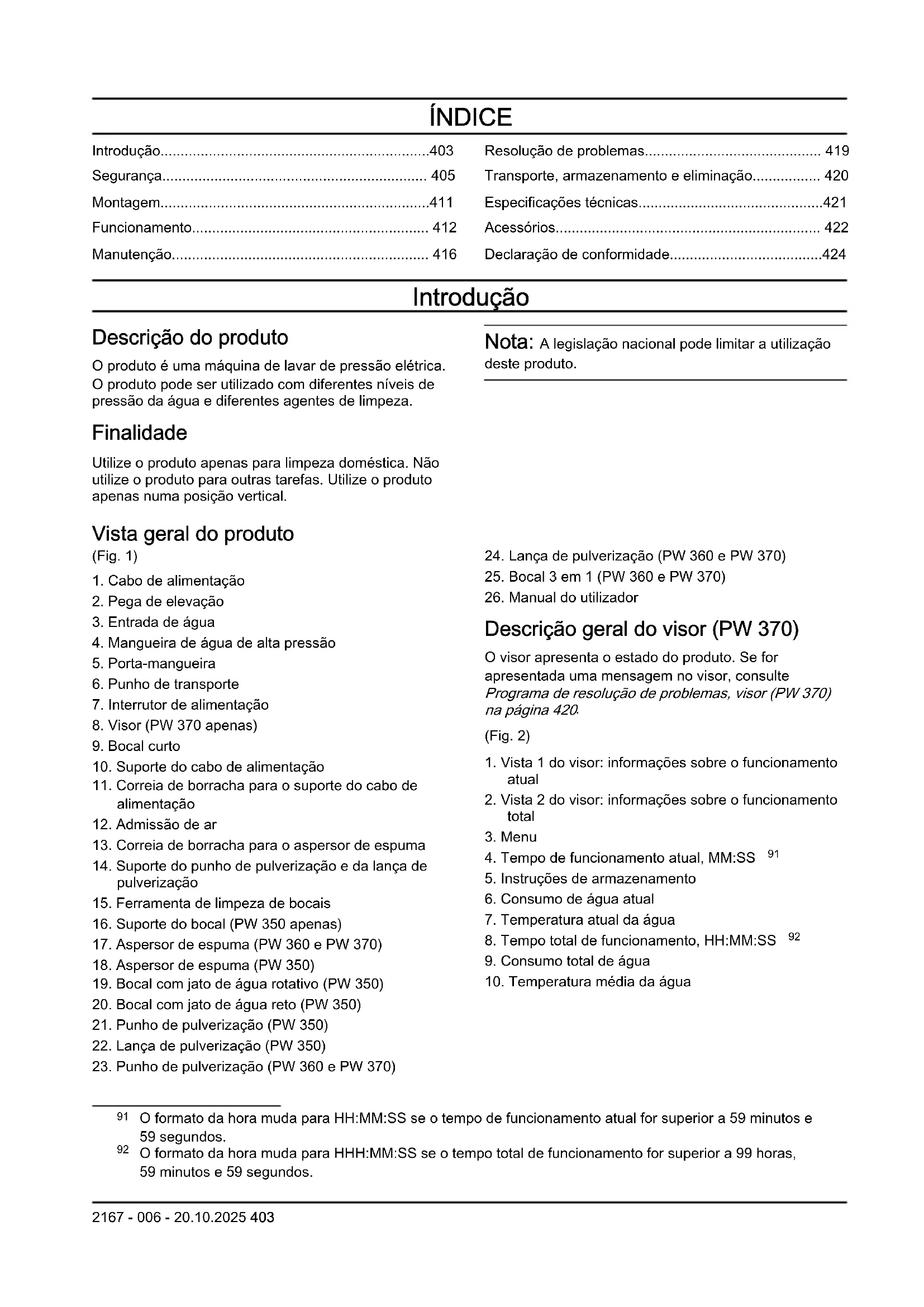 O formato da hora muda para HHH:MM:SS se o tempo total de funcionamento for superior a 99horas, 59minutos e 59segundos. 2167 - 006 - 20.10.2025 403Símbolos no produto (Fig. 3) AVISO: Este produto pode ser perigoso e provocar ferimentos graves ou a morte do utilizador ou de terceiros. Tenha cuidado e utilize o produto corretamente. (Fig. 4) Leia o manual do utilizador com atenção e certifique-se de que compreende as instruções antes de utilizar este produto. (Fig. 5) O produto não é adequado para ligação à conduta de água potável. (Fig. 6) Os jatos de água de alta pressão podem ser perigosos se forem alvo de utilização incorreta. O jato não deve ser dirigido a pessoas, a equipamento elétrico ou ao produto. (Fig. 7) Marca ambiental. O produto ou a respetiva embalagem não são resíduos domésticos. Recicle-os numa localização de eliminação aprovada para equipamentos elétricos e eletrónicos. (Fig. 8) Ferramenta de classe II. (Fig. 9) Emissão de ruído para a etiqueta ambiental de acordo com as diretivas e regulamentos da União Europeia e do Reino Unido e o regulamento "Protection of the Environment Operations (Noise Control) Regulations 2017" (regulamentos de proteção de operações no meio ambiente [controlo do ruído] de 2017) da Nova Gales do Sul. O nível de potência sonora garantido do produto está especificado em Especificações técnicas na página 421 e na etiqueta. (Fig. 10) Proteção contra fluxo de água de baixa pressão a partir de qualquer ângulo. (Fig. 11) Manter afastado do gelo. 404 2167 - 006 - 20.10.2025(Fig. 12) O produto está em conformidade com as diretivas CE aplicáveis. Nota: Os restantes símbolos/autocolantes existentes no produto dizem respeito às exigências de homologação de alguns países. Danos no produto Não somos responsáveis por danos no nosso produto se: